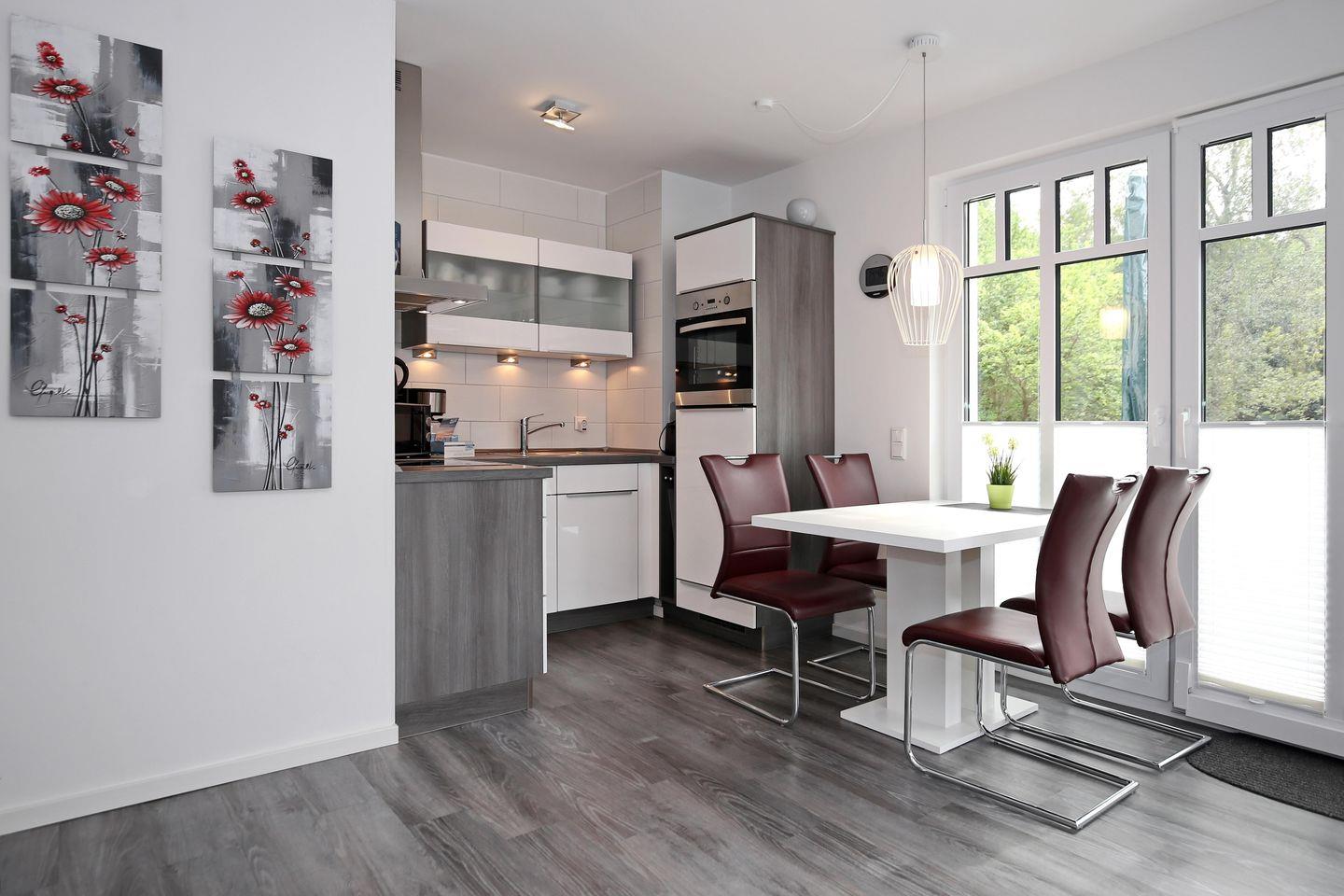 Die moderne, in den Wohnbereich integrierte, Küche ist komplett ausgestattet. Zur Kücheneinrichtung gehören hochwertige Geräte, wie das Cerankochfeld mit 4 Kochzonen, der Geschirrspüler, der Kühlschrank mit Gefrierfach und ein Backofen in Sichthöhe. Eine Mikrowelle, ein Toaster, ein Wasserkocher und eine Filter-Kaffeemaschine vervollständigen die Einrichtung. Im angrenzenden Essbereich bietet Ihnen ein Tisch mit 3 Stühlen viel Platz für gemeinsame Mahlzeiten.