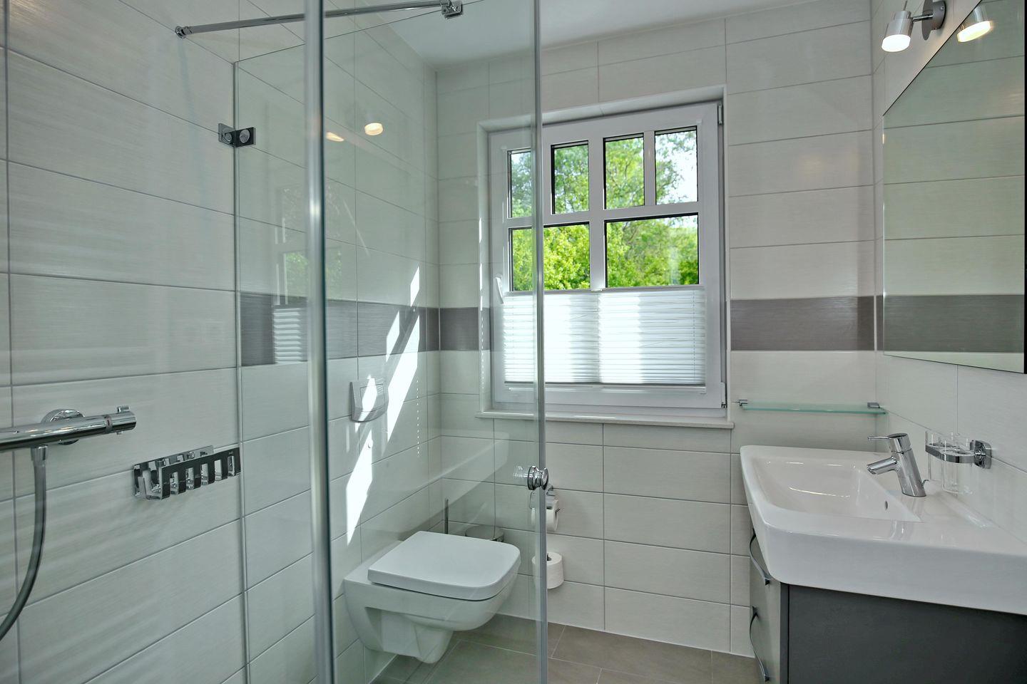 Über den Flurbereich - versehen mit einem großen Spiegel und der Flurgarderobe - gelangen Sie in das moderne Tageslichtbad mit einer ebenerdigen Dusche. Auf den zwei neben dem Waschbecken angebrachten Glasablagen können kleinere Utensilien abgelagert werden. Der Waschtischunterschrank enthält einen Fön und bietet ausreichend Platz für Ihre privaten Artikel. Zum Aufhängen großer Badetücher können Sie die Haken an der Außenseite der Glasduschwand genutzt werden, für nasse Badesachen die ausziehbare Leine in der Dusche.