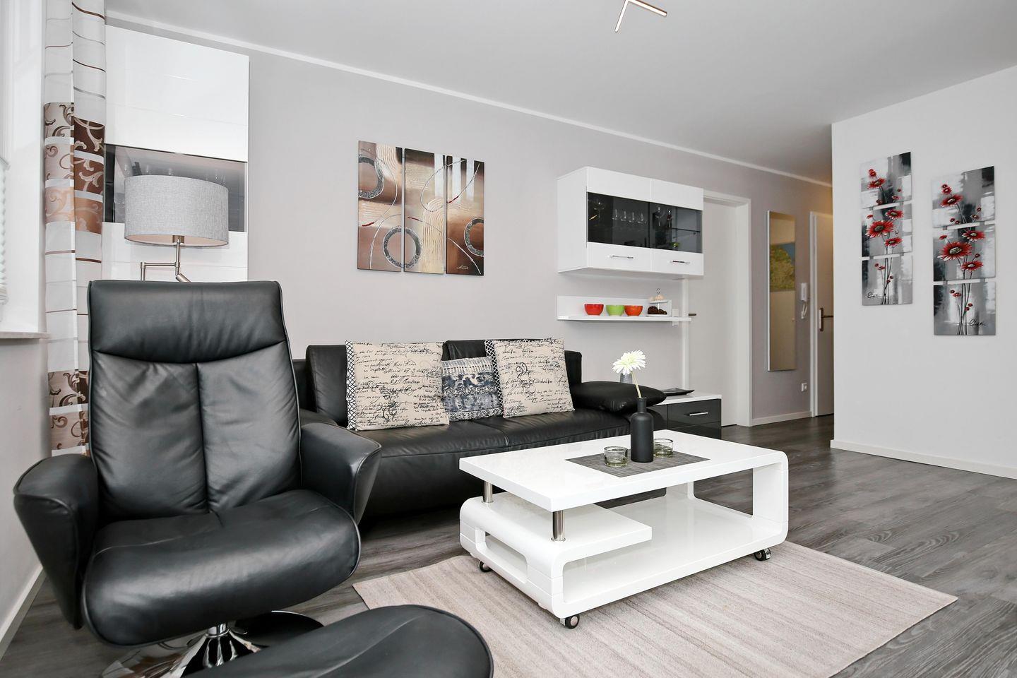 In dem großzügig gestalteten Wohnbereich laden Sie eine moderne Echtledercouch, ein Echtleder-Relaxsessel mit Hocker sowie ein Couchtisch zu gemütlichen Stunden vor dem 55“ Flatscreen-TV ein. Zur weiteren Unterhaltung dienen Ihnen ein Blu-Ray-Player und eine Audioanlage mit Bluetooth-Schnittstelle. Der WLAN-Zugang des Hauses steht Ihnen kostenlos zur Verfügung