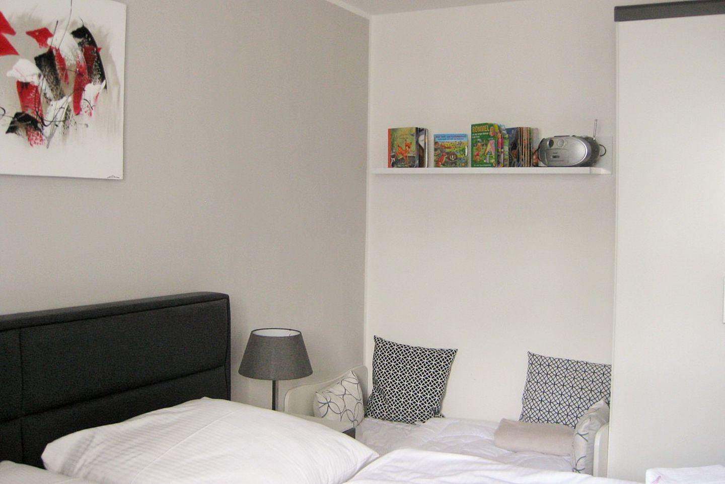 Im Schlafzimmer versprechen ein komfortables Boxspringbett (180 x 200 cm) und ein Flachbild-TV erholsame Stunden. Die Couch im Wohnbereich bietet weiterhin einem bequemen Schlafplatz (150 x 210 cm). Ist die 3. Person ein Kleinkind bis ca. 6 Jahre, kann auch das feststehende Kinderbett (Länge 1,40m) im Schlafzimmer genutzt werden, ebenso ein Radio mit CD-Player. Die zwei Nachttische und der große Kleiderschrank bieten viel Stauraum.