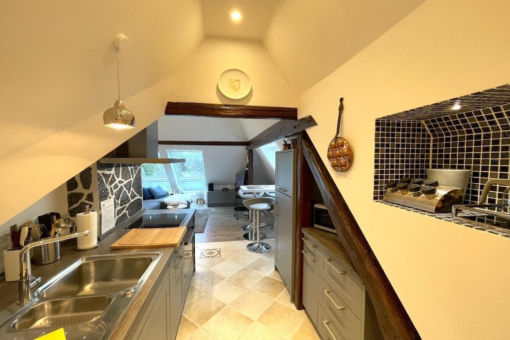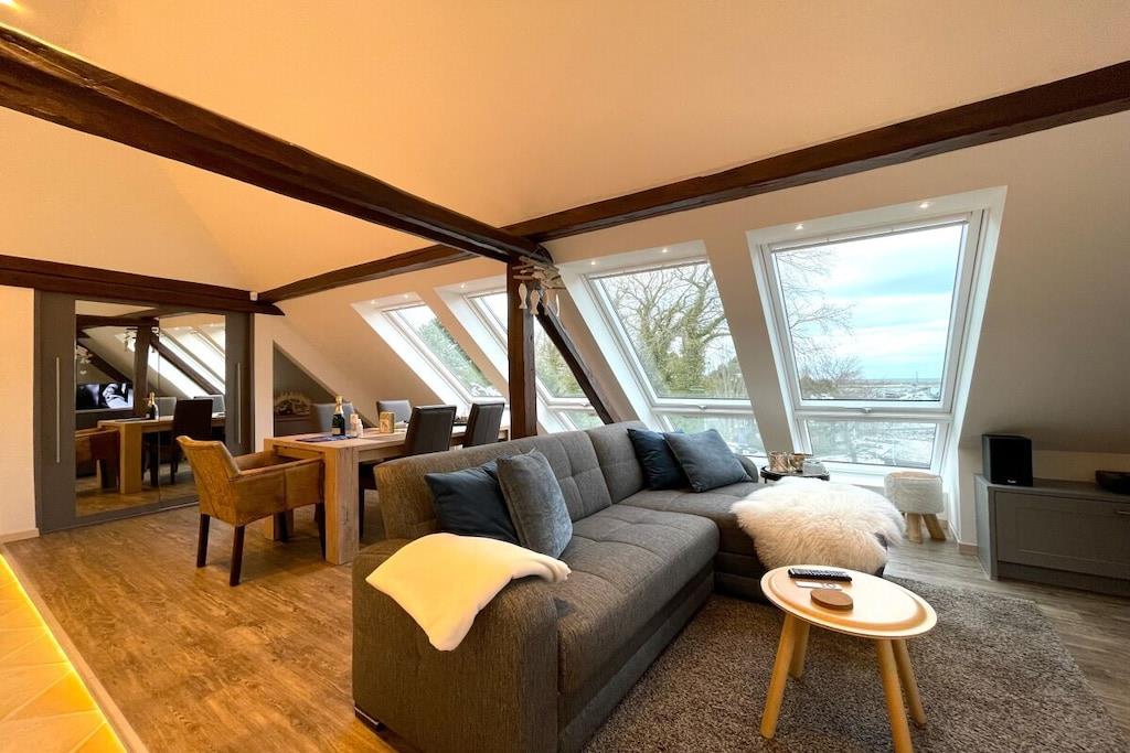 Nyt de stilige møblene til ferieleiligheten Strandgut, som ligger i toppetasjen i vår renoverte Villa Strandgut, som dekker ca. 49 m². Den åpne stue- og spisestuen har en dreibar 42-tommers LED-TV, Apple TV og en koselig sofa. Det luksuriøse kjøkkenet er velutstyrt, og du kan spise ved et ekte eikebord mens du nyter utsikten over Østersjøen gjennom fem store Velux-vinduer. Leiligheten inkluderer også et høykvalitets musikkanlegg fra Teufel og en samling brettspill. Begge badene har førsteklasses Villeroy & Boch-armaturer, supplert med elegante mosaikker. Rainshower-systemet fra Grohe og innebygde høyttalere med Bluetooth sørger for en avslappende dusjopplevelse. Hvert av de to soverommene har en TV, takvinduer med elektriske persienner og en lekematte for barn. Gå utenfor til en nylig asfaltert, overbygd terrasse med sitteplasser, varmeovner, en strandstol, solsenger og en grill, alt vendt mot sørvest for ettermiddags- og kveldssol. Strømuttak er tilgjengelig for enkelhets skyld. En parkeringsplass er inkludert på eiendommen foran villaen. Nyt oppholdet ditt!