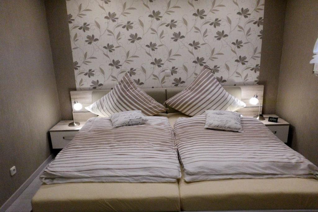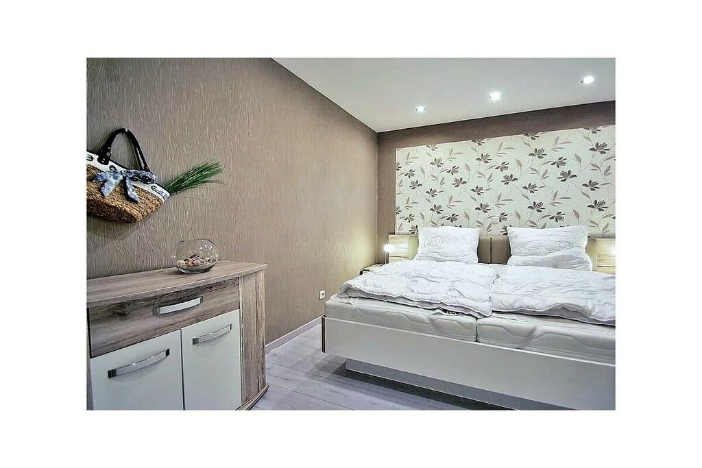 Unsere komplett sanierte und völlig neu ausgestattete Ferienwohnung wird Ihr Urlaubswohlgefühl vom ersten Tag an steigern.. Unsere Wohnung - mit Balkon - befindet sich in der 4. Etage mit Blick in den parkähnlichen Garten und auf Binnensee und Ostsee. Sie wurde komplett neu möbliert, ausgestattet mit neuem Fenster, Balkontür, Küche, hochwertigen Fliesen und Laminatböden, Einbaustrahler in LED- Technik. Unsere Ferienwohnung verfügt über ein Wohnzimmer mit integriertem Essbereich, von wo aus Sie bereits einen sehr schönen Ausblick haben. Eckcouch mit Ottomane - Federkern, Esstisch mit 4 Stühlen, LED Fernseher, CD- Anlage DVD- Player. Die angeschlossene, halb offene Küche beinhaltet: Spülmaschine, Backofen mit Umluft, Ceranfeld, großer Kühlschrank mit Gefrierfach, Mikrowelle sowie eine Dunstabzugshaube mit Abluft. Kaffeemaschine, Eierkocher, Toaster, Wasserkocher, Gewürzschrank etc. Geschirr und Besteck ist für 6 Personen vorhanden. Das Elternschlafzimmer ist mittels einer festen Wand mit Fenster zum öffnen, vom Wohnbereich abgetrennt, durch eine Tür vom Flur aus zu erreichen. Das Doppelbett hat 2 hochwertige Taschenfederkern Einzelmatratzen von 90 x 200 cm, mit verstellbaren Lattenrosten, sowie eine Kommode und Ganzkörperspiegel. Das Kinderzimmer grenzt an die Küche an, und kann mit einer Tür verschlossen werden.Ein separater Heizkörper sorgt auch hier für ausreichend Wärme. Die Wände sind nach außen gedämmt. Ein großes Fenster zum Balkon versorgt dieses Zimmer mit ausreichend Tageslicht und frischer Luft. Ein sehr stabiles Etagenbett mit genügend Zwischenraumhöhe. Die beiden hochwertigen Matratzen sind jeweils 90 x 200 cm groß. Pro Bett eine Nachtlampe. Daneben eine Ablagefläche mit einer kleinen Stereo- Kompaktanlage. Das Bad mit grauen Schieferboden ist mit der neuesten Technik ausgestattet, Duschkabine, Handtuchwärmer, Spiegelschrank, Fön. Im Flur befindet sich ein großer Wandschrank, ein Schrank für Reinigungsutensilien sowie die Garderobe. Der Balkon ist möbliertW- LAN steht meinen Gästen kostenlos zur Verfügung