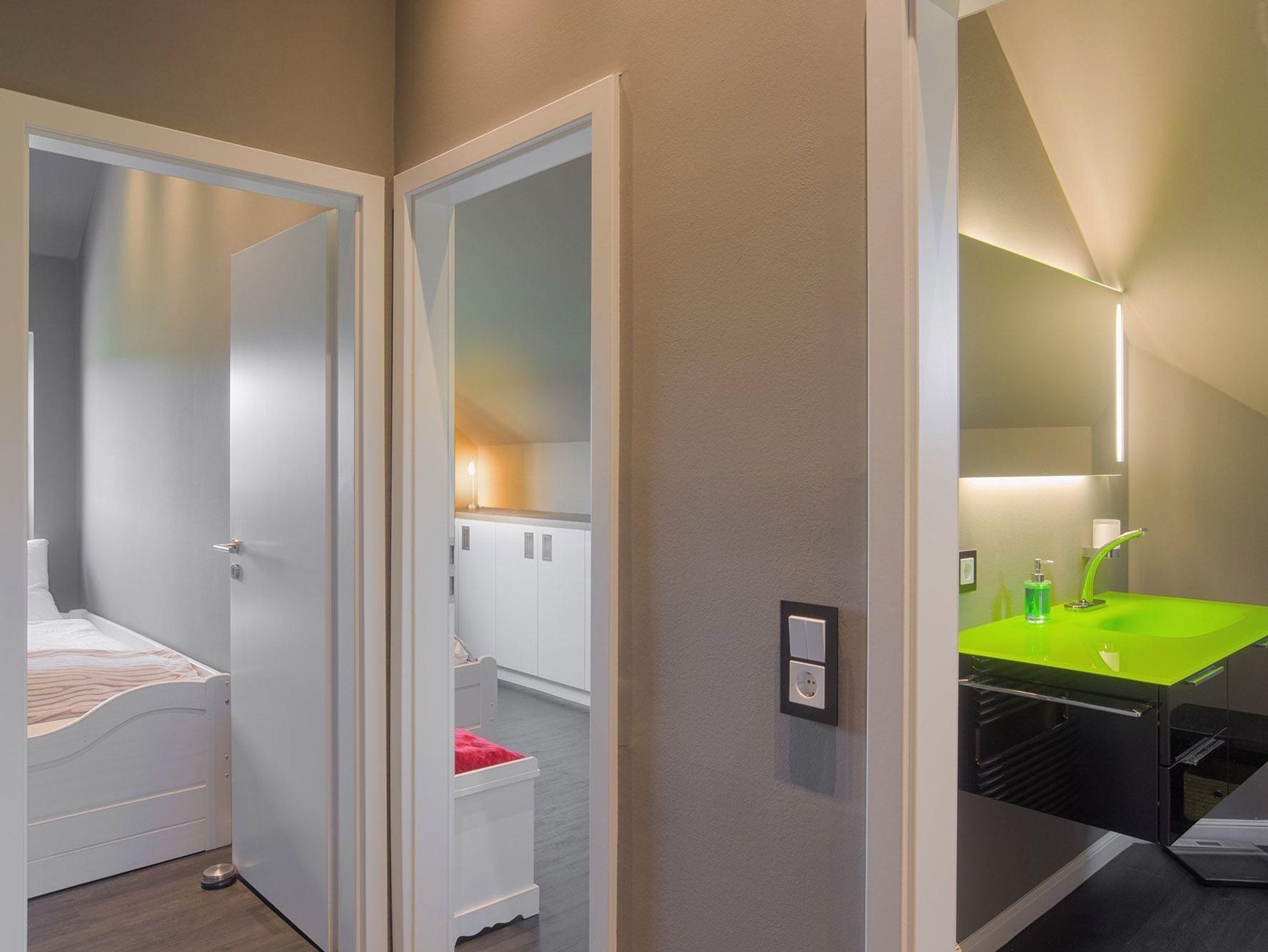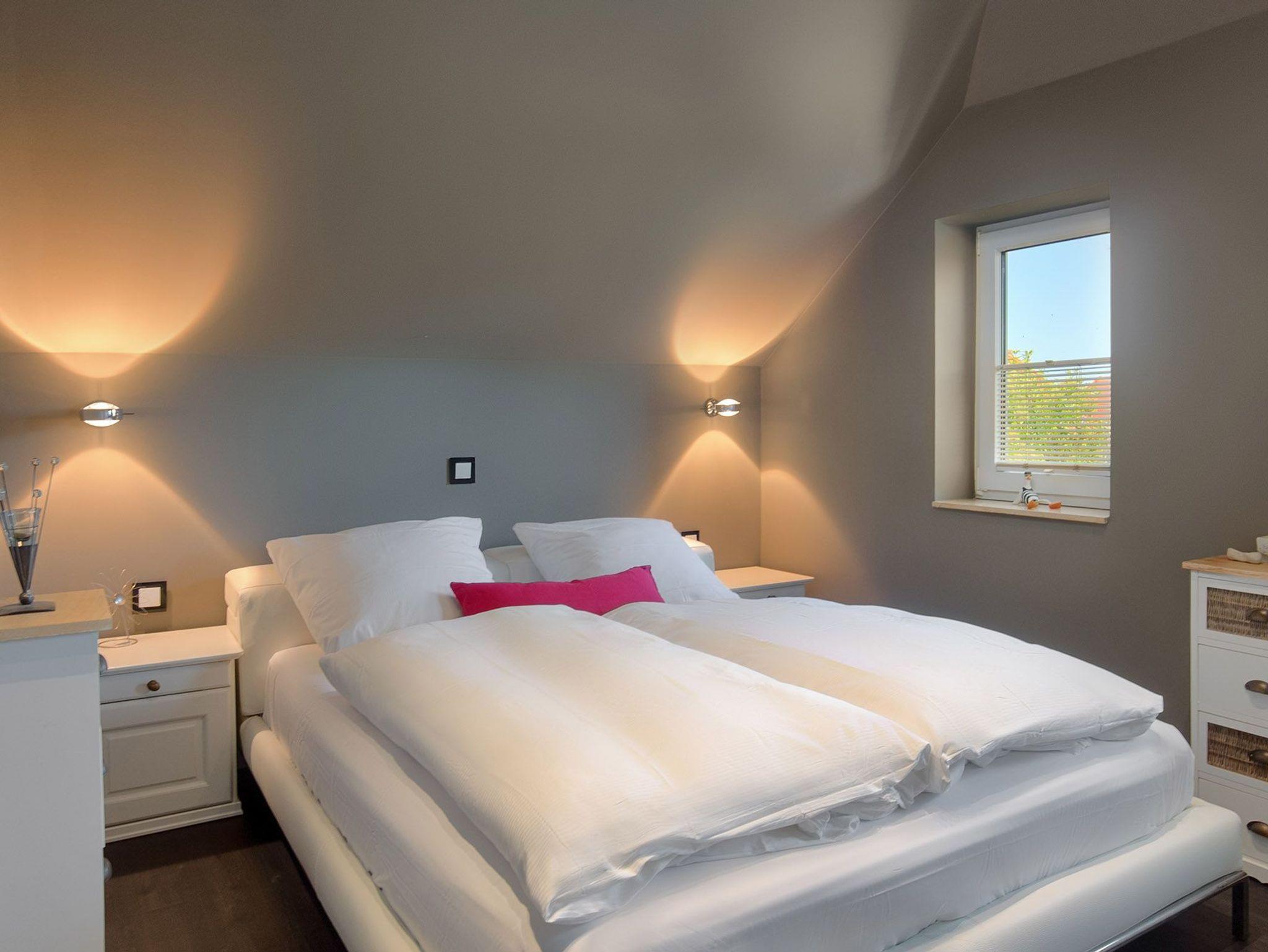 Ebenso komfortabel geht es in den drei Schlafzimmern der Unterkunft im 1. Obergeschoss weiter. Hier wartet ein einladendes Doppelbett (180x200), sowie in den kleineren Schlafzimmern (mit TV) jeweils Einzelbetten (90x200), eines davon mit Ausziehfunktion, z.B. als zusätzliches Kinderbett. Große Kleider- oder Einbauschränke bieten ausreichend Stauraum. Für Verdunklung sorgen Jalousien.