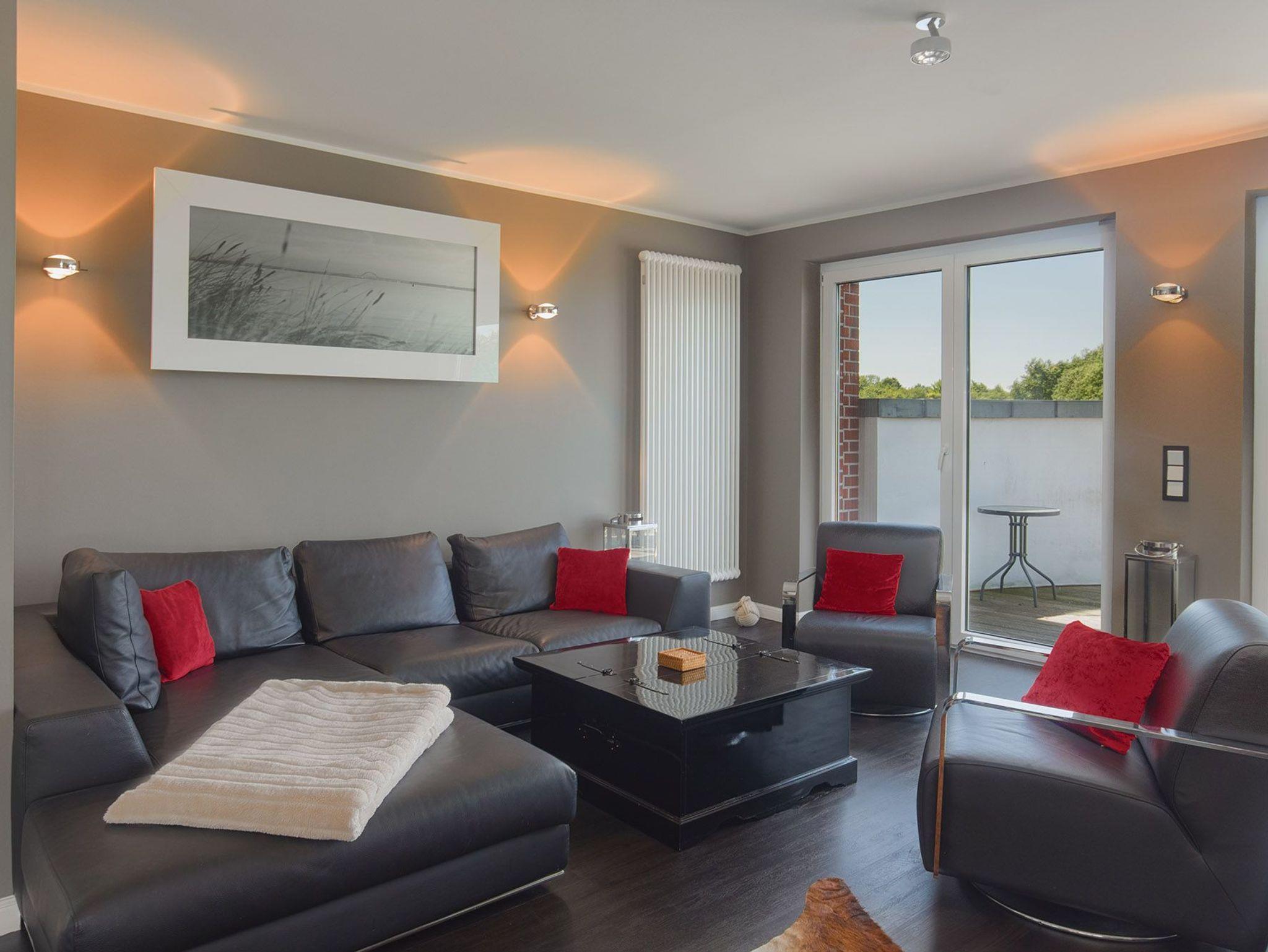 Herzstück der Unterkunft ist der lichtdurchflutete und einladende Wohn- und Essbereich. Hier kann auf der gemütlichen Couch entspannt werden oder Sie genießen gesellige Stunden am Esstisch. TV, Soundanlage und WLAN sind selbstverständlich. Ein Kaminofen (ohne Brennmaterial) trägt an kälteren Tagen zur wohligen Gemütlichkeit bei. Die Farbgebung und ausgewählte Dekorationen sorgen für ein wunderbar wohnliches Gefühl. Durch die großen, z.T. bodentiefen Fenster haben Sie immer einen schönen Blick. Für Sichtschutz sorgen Jalousien (z.T. elektrisch).