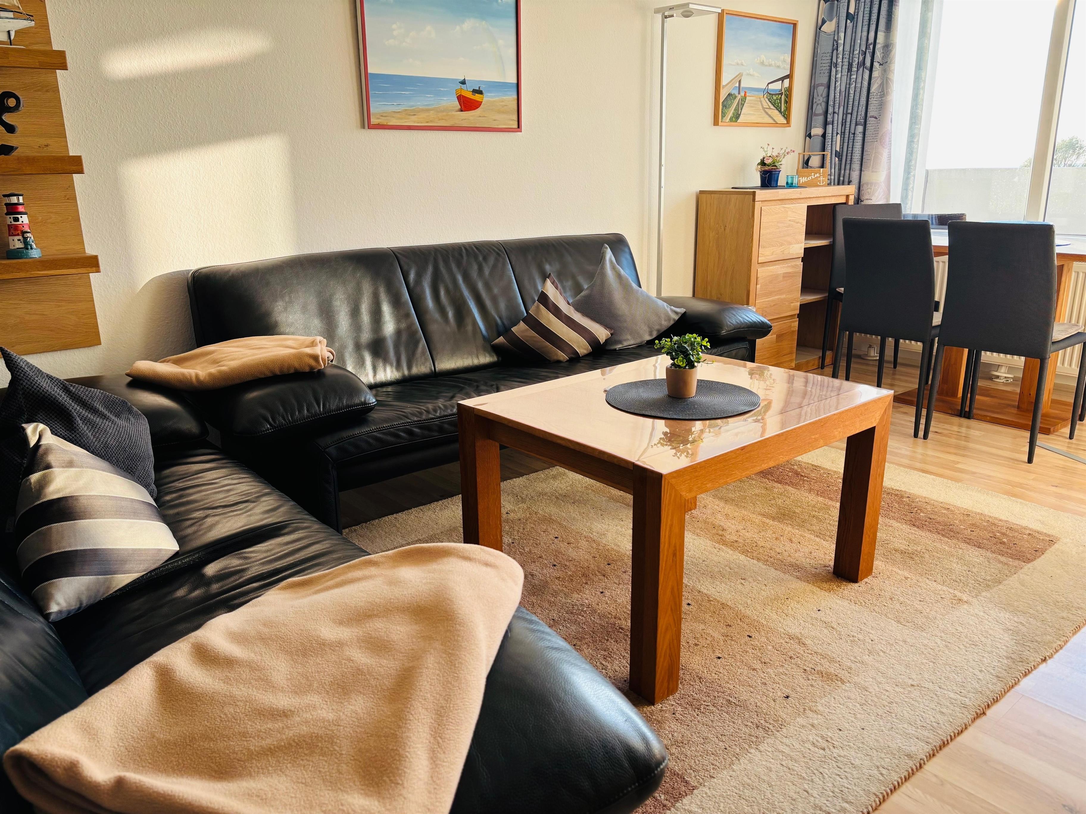 Die gemütliche Nichtraucher-Ferienwohnung verfügt über einen Balkon. Das Wohnzimmer, mit Balkon zur Seeseite, ist mit einer Sitzgarnitur, einem separaten Essplatz und SAT-TV ausgestattet. Das Wohn-Schlafzimmer ist mit einem Doppelbett versehen und im extra Kinderzimmer befindet sich ein Etagenbett. Die Küche ist vollständig ausgestattet, inklusive eines 4-Platten-Cerankochfelds, Backofen, Kaffeemaschine, Wasserkocher und weiteren Kleingeräten.