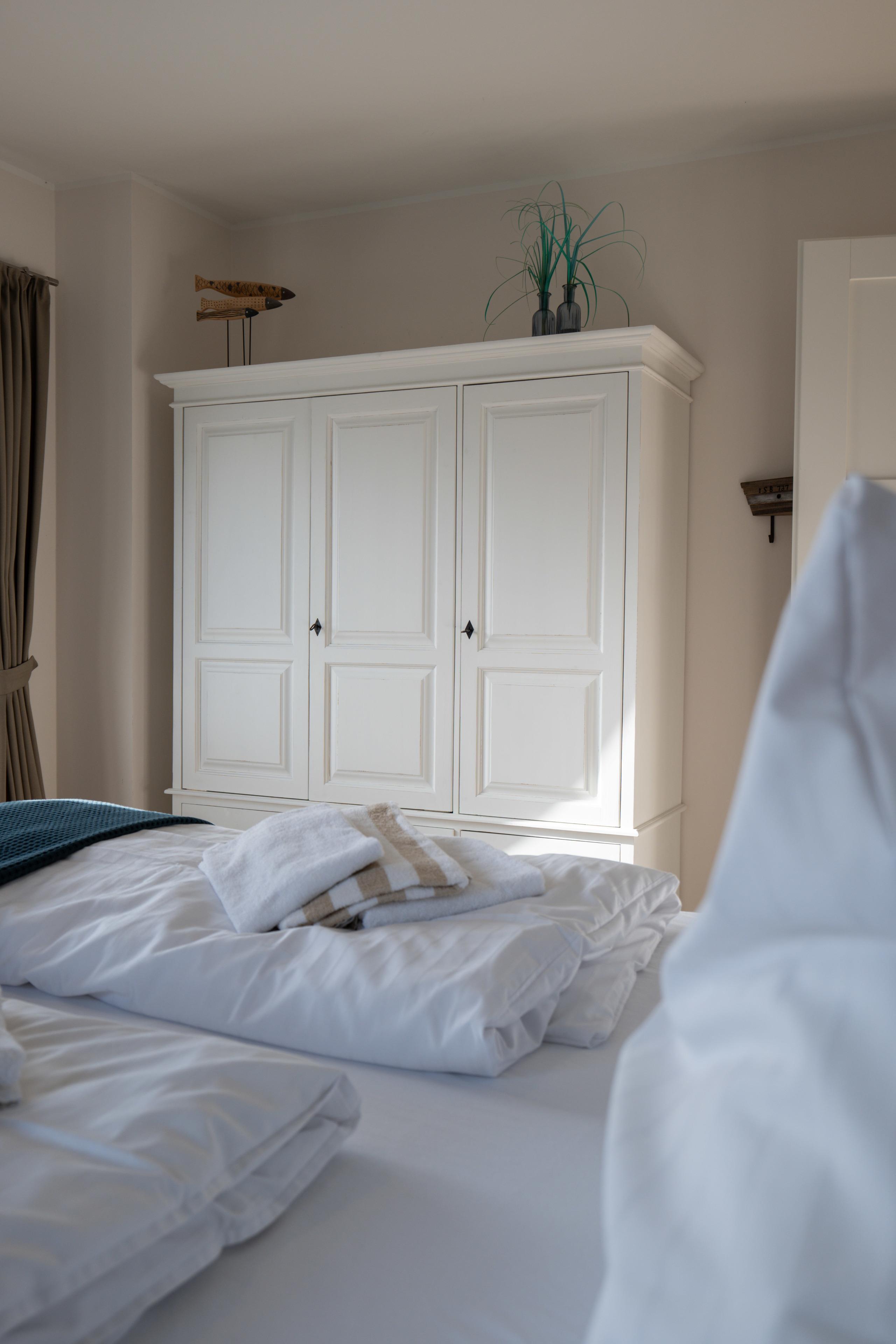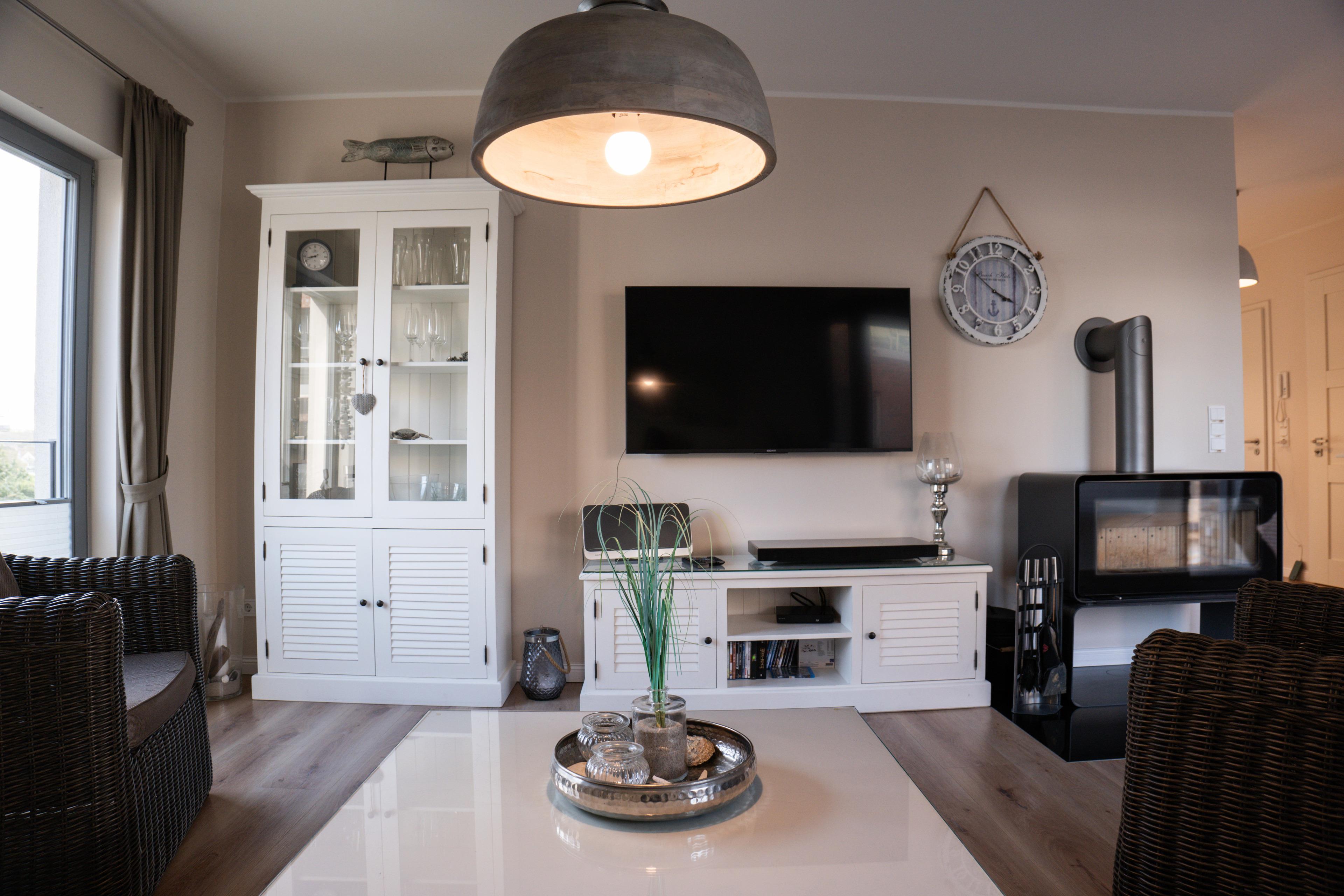 Eingerichtet im maritimen, weißen Landhausstil, mit viel Herz und Liebe gelebt und gepflegt. 89qm Wohnfläche, aufgeteilt in 2 Schlafzimmer, einem Wohn-Essbereich mit Kaminofen und offener Küche, einem Duschbad mit einer "Walkin-Dusche" sowie 2 Balkonen, die Ihnen 3 x Wasserblick garantieren.