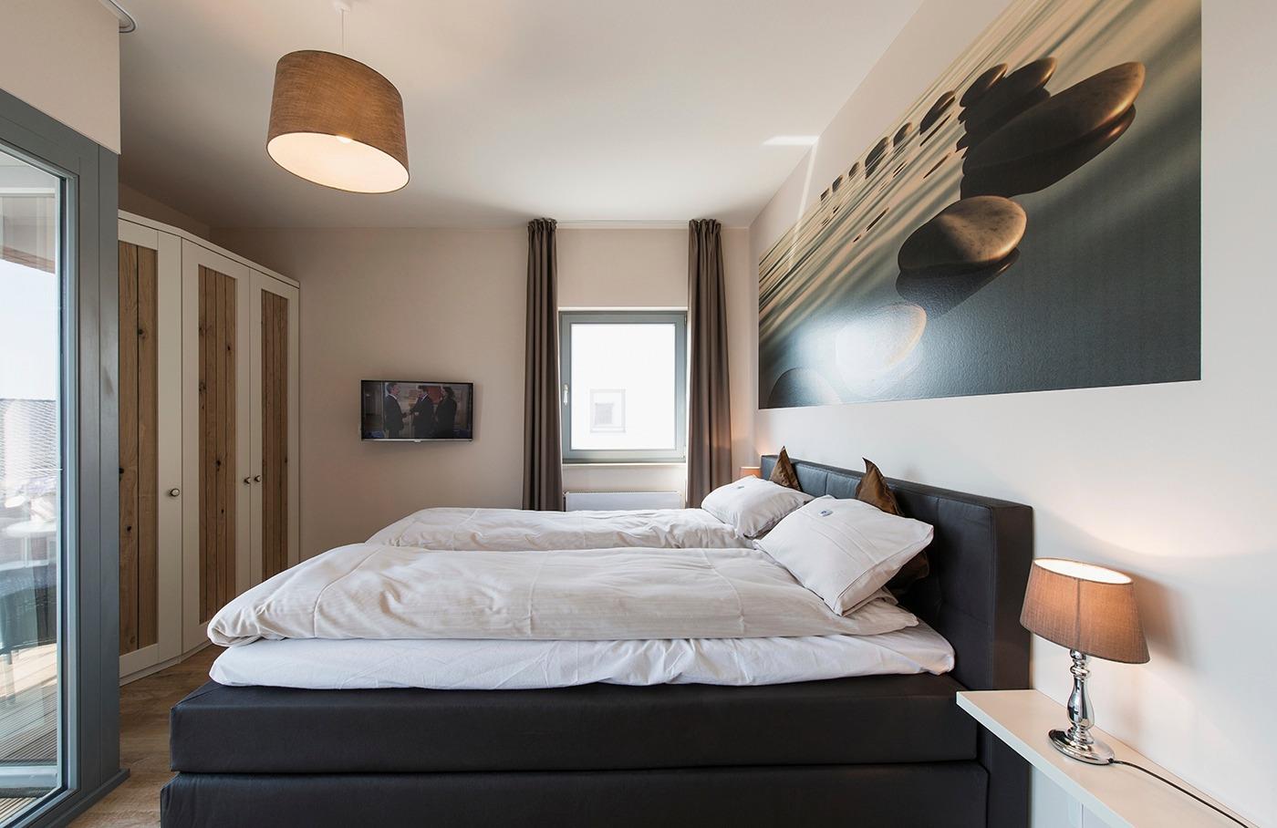 Im Obergeschoss gelangen Sie aus allen 3 Schlafzimmern auf den Balkon bzw. die Loggia, die Loggia lockt mit einem Ausblick auf den Yachthafen, der Balkon verwöhnt Sie in der Abendsonne mit einem Ausblick auf den Binnensee. Alle Schlafzimmer sind mit Boxspringbetten, TV und genügend Stauraum ausgestattet und können über Black-Out-Vorhänge komplett verdunkelt werden. Das Wellness-Bad verfügt über eine Badewanne, Dusche und einen Doppelwaschtisch. In einem separaten Abstellraum finden Sie eine Waschmaschine/Trockner gegen Gebühr.