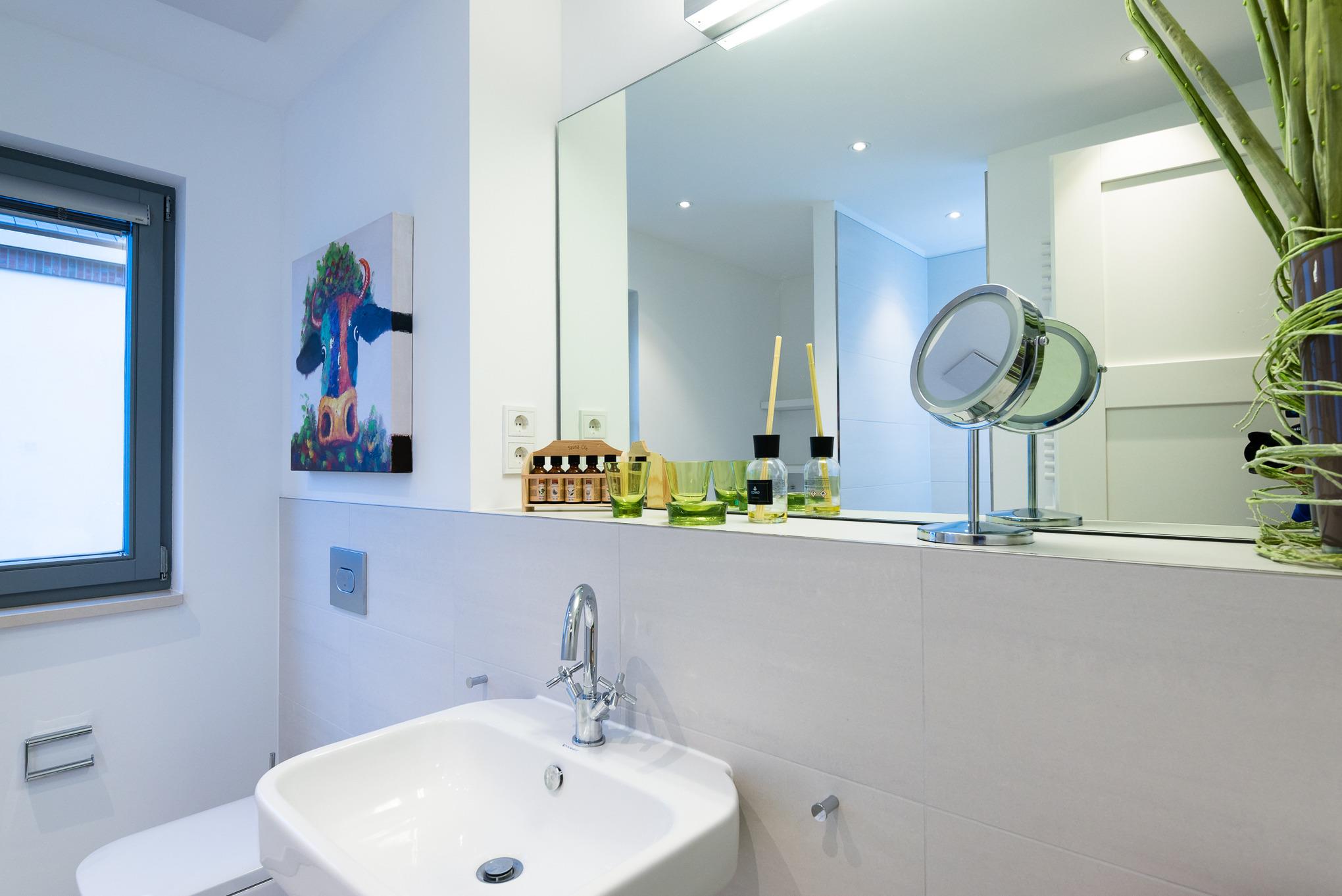 Im Badezimmer finden Sie eine großzügige Regendusche und bei Bedarf können Sie hier Ihre Wäsche waschen und trocknen. Das mit Tageslicht durchflutete Badezimmer bietet genügend Platz um sich für den Tag hübsch zu machen. Der Kosmetikspiegel hilft dabei. Die Handtuchheizung und die Fußbodenheizung runden das Ganze ab.