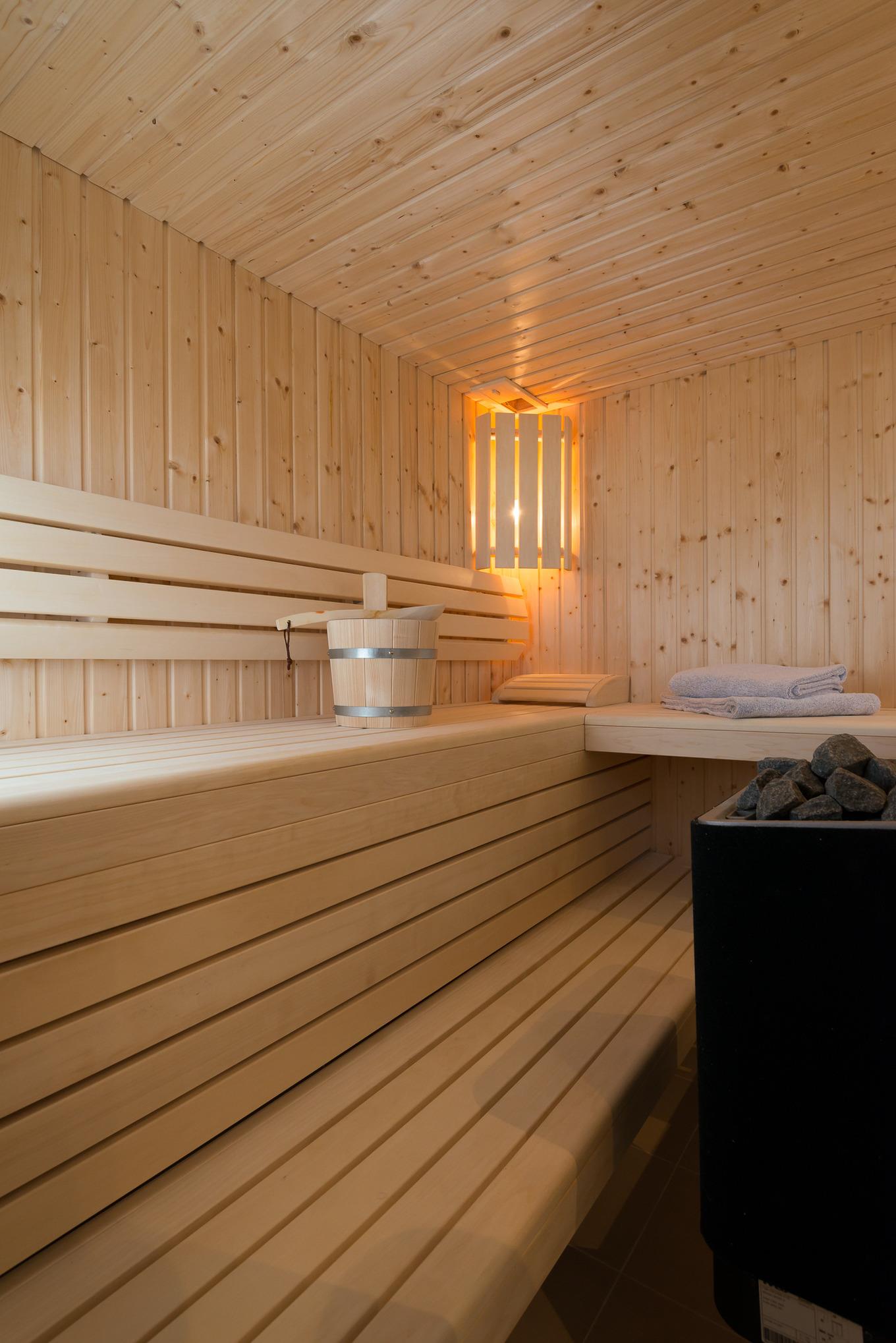 Die Sauna mit angrenzender bodengleicher Großraumdusche ist gleich nebenan – ebenfalls in der Wohnung.