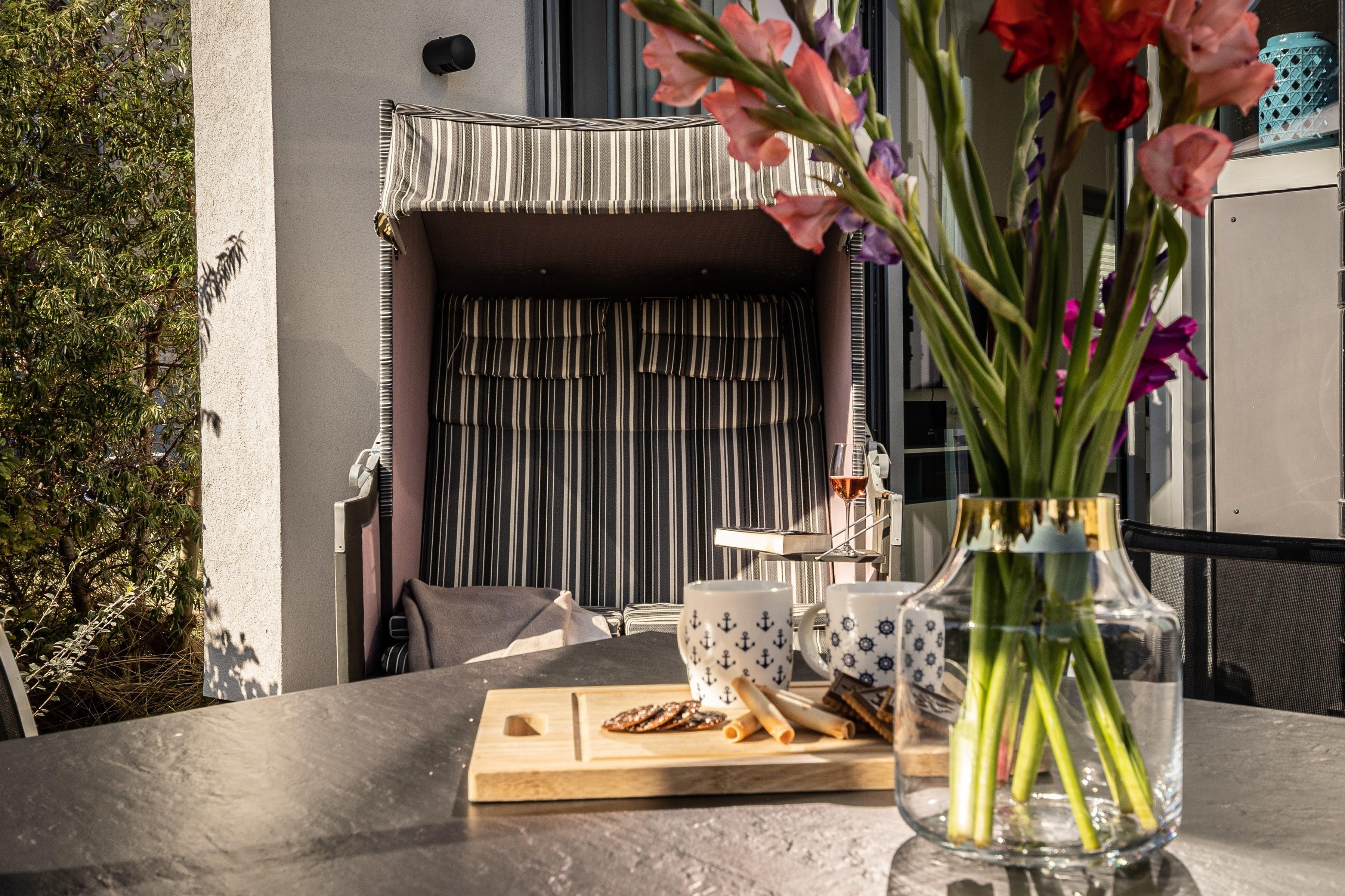 In den Sommermonaten erwartet Sie die sonnige Terrasse mit Strandkorb, Gartenmöbeln, großem Sonnenschirm und Blick auf die Marina. Eine weitere, kleine Terrasse versteckt sich noch hinter dem Haus.