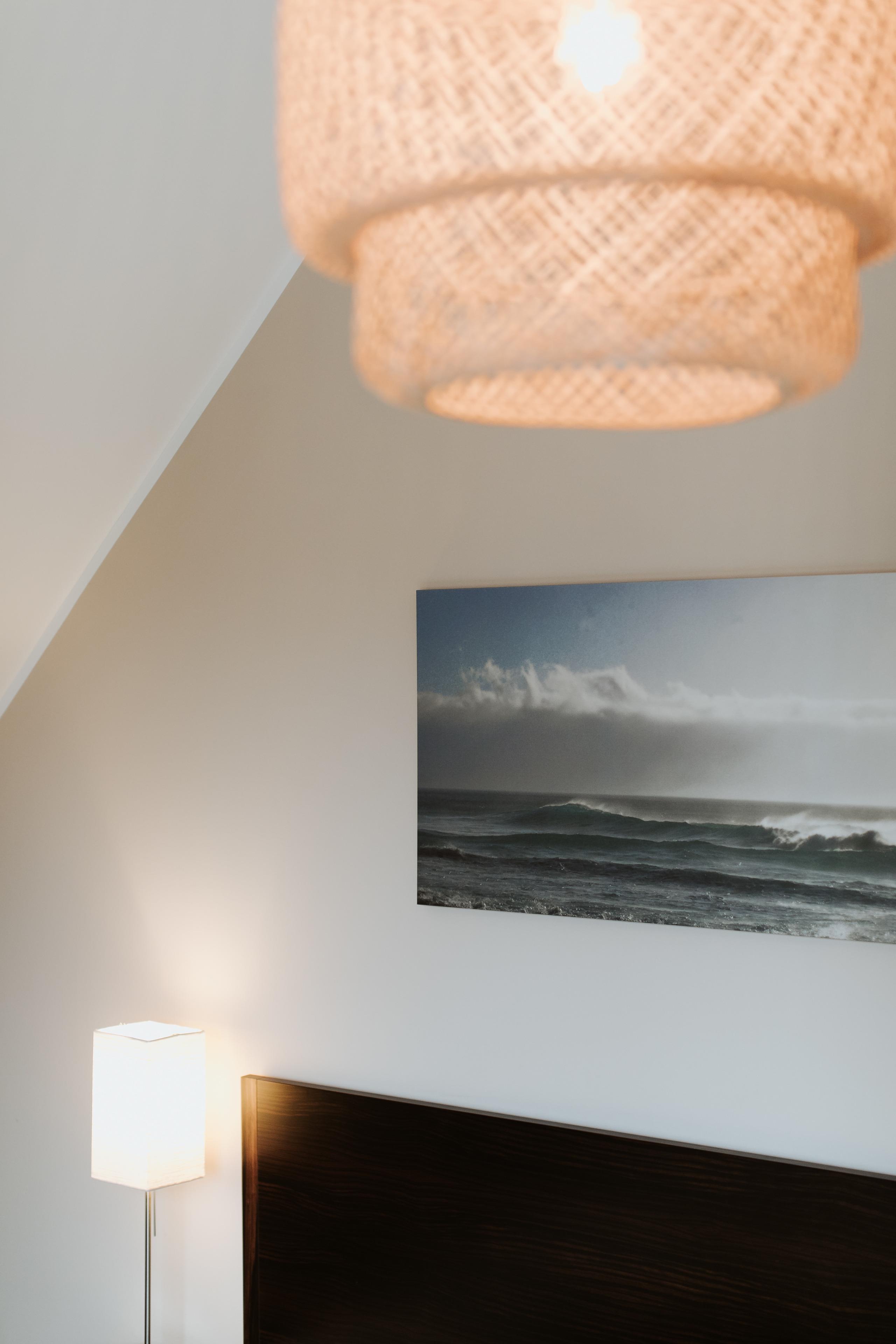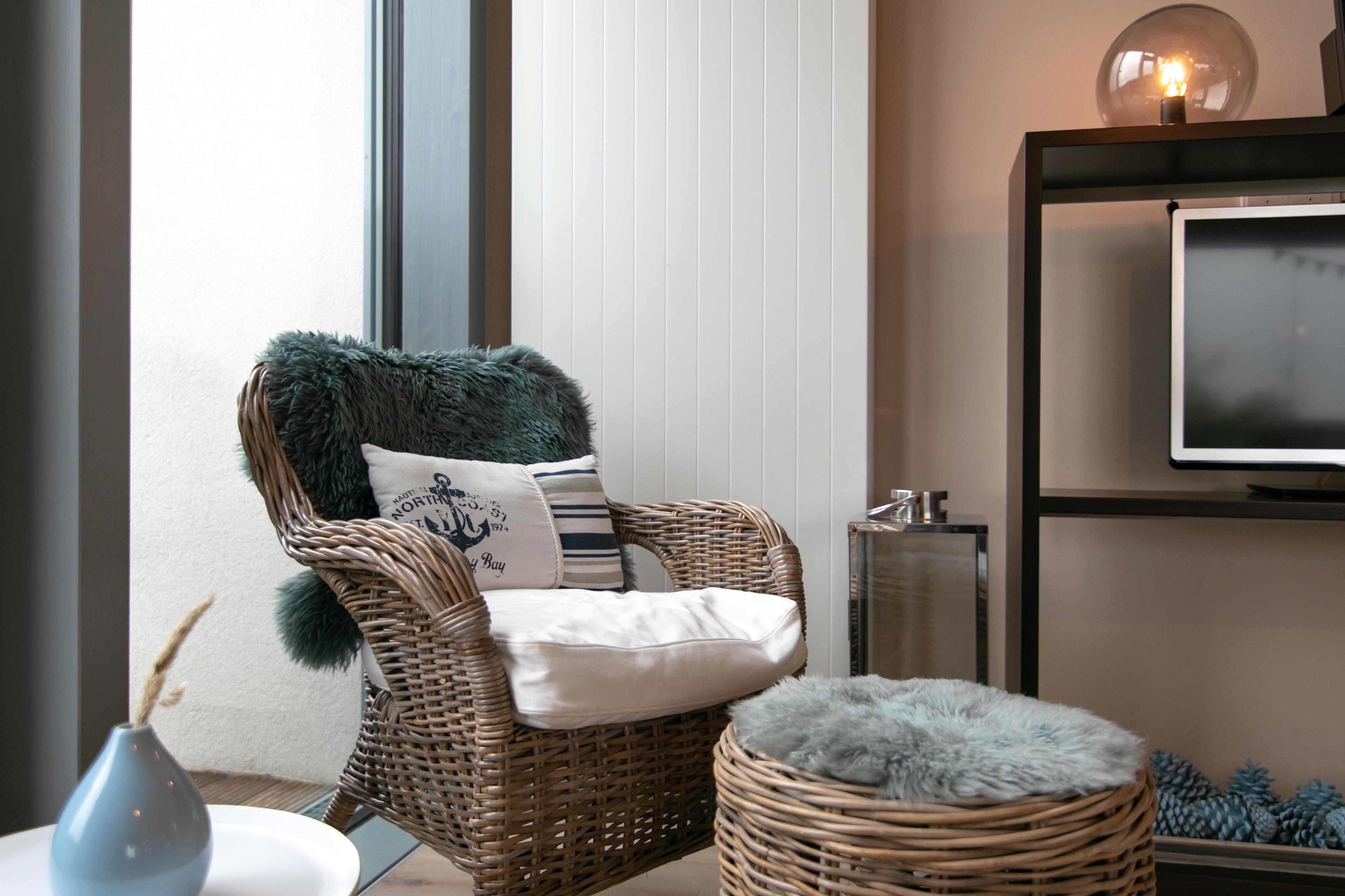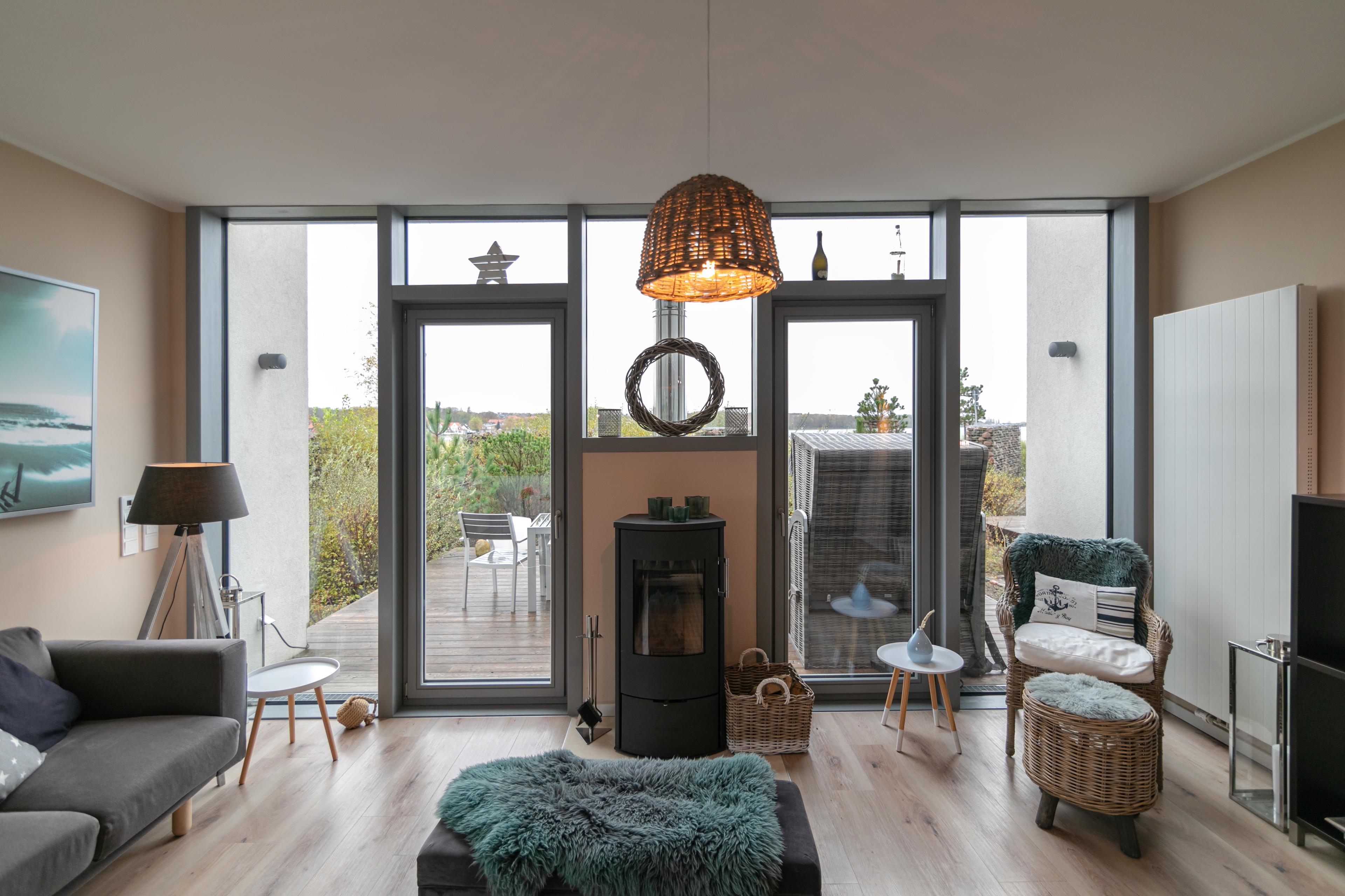 Im Erdgeschoss erwartet Sie ein großzügiger Wohnbereich mit Kamin und TV, ein anschließender Essbereich sowie eine voll ausgestattete Küchenzeile. Von hier aus gelangen Sie auf eine möblierte Terrasse, umringt von Grün, mit einem Grill, Sonnenliegen und einem Strandkorb. Die andere Terrasse liegt auf der gegenüberliegenden Seite, sodass Sie den ganzen Tag Sonne haben. Abgerundet wird das Erdgeschoss durch ein Gäste-WC und einen extra Zimmer mit Couch.