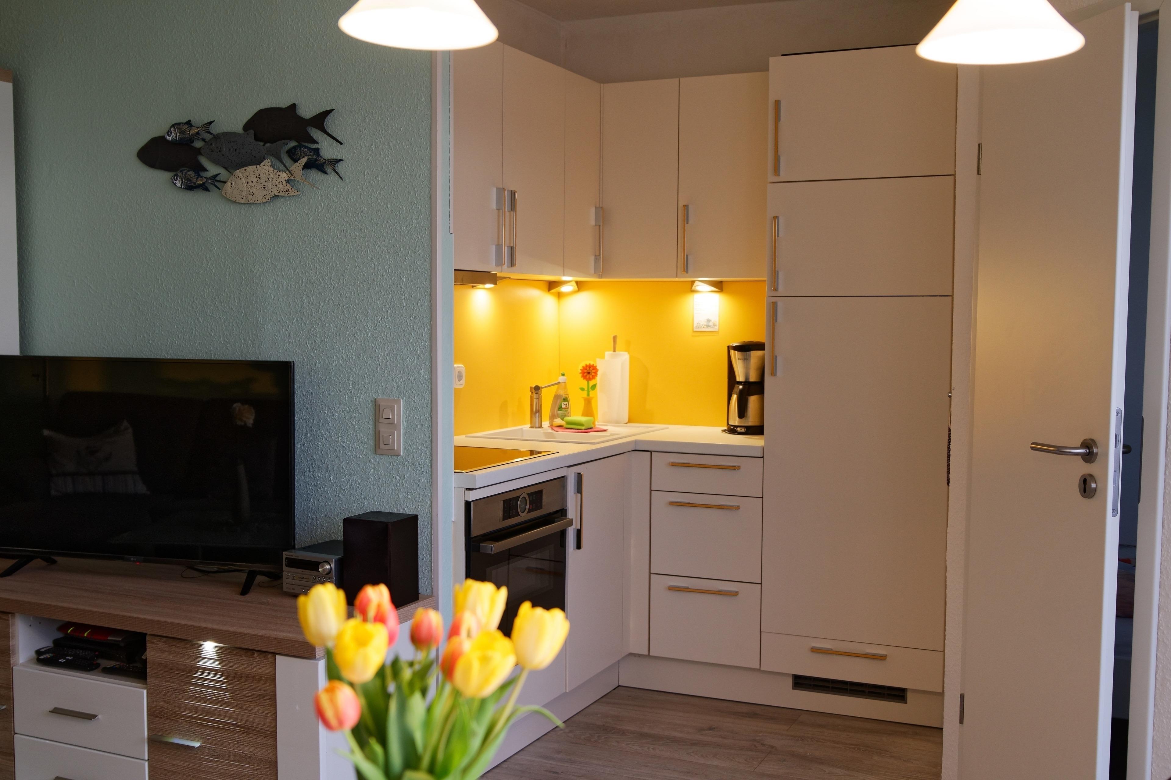 Der Küchenbereich ist mit einem Ceranfeld (4 Kochzonen), Backofen/Mikrowellenkombi, Kühlschrank 180L mit separaten Gefrierfach ausgestattet.
