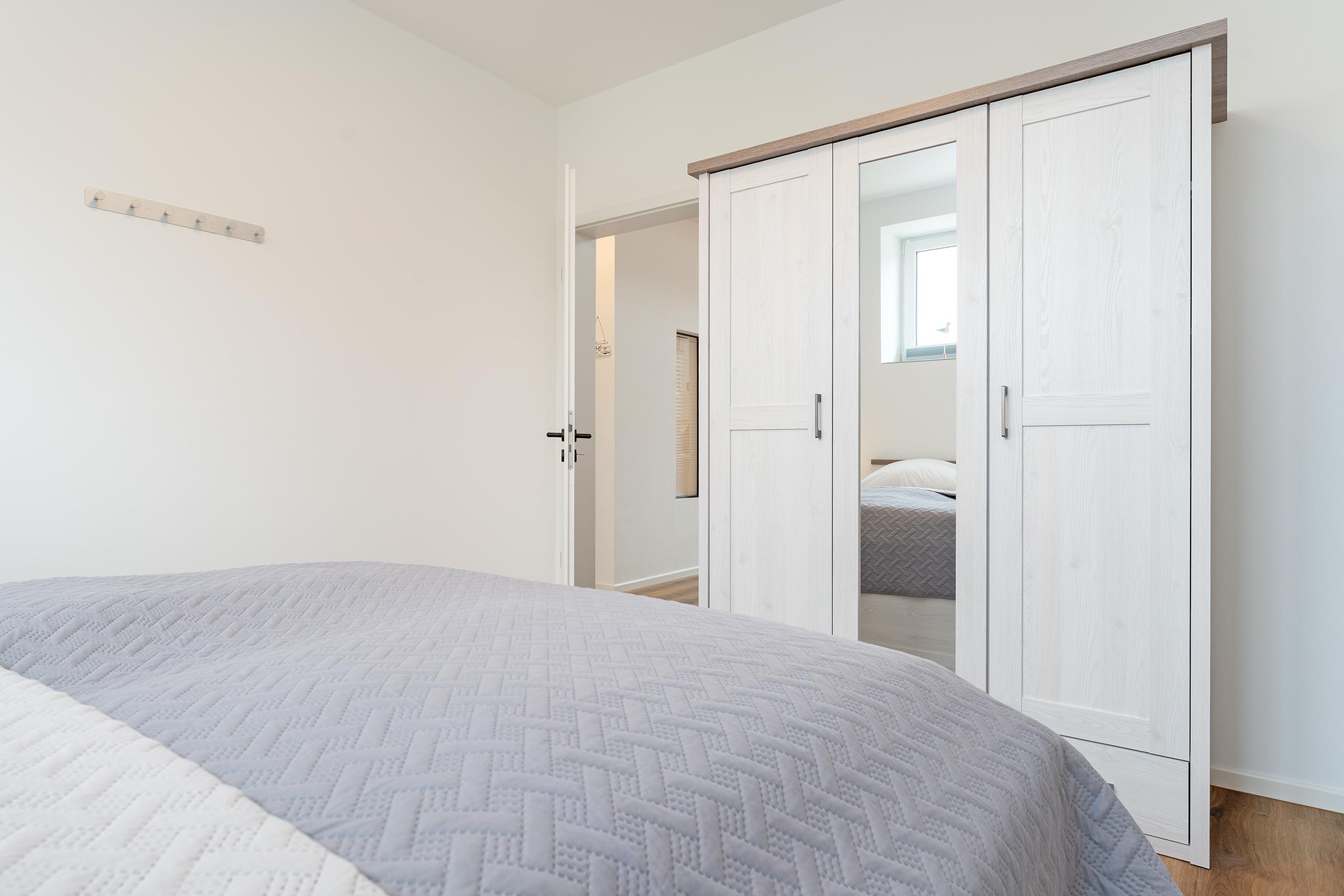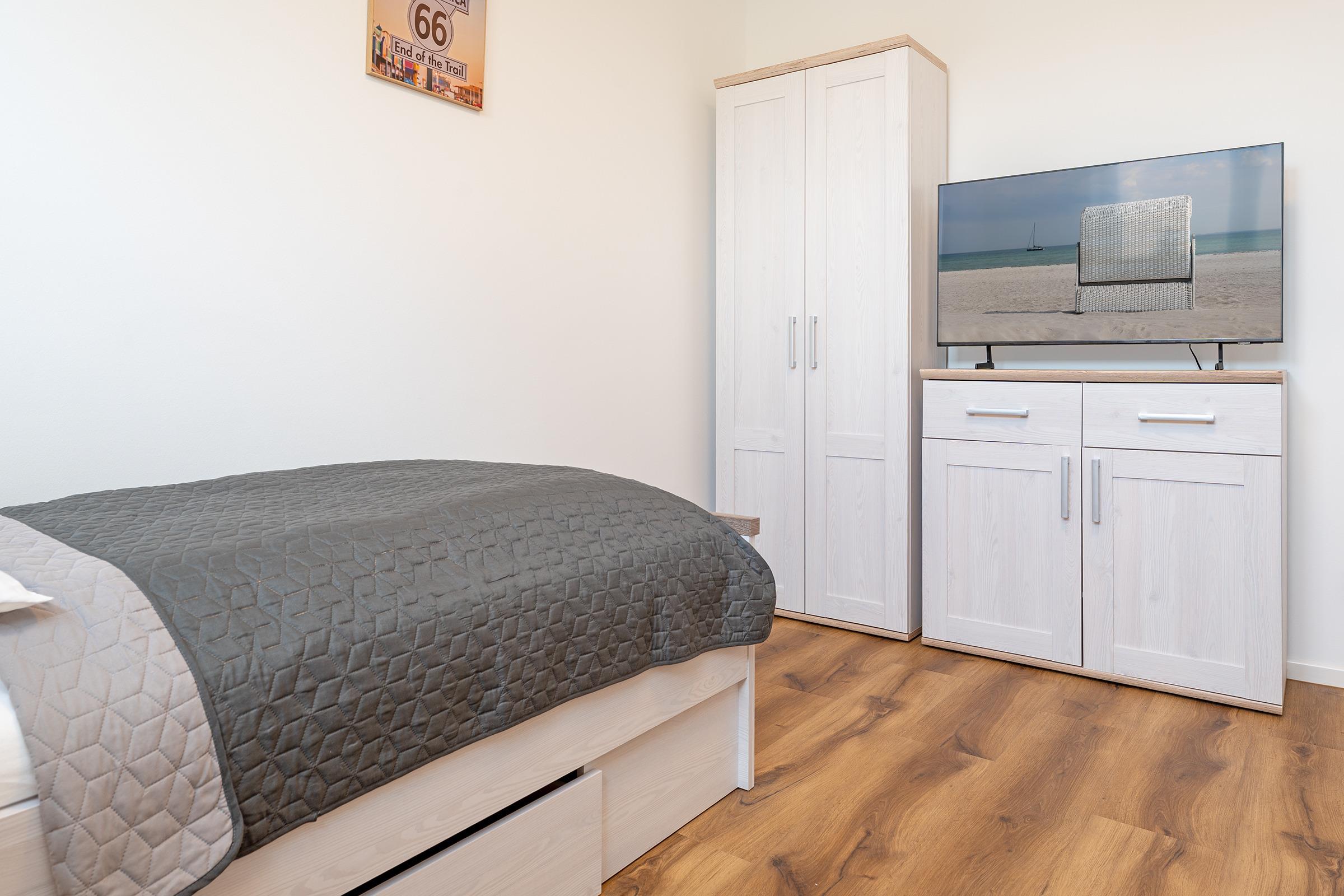 Schlafzimmer 1: 1 Doppelbett (2x 90x200 cm mit durchgehendem Topper), Kleiderschrank, TV, Verdunkelung: Verdunkelungsplissees und -vorhänge, Platz für ein Babybett vorhanden