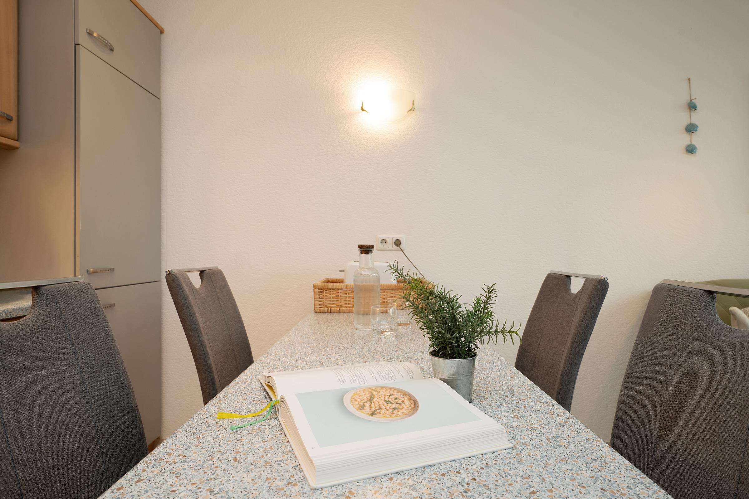 Im freundlich gestalteten Wohnbereich erwarten Sie eine gemütliche Sitzgruppe, TV, und ein Radio – perfekt zum Entspannen. Der Zugang zum Süd-Balkon erfolgt direkt vom Wohnraum und lädt zum Genießen unter freiem Himmel ein. Die offene Küchenzeile ist ausgestattet mit Ceranfeld (2 Kochfelder), Backofen, Mikrowelle, Kühl- und Gefrierschrank, Geschirrspüler, Kaffeemaschine, Wasserkocher und Toaster. Der angeschlossene Essplatz bietet Raum für gesellige Mahlzeiten. Das erste Schlafzimmer ist mit einem Doppelbett und TV ausgestattet, das zweite verfügt über ein Etagenbett – ideal für Kinder. Im Badezimmer finden Sie eine Dusche mit niedrigem Einstieg (18 cm) und ein WC.
