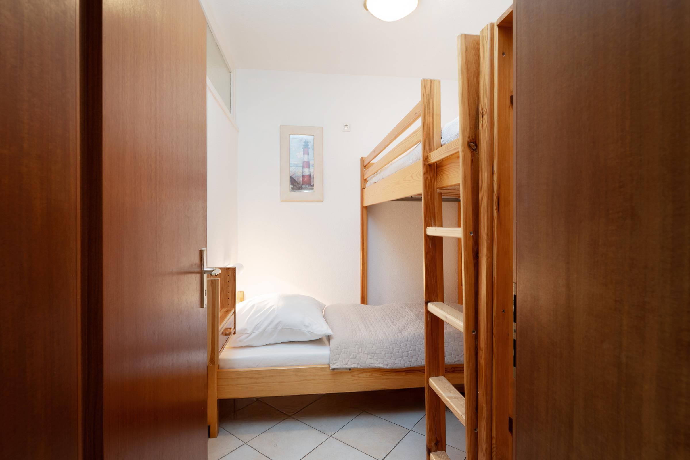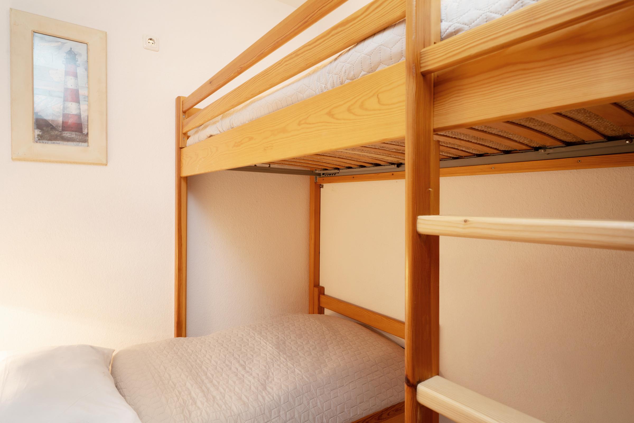 Schlafzimmer 2: 1 Etagenbett (2x 90x200 cm), Kleiderschrank, Oberlichtfenster zum Schlafzimmer ohne Verdunkelung, kein Platz für ein Babybett vorhanden
