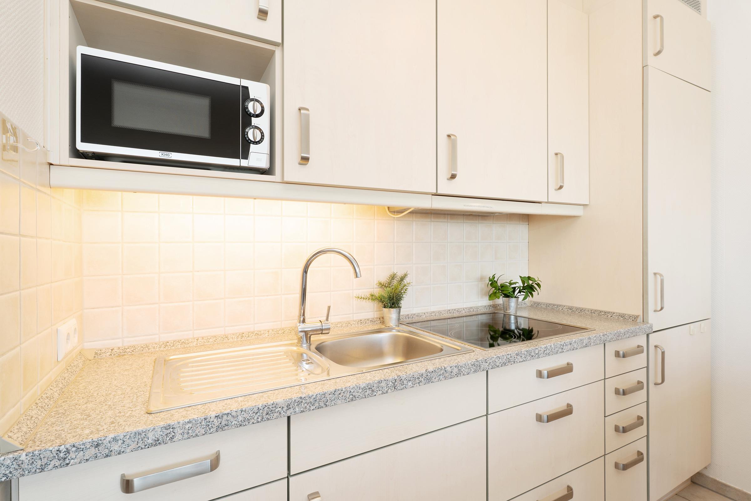 Der lichtdurchflutete Wohnbereich lädt mit gemütlicher Sofaecke, Fernseher und Radio zum Ausklang des Tages ein. Vom Wohnraum aus betreten Sie den sonnigen Balkon mit Blick auf die Ostsee – perfekt für Mahlzeiten an der frischen Luft. Die Küchenzeile bietet alles, was Sie brauchen: Ceranfeld (4 Kochzonen), Backofen, Mikrowelle, Kühlschrank, Gefrierschrank, Geschirrspüler, Kaffeemaschine, Wasserkocher und Toaster. Der Essbereich bietet Raum für gemeinsame Mahlzeiten. Im großen Schlafzimmer erwartet Sie ein Doppelbett und ein TV, das zweite Schlafzimmer ist mit Etagenbett ideal für Kinder. Das Bad verfügt über eine Dusche mit 13 cm Einstiegshöhe sowie ein WC.
