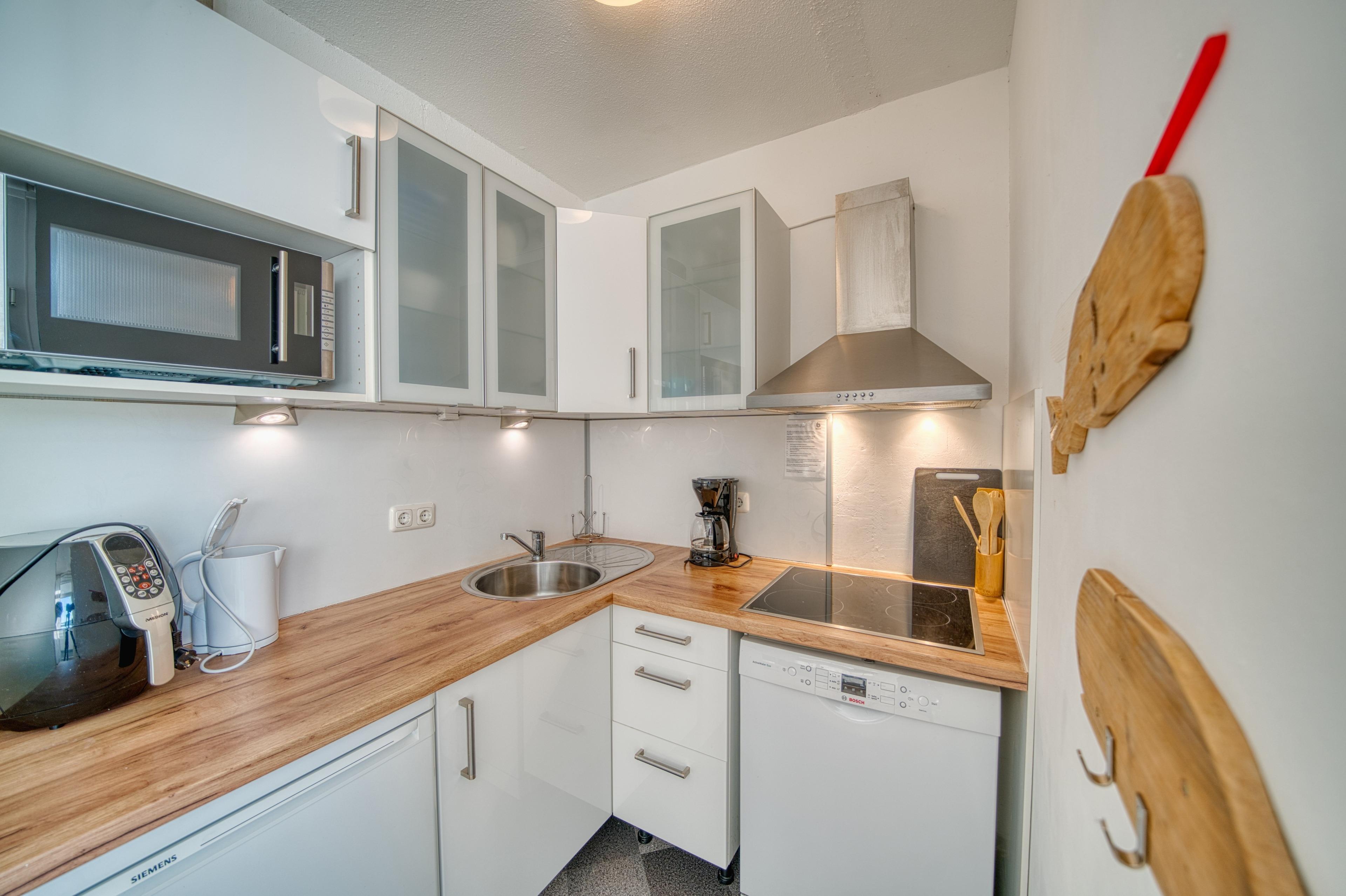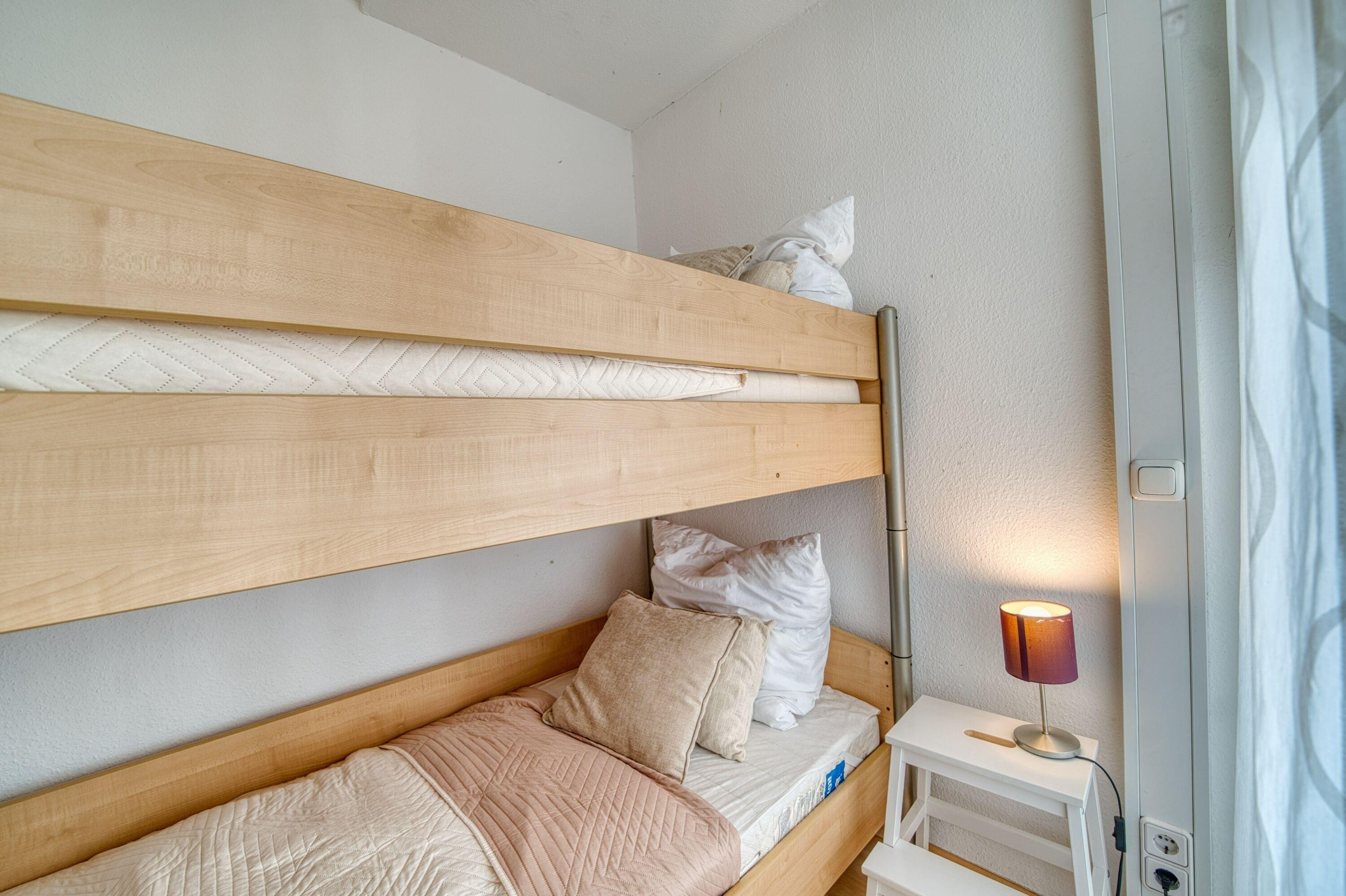 Südlicher Balkon mit Binnenseeblick, Wohn-/Schlafbereich mit Doppelbett, separates Kinderzimmer mit Etagenbett, TV. Laminatboden. Küchenzeile mit Herd, Geschirrspüler und Mikrowelle. Bad mit Duschkabine, Hänge-WC und Handtuchtrockner. Ca. 300?m zum Strand, kostenloser Parkplatz, Fahrstuhl, abschließbare Fahrradräume, ca. 30?m zum Aktiv-Hus und Ladenzeile. Nichtraucherwohnung, keine Haustiere, .