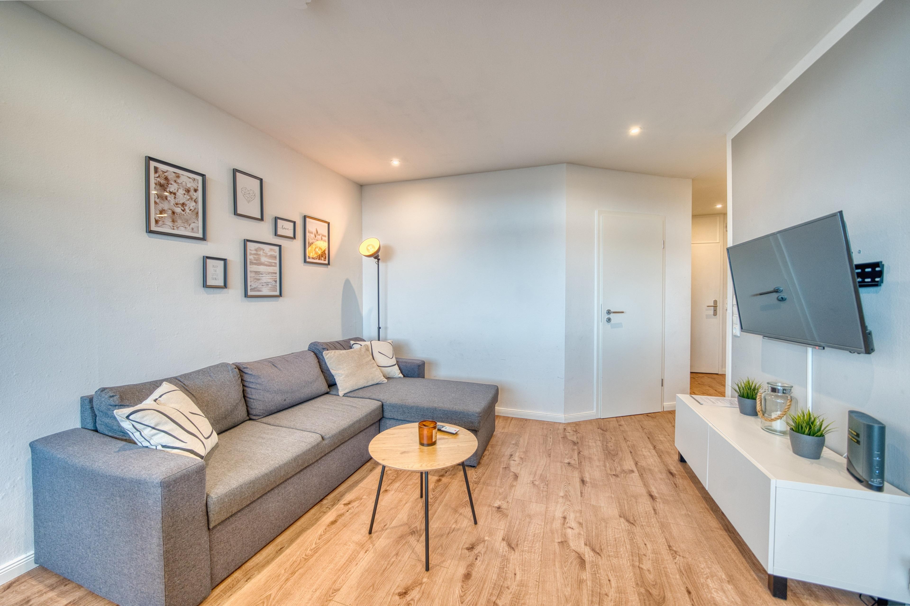 Wohnzimmer: Gemütliches Ecksofa, Smart-TV und Essbereich