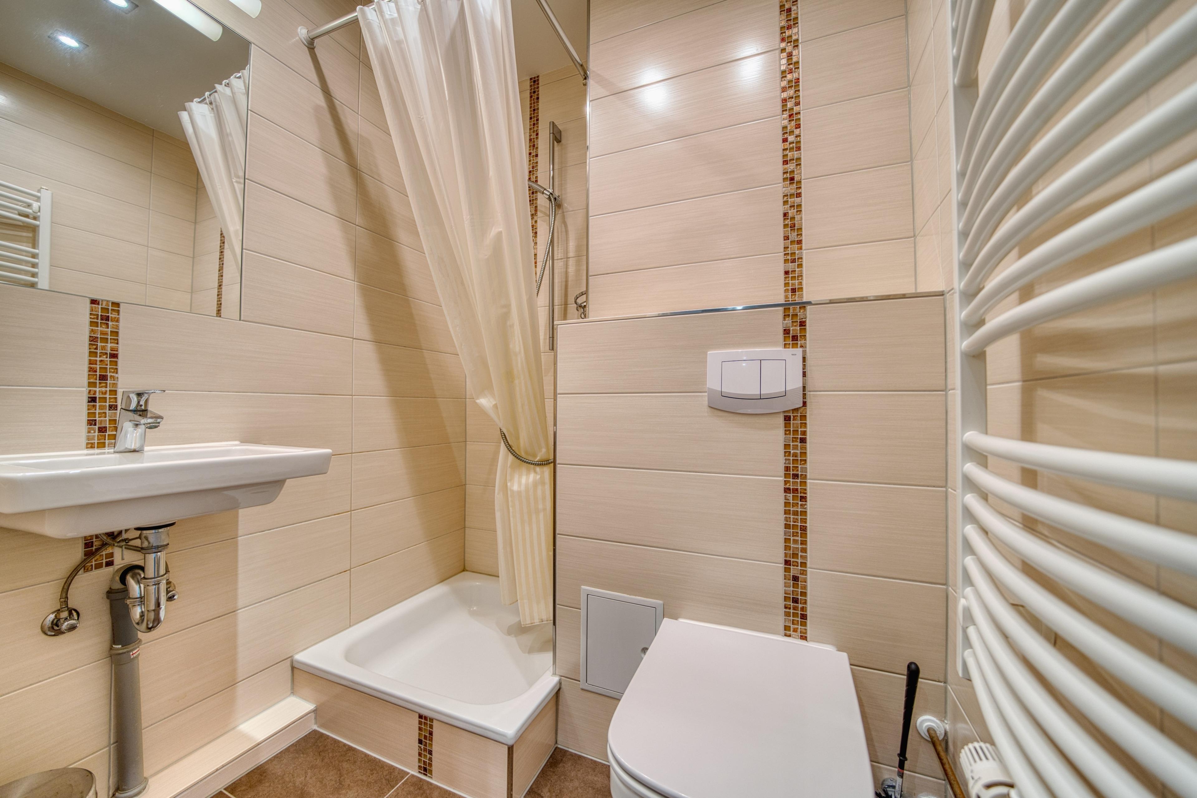 Badezimmer: Dusche, WC und Handtuchtrockner