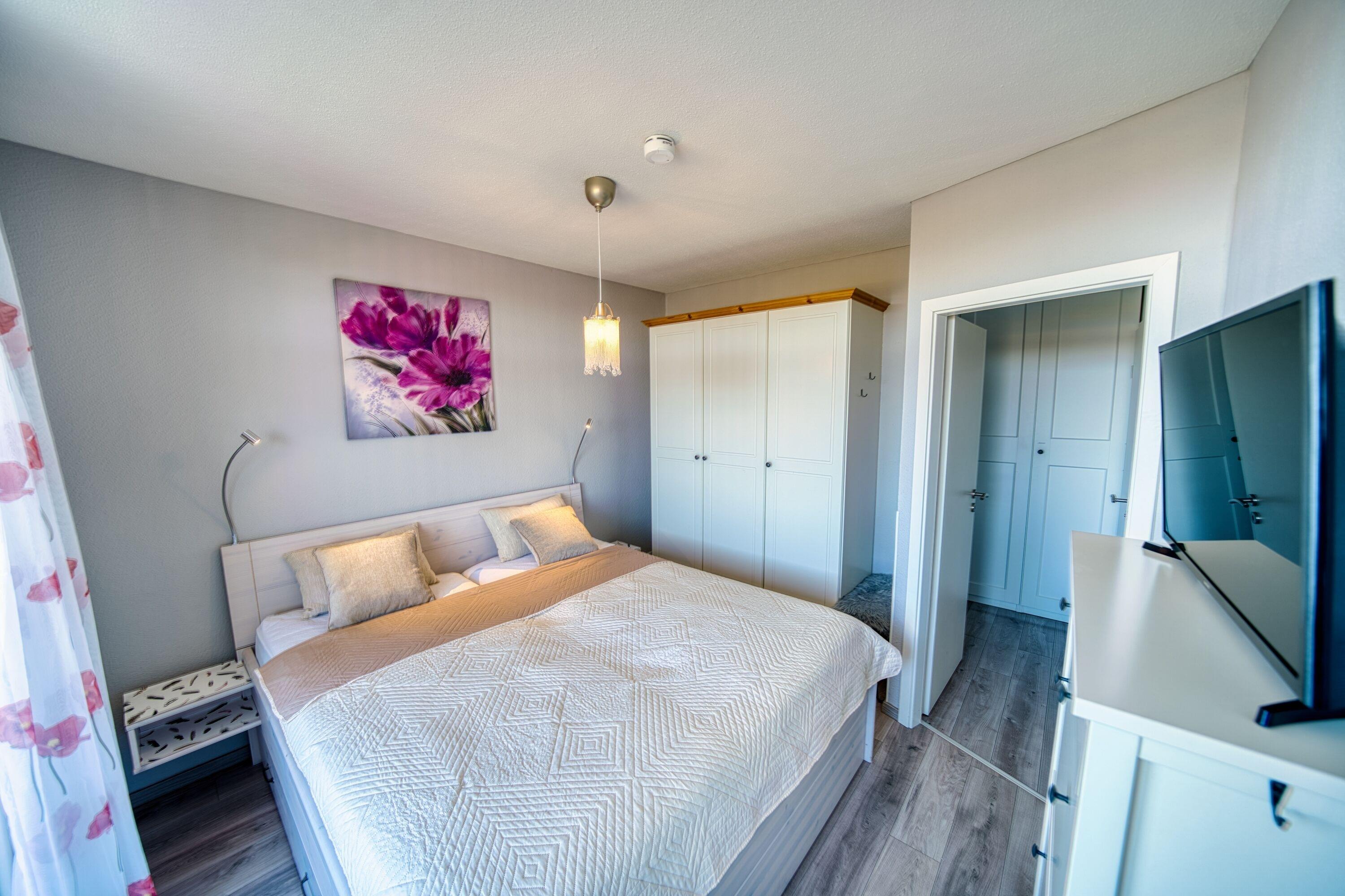 Das Wohn-Esszimmer ist mit bequemer Couch, 55-Zoll-Smart-TV und großem Esstisch ausgestattet. Es stehen zwei Schlafzimmer zur Verfügung: eines mit Doppelbett, Smart-TV und Ostseeblick, das zweite mit Boxspring-Einzelbett und Smart-TV. Die voll ausgestattete Küche bietet u. a. Ceranfeld, Backofen, Geschirrspüler und Kaffeemaschine. Das moderne Bad verfügt über Dusche mit niedrigem Einstieg.
