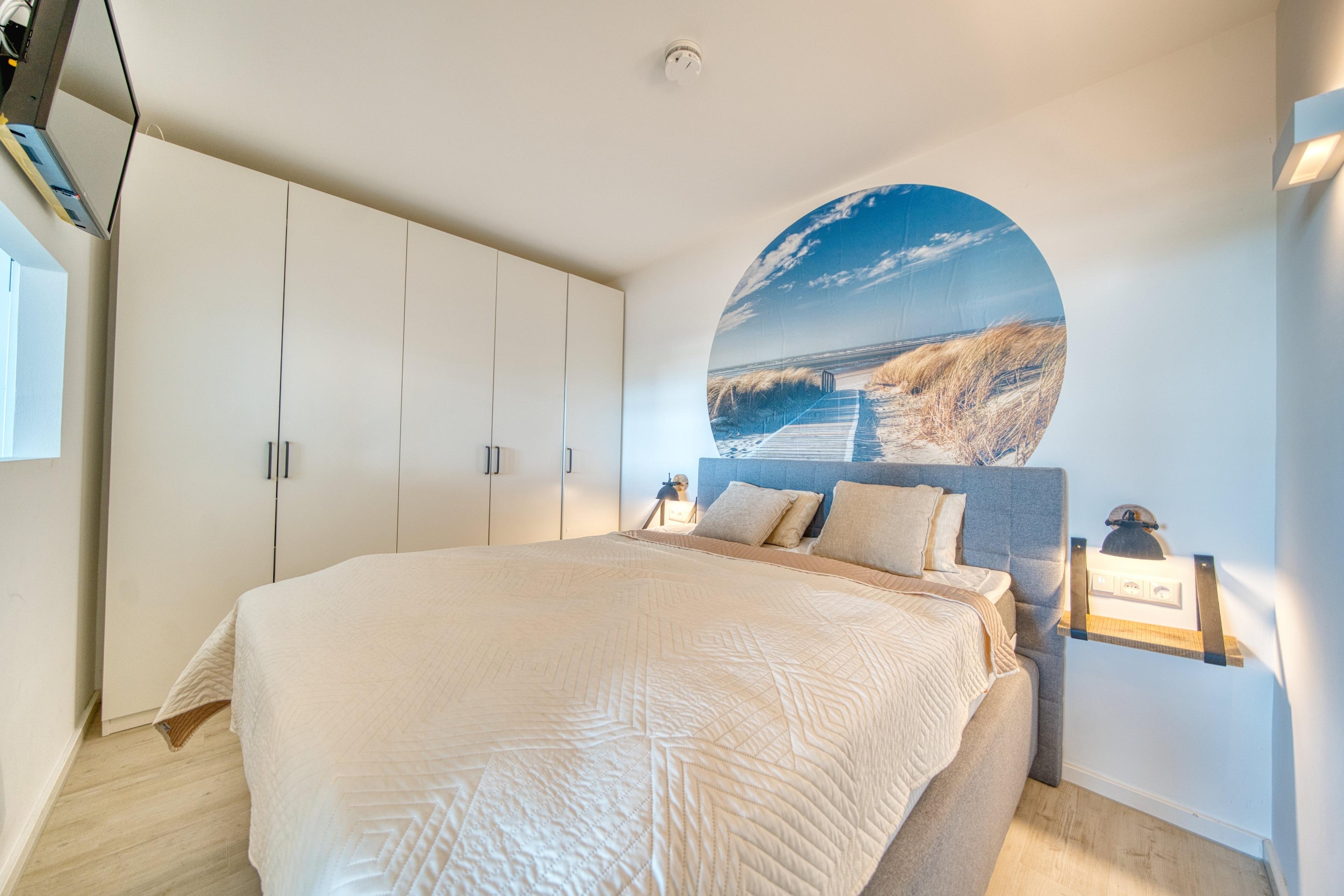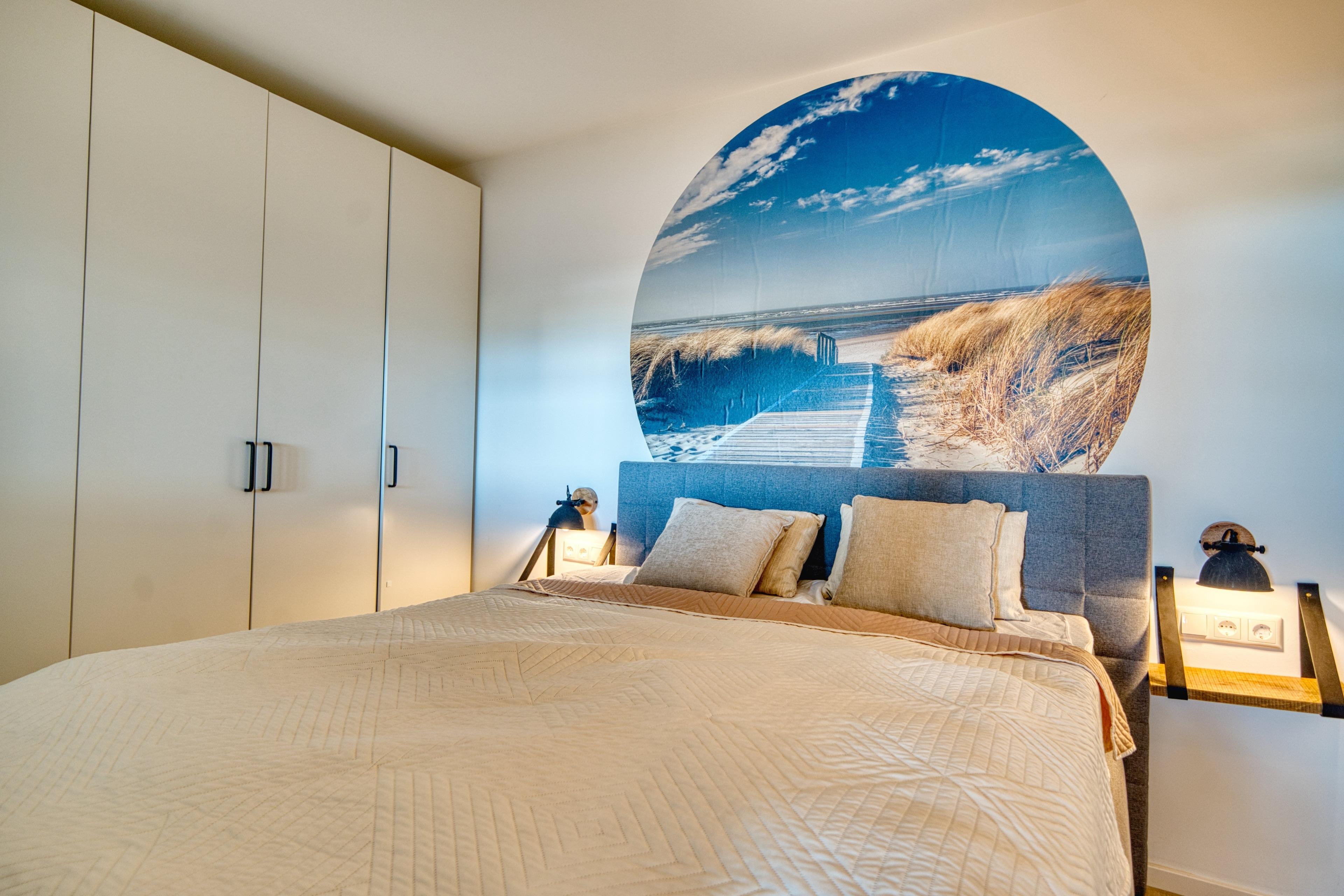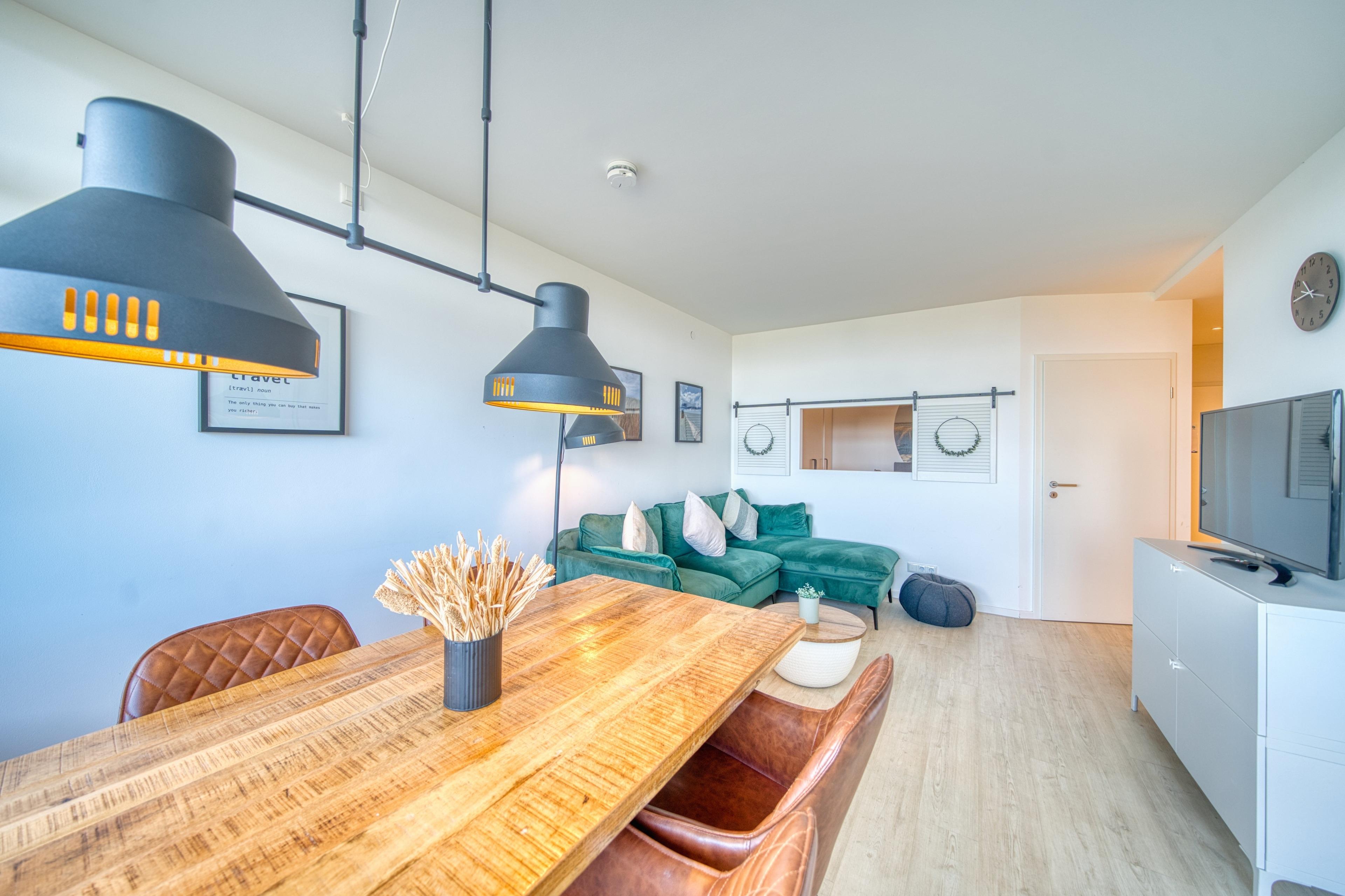 Die Wohnung in Nordlage verfügt über einen Balkon mit direktem Blick auf Ostsee und Binnensee. Der Wohnbereich ist mit Sofa, Essplatz für vier Personen und Flachbild-TV ausgestattet, Vinyl-Designboden sorgt für ein modernes Ambiente. Ein Schlafzimmer mit Doppelbett und TV sowie ein Kinderzimmer mit Etagenbett stehen zur Verfügung.