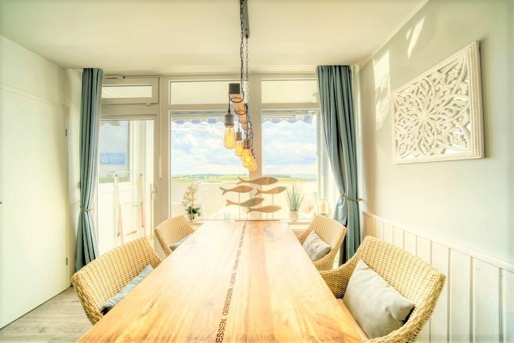 Wohnzimmer mit Ecksofa, Esstisch mit Ostseeblick und Smart TV