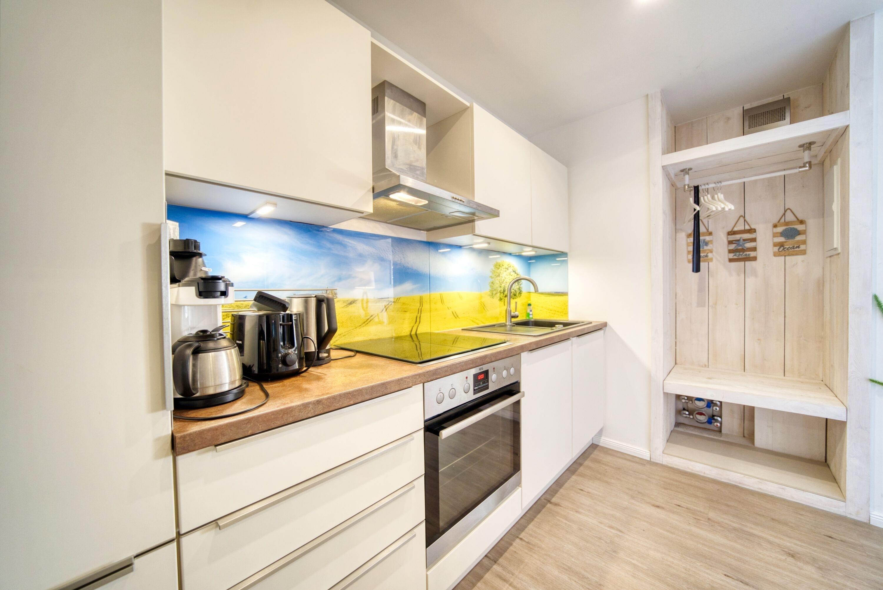 Helle Einbauküche im Eingangsbereich, voll ausgestattet