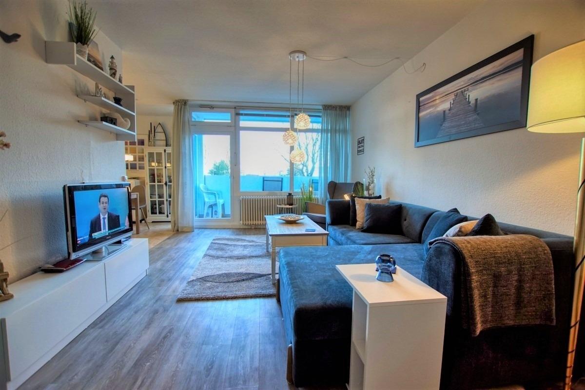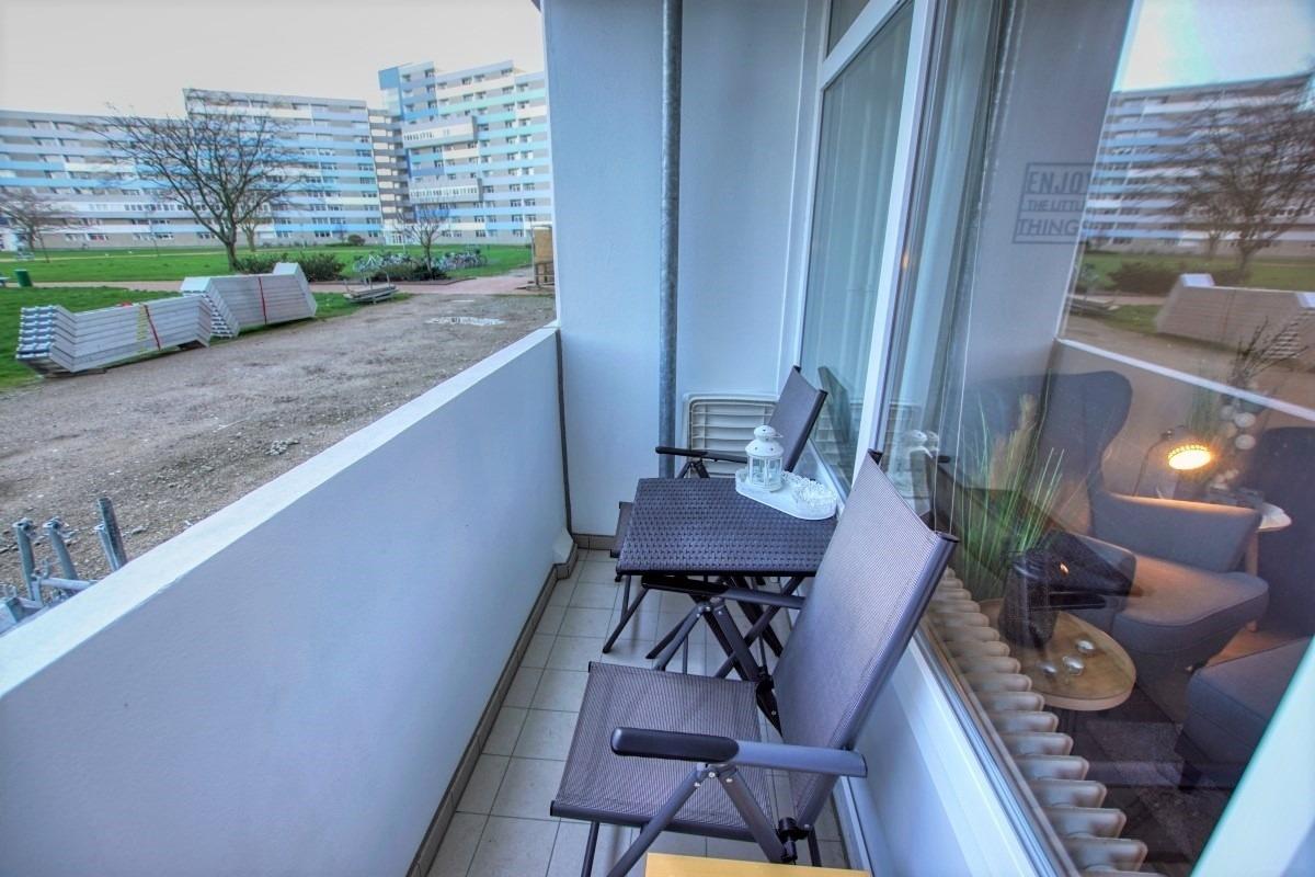 Ca. 45?qm Wohnfläche mit Wohn-Esszimmer (Schlafcouch, Sessel, Flachbild-TV), Schlafbereich mit Doppelbett, Küche mit Herd, Mikrowelle und Kaffeemaschine sowie Bad mit Dusche, WC und Handtuchtrockner. Balkon mit Blick auf den Innenhof. WLAN inklusive. Geeignet für max. 3–4 Personen, Nichtraucher, keine Haustiere. Abschließbare Fahrradräume, Strand ca. 300?m, kostenfreier Parkplatz vorhanden.