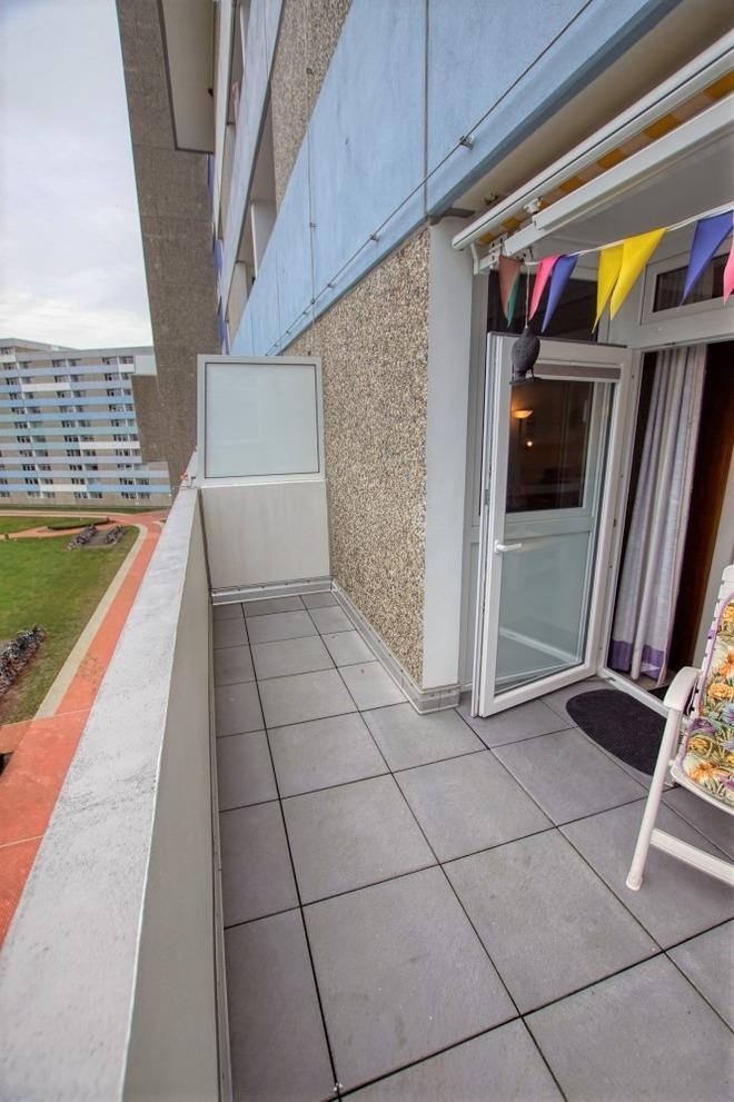 Die Ferienwohnung im Haus F, 5. Etage, mit Balkon zur Ostseite, bietet einen herrlichen Blick auf den großen Binnensee und den Innenhof.