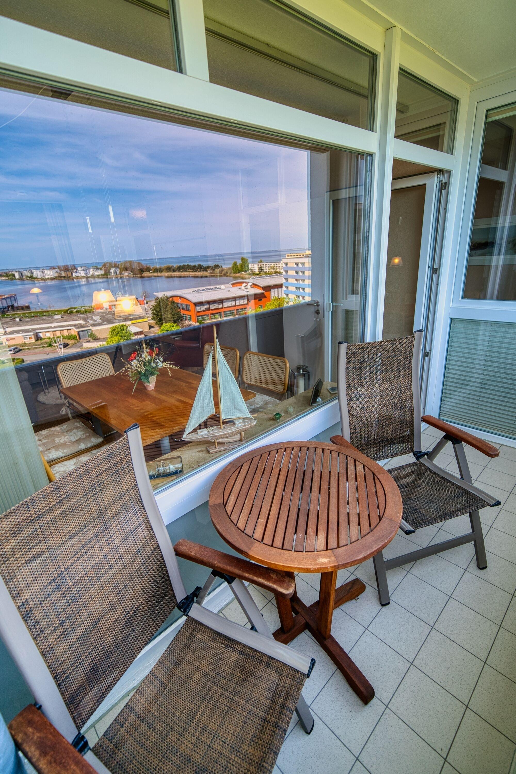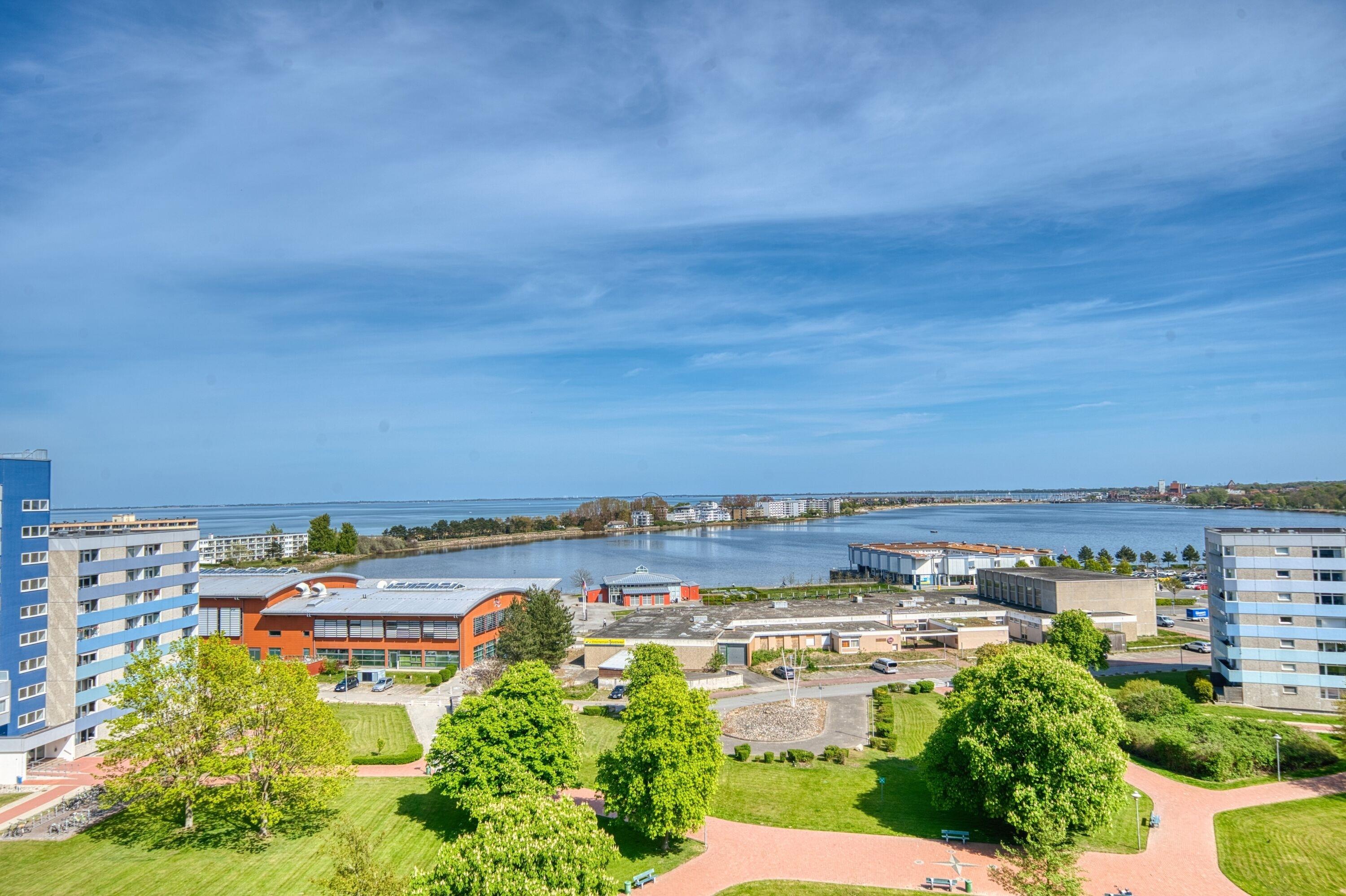 Die moderne und helle Ferienwohnung befindet sich im 9. Obergeschoss und bietet einen beeindruckenden Panoramablick über den Binnensee bis zur Ostsee. Auf ca. 45 m² ist sie ideal für bis zu 2 Personen geeignet.