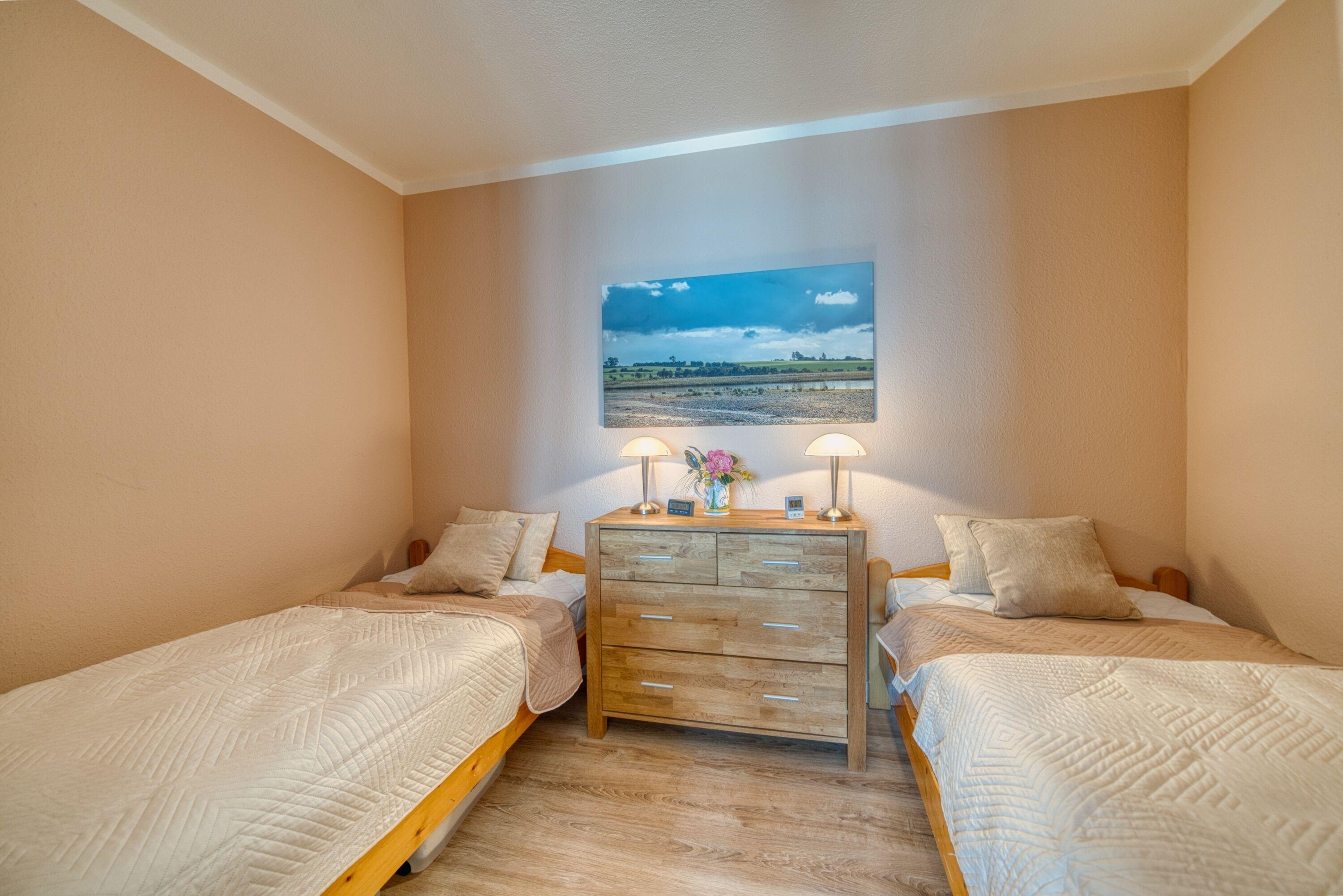 Der Schlafbereich ist mit zwei Einzelbetten ausgestattet, zusätzlich steht ein weiteres Einzelbett in einem separaten kleinen Zimmer zur Verfügung. Das helle Badezimmer verfügt über Dusche, WC und Waschbecken. Die Küche ist funktional eingerichtet mit Ceranfeld, Kühlschrank, Mikrowelle und Filterkaffeemaschine.