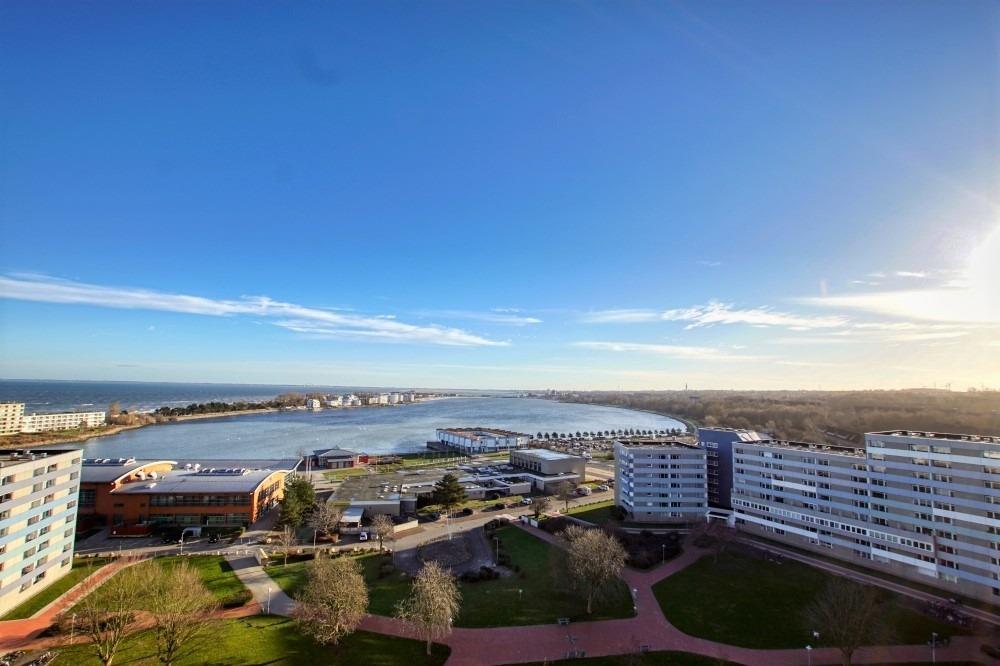 Die Wohnung liegt im Haus G Ferienpark, in der 13. Etage, mit Balkon zur Ostseite, der einen herrlichen Blick auf die Ostsee mit Fehmarnsundbrücke sowie auf den Binnensee mit Stadt und Yachthafen bietet.