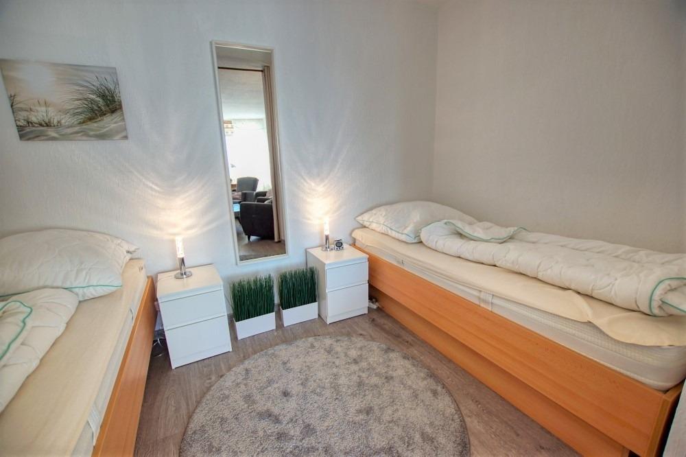 Die 45?m² große Wohnung verfügt über Wohn-Esszimmer mit Sitzecke, Elternschlafbereich mit Einzelbetten, separates Kinderzimmer mit Etagenbett, voll ausgestattete Küche (Mikrowelle, Kühlschrank, 4-Plattenherd), Bad mit Dusche/WC sowie TV und Radio. Nichtraucher, keine Haustiere, kein WLAN, Fahrstuhl, Fahrradräume, ca. 300?m zum Strand, kostenfreier Parkplatz hinter dem Ferienpark. Ideal für entspannte Tage und Freizeitangebote im Ferienpark.