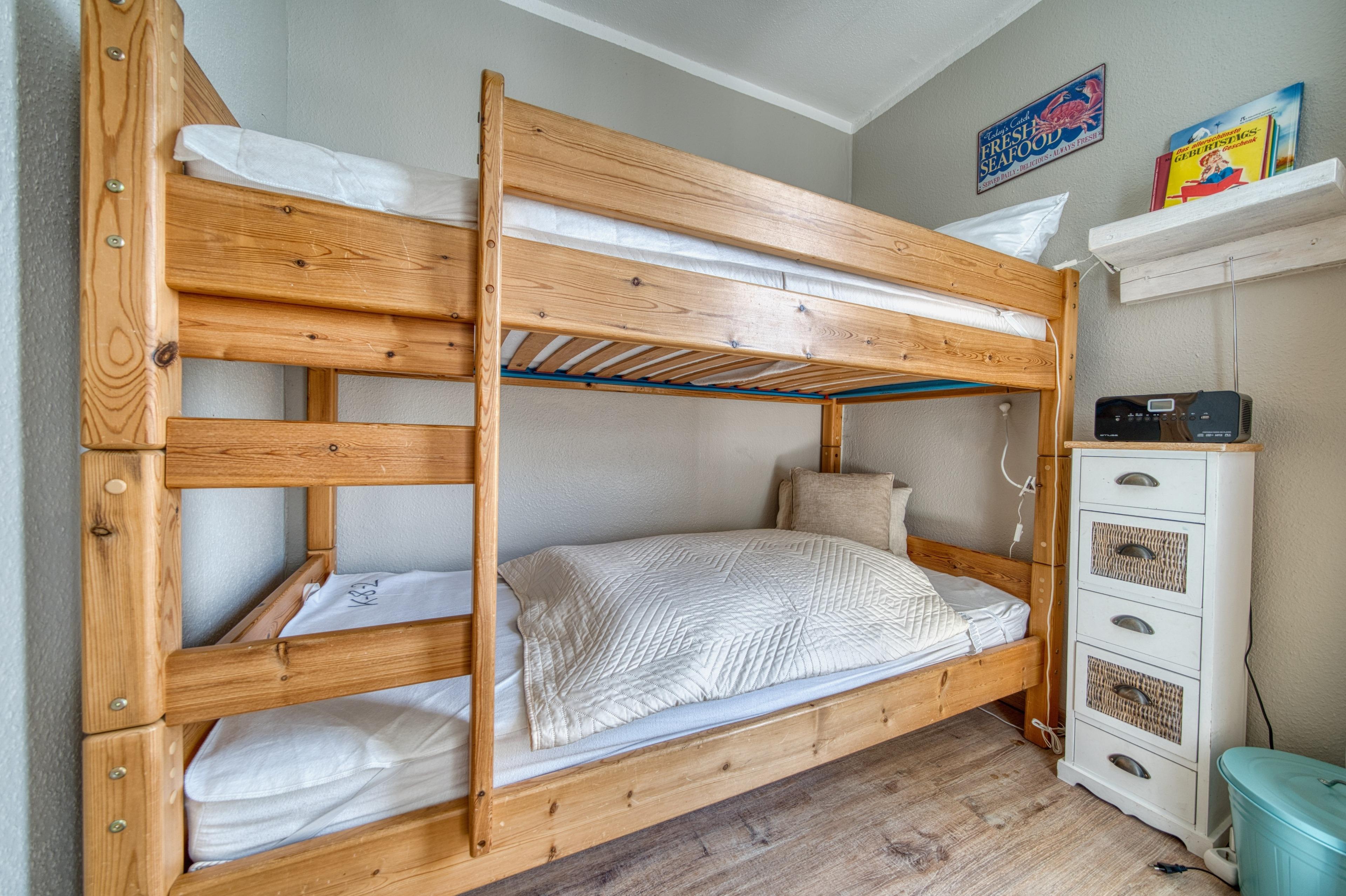 Die Wohnung verfügt über einen Wohn-Schlafbereich mit Doppelbett, separates Kinderzimmer mit Etagenbett und TV, Wohnbereich mit Sofa, Flachbild-TV und Esstisch. Laminatboden, funktionale Küche mit Ceranherd, Mini-Backofen, Geschirrspüler, Kühlschrank, Filterkaffeemaschine, Toaster und Wasserkocher. Bad mit Duschkabine, Handtuchtrockner und WC. WLAN inklusive. Nichtraucher, keine Haustiere, Fahrstuhl, abschließbare Fahrradräume, ca. 300?m zum Strand, kostenfreier Parkplatz.