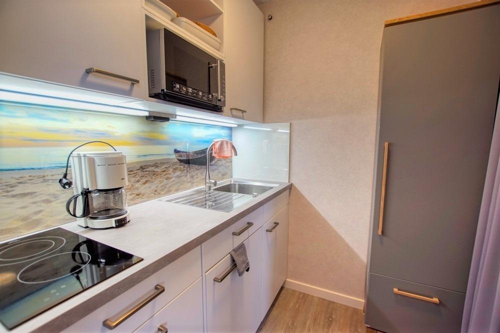 Voll ausgestattete Küche mit Kühlschrank und Gefrierfach, Mikrowelle, 4-Platten-Ceranherd und Geschirrspüler