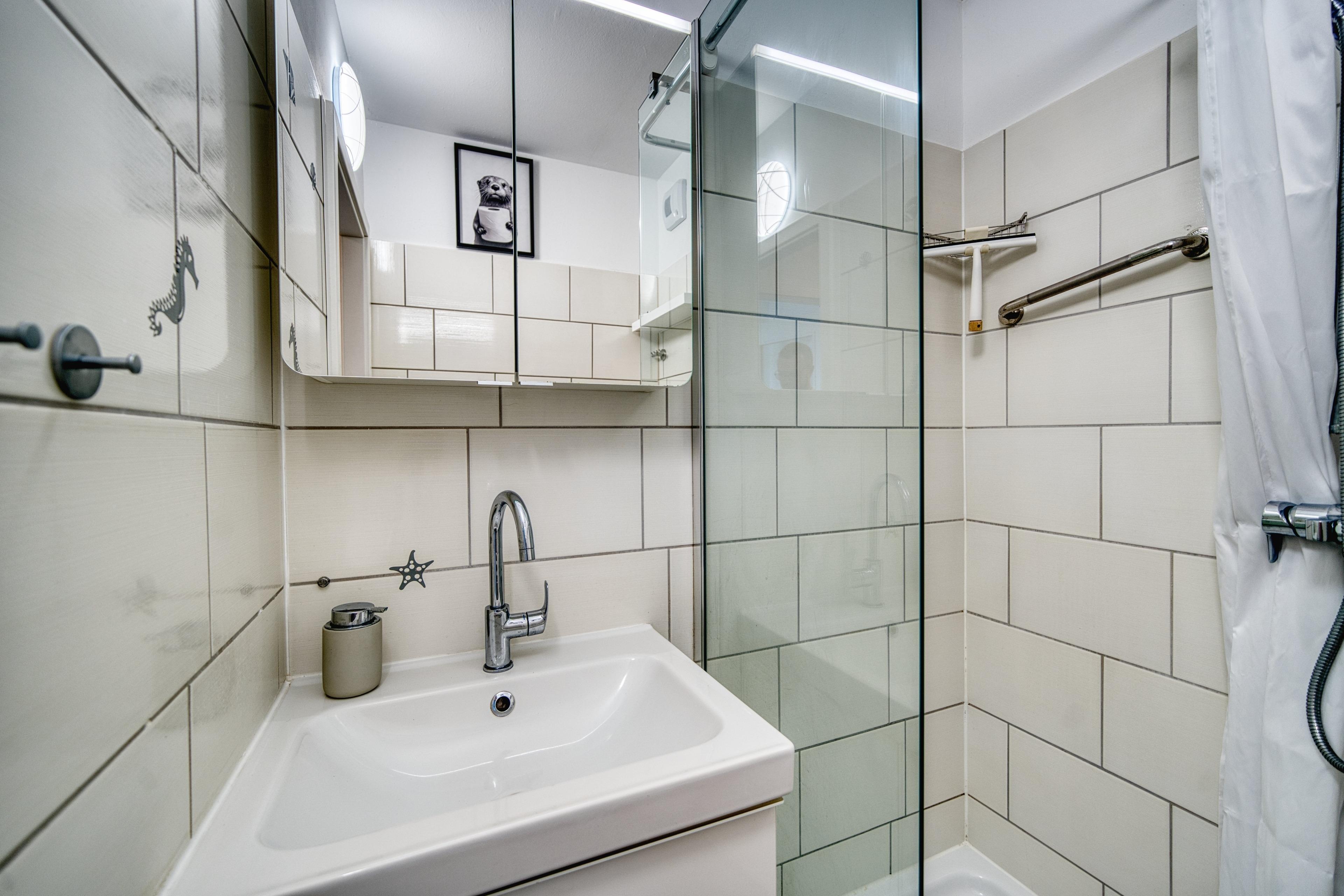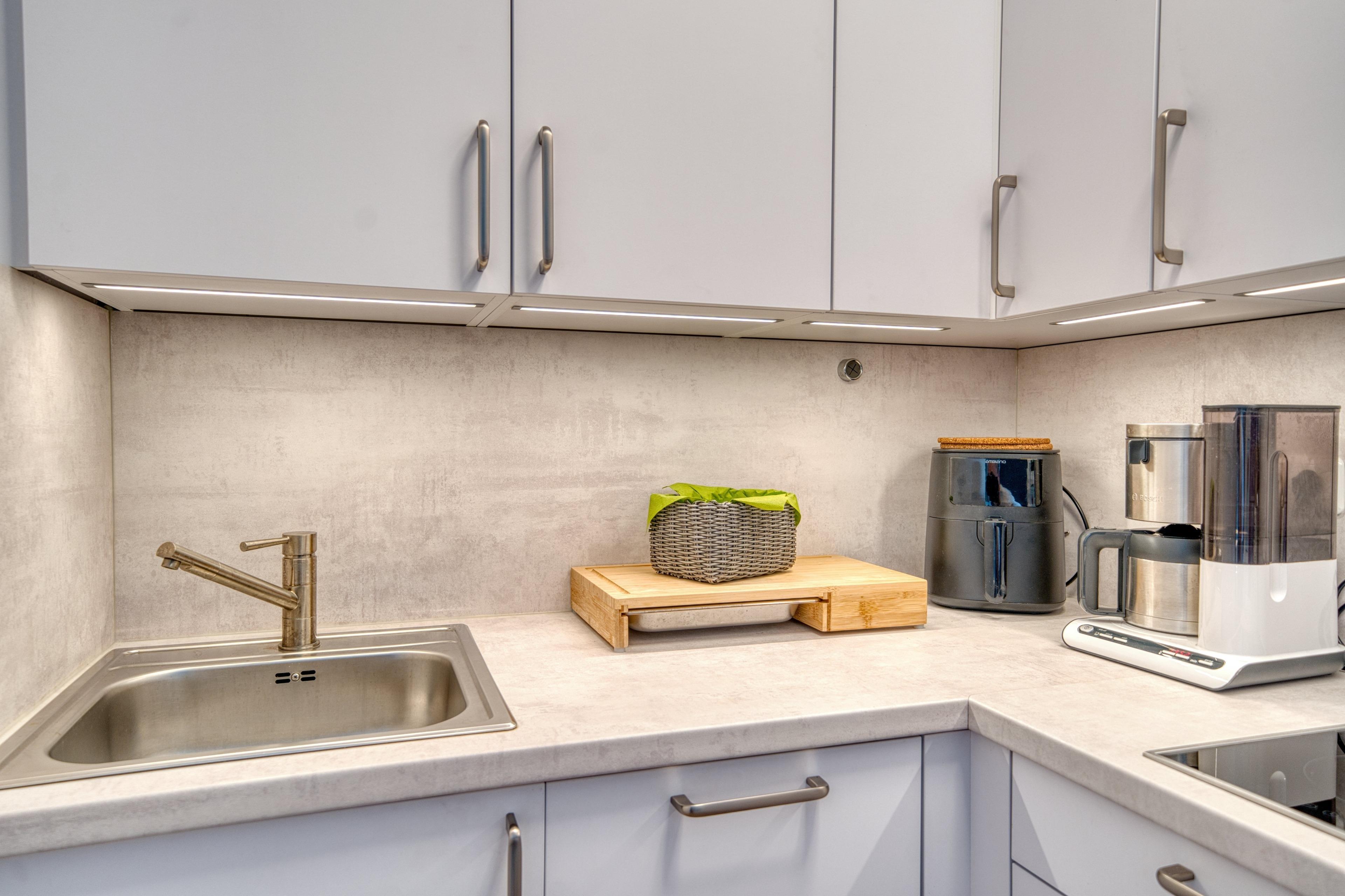 Die moderne Küche ist komplett ausgestattet mit Kühlschrank, 2-Platten-Ceranfeld, Mikrowelle mit Grill-/Backfunktion, Heißluftfritteuse, Kaffeemaschine und Toaster. Das neue Bad bietet Dusche mit Glasfront und WC. Alle Räume sind mit hochwertigem Vinylboden ausgestattet und hell gestaltet. Nichtraucherwohnung, keine Haustiere.