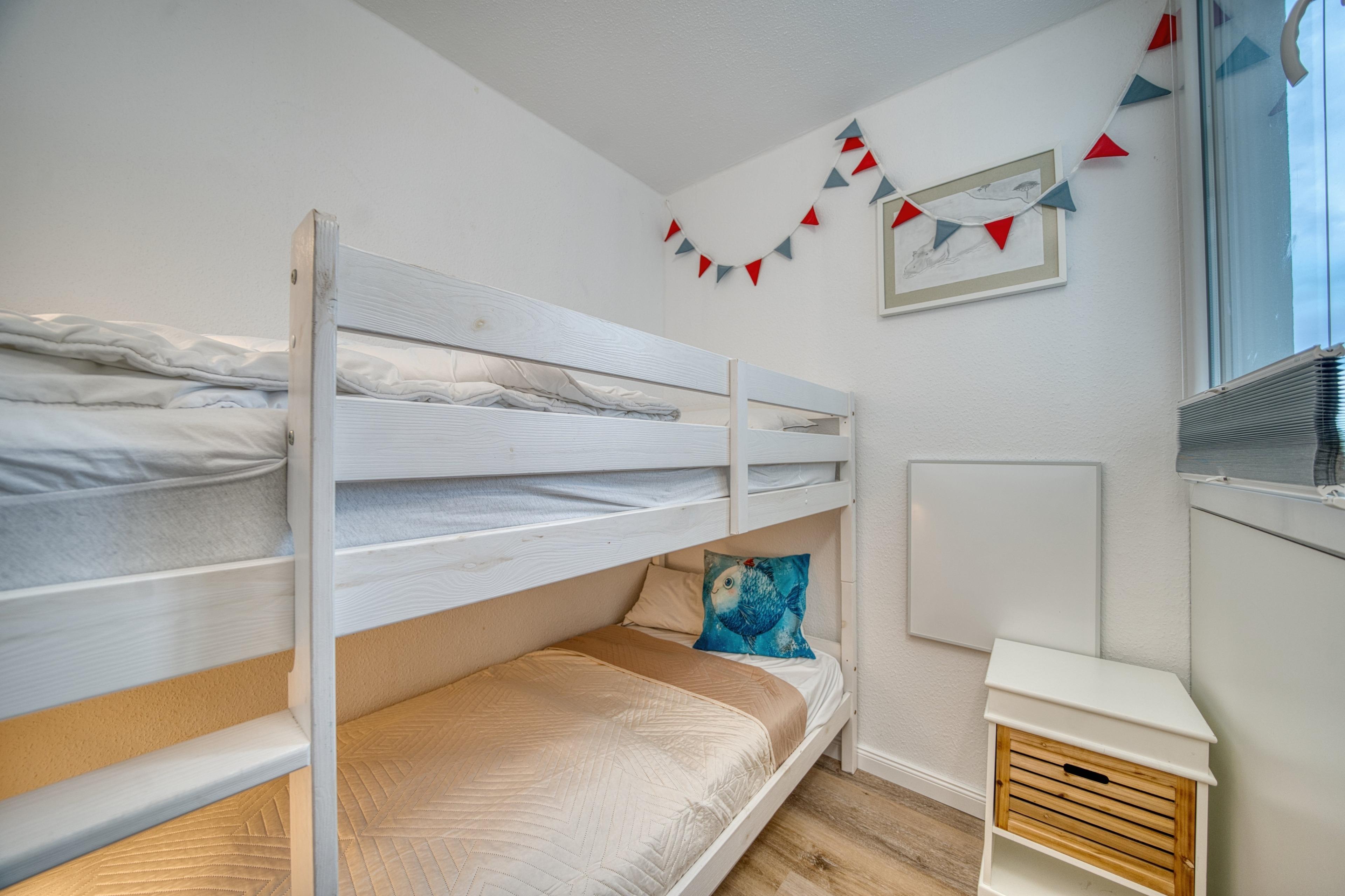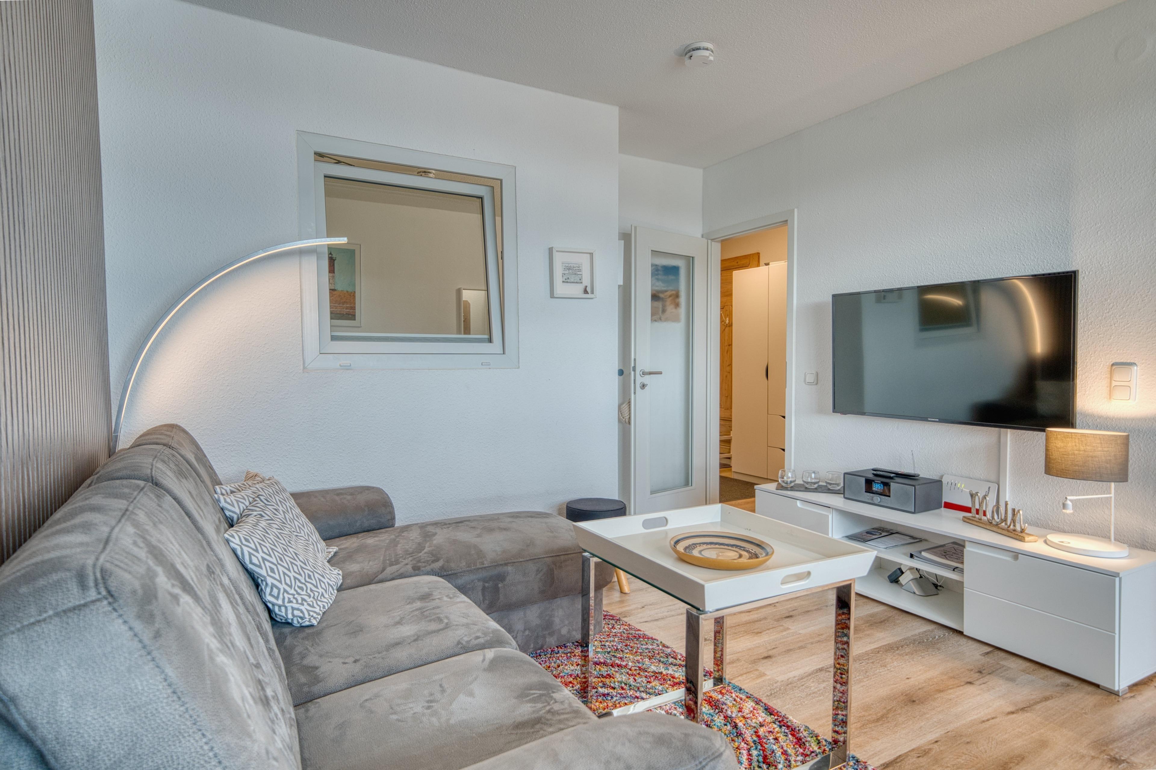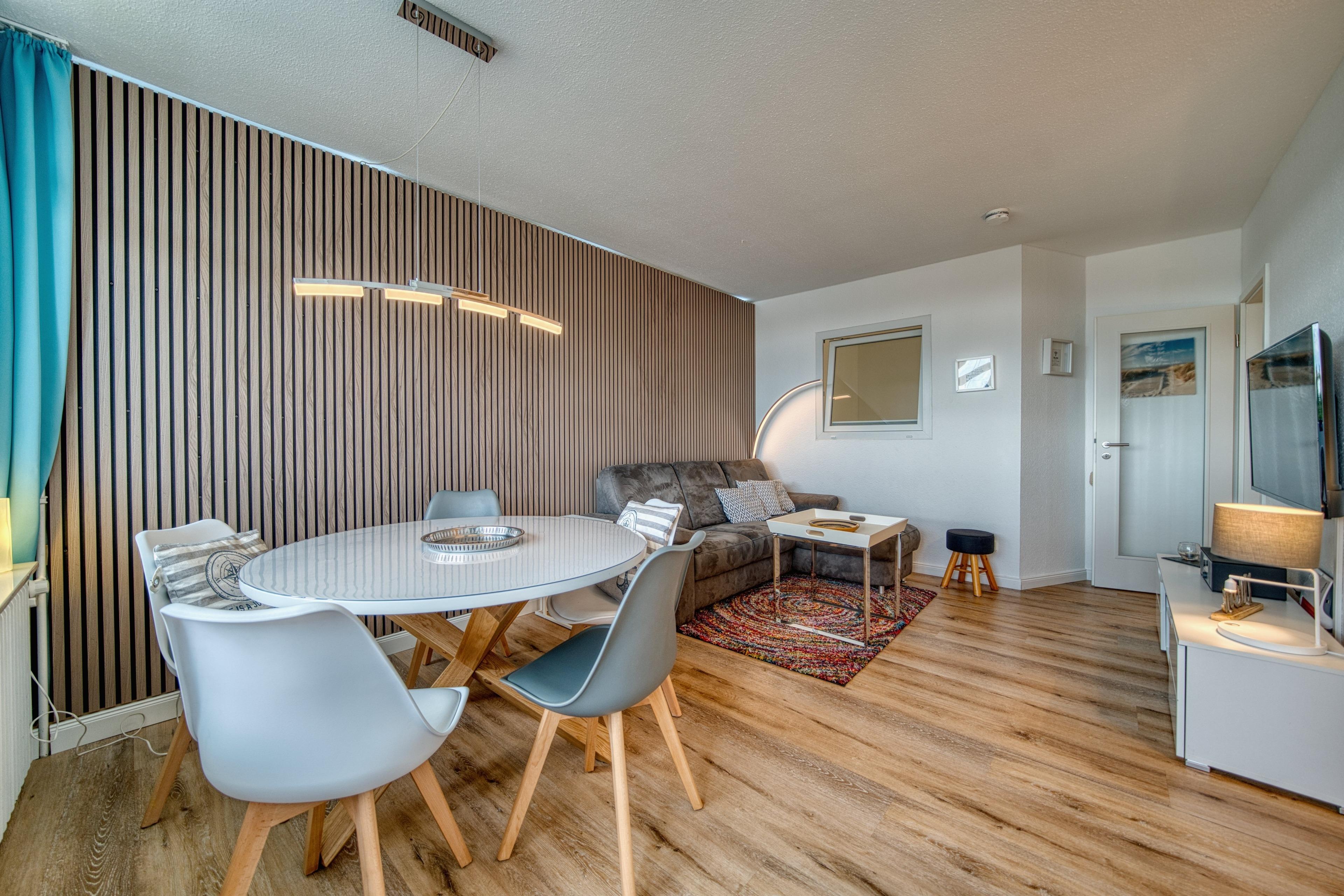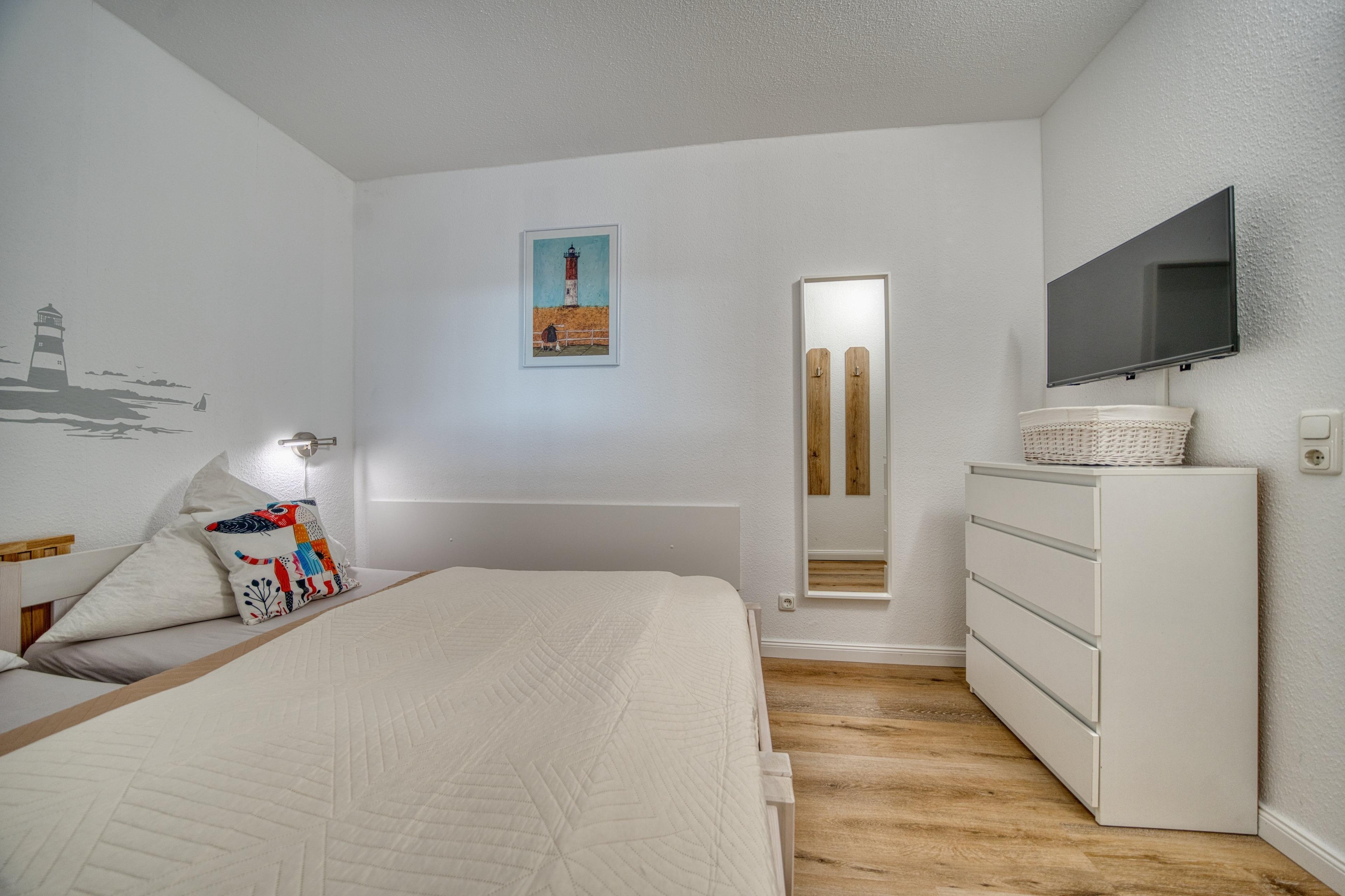 Die Wohnung verfügt über ein Wohn- und Esszimmer mit TV und kostenfreiem WLAN, ein separates Elternschlafzimmer mit Doppelbett (Einzelbetten kombinierbar) und zusätzlichem Fernseher sowie ein Kinderzimmer mit Hochbett und Fenster.