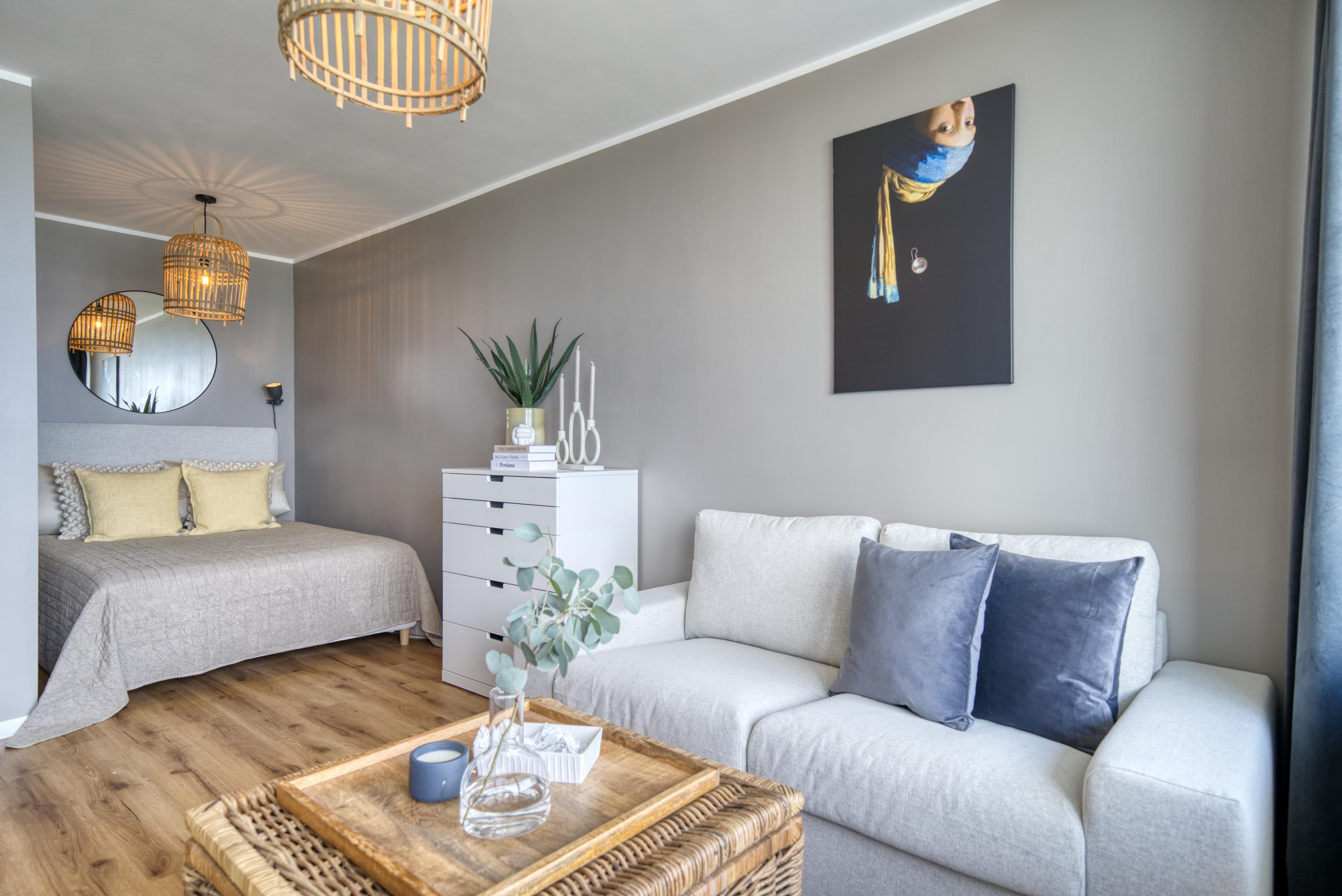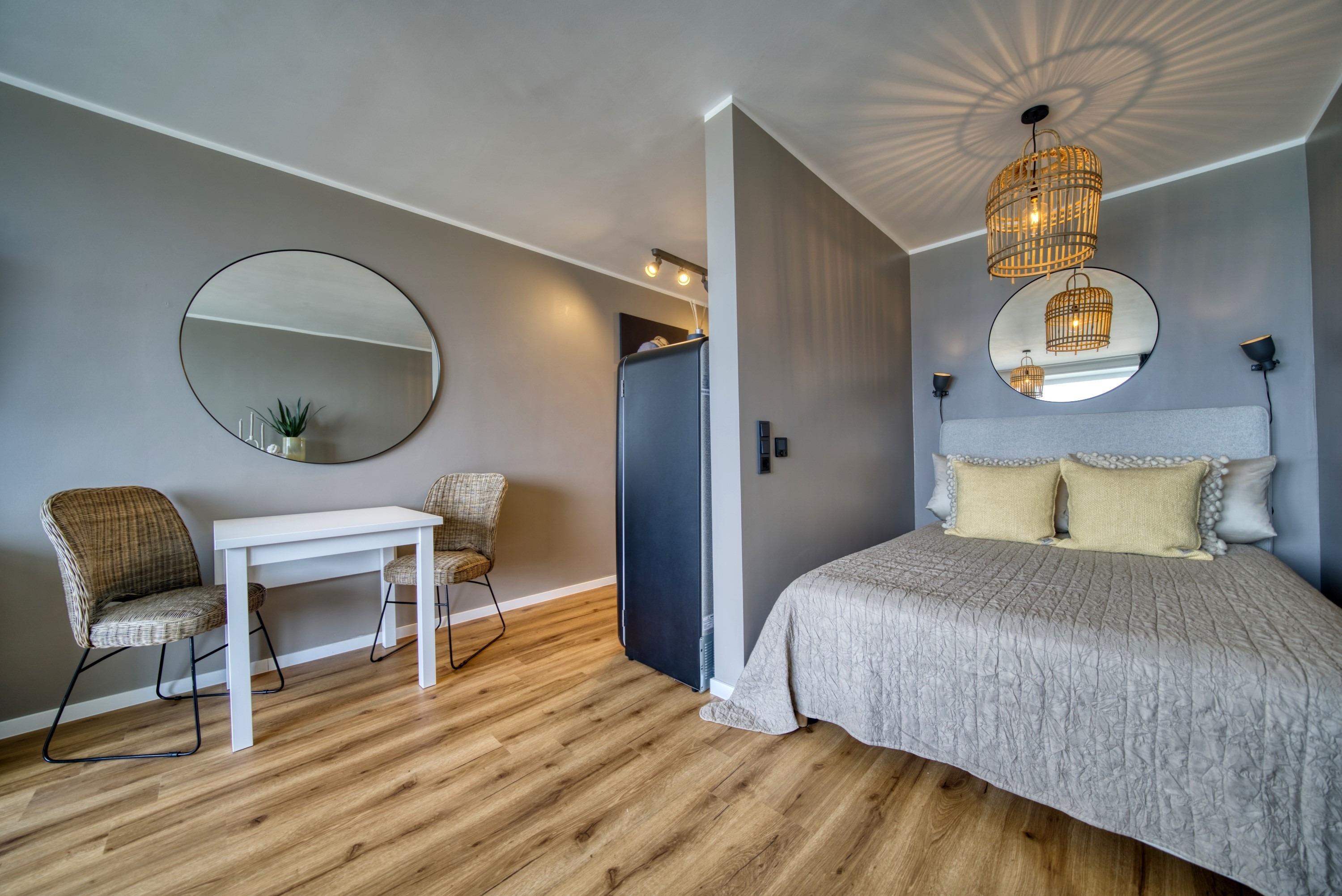 Es erwartet Sie ein offener Schlafbereich, ausgestattet mit einem Doppelbett (140x200cm) sowie einer gemütlichen Schlafcouch, welche zum Doppelbett ausklappbar ist. Somit ist es möglich, das Appartement mit bis zu 4 Personen (2 Erwachsene und 2 Kindern) zu belegen. In der kalten Jahreszeit darf man sich, dank der Fußbodenheizung, auf warme Temperaturen und Füße freuen.