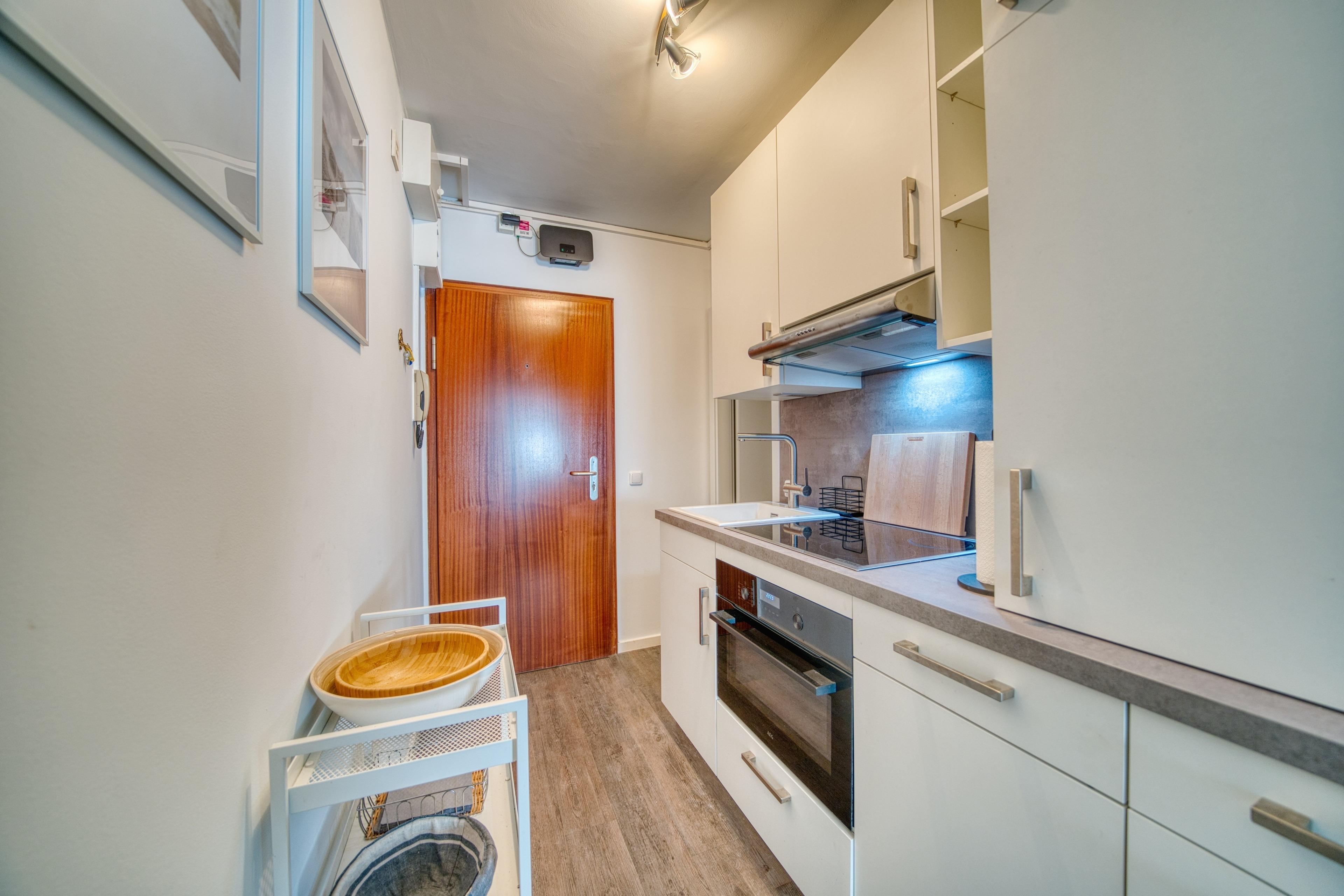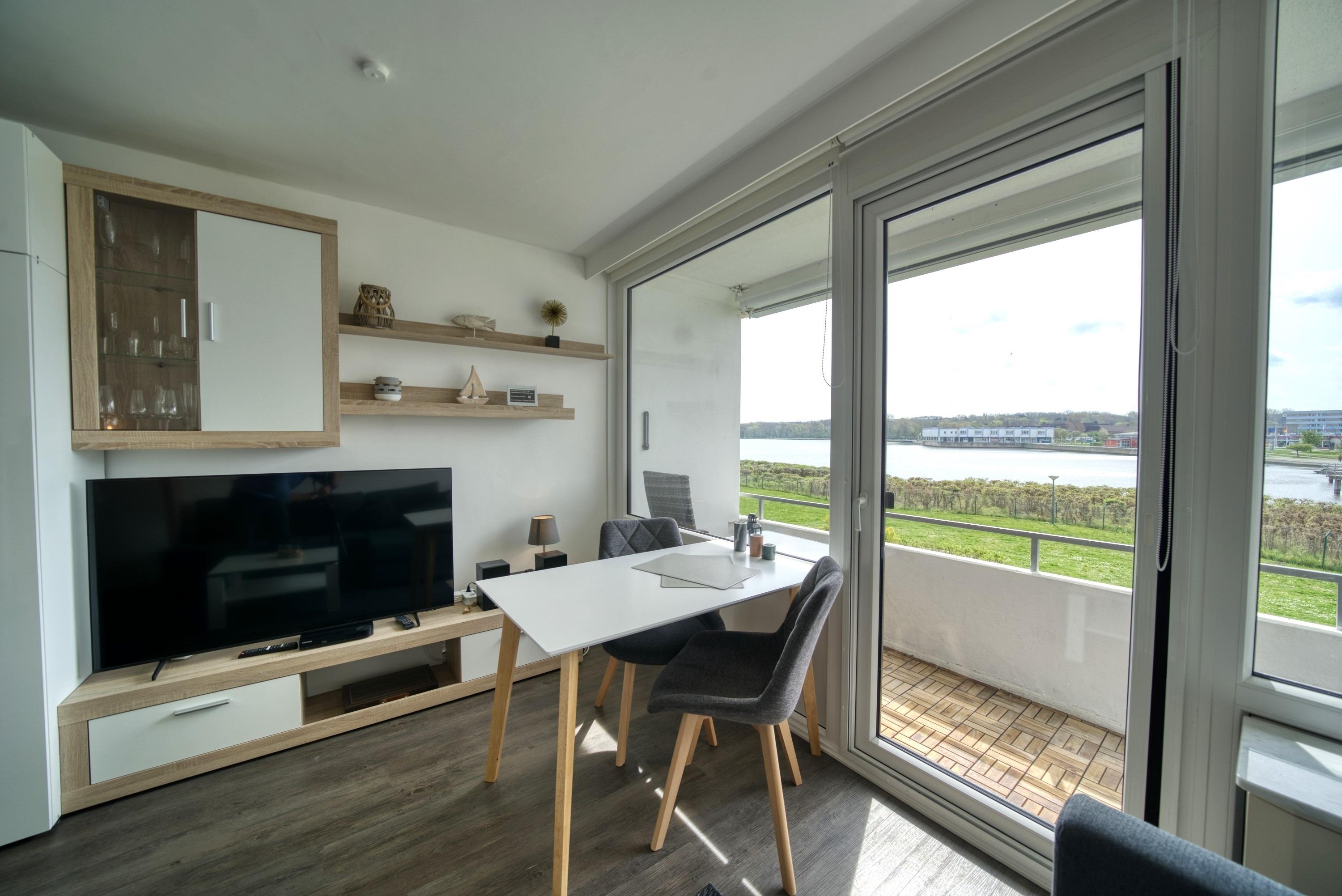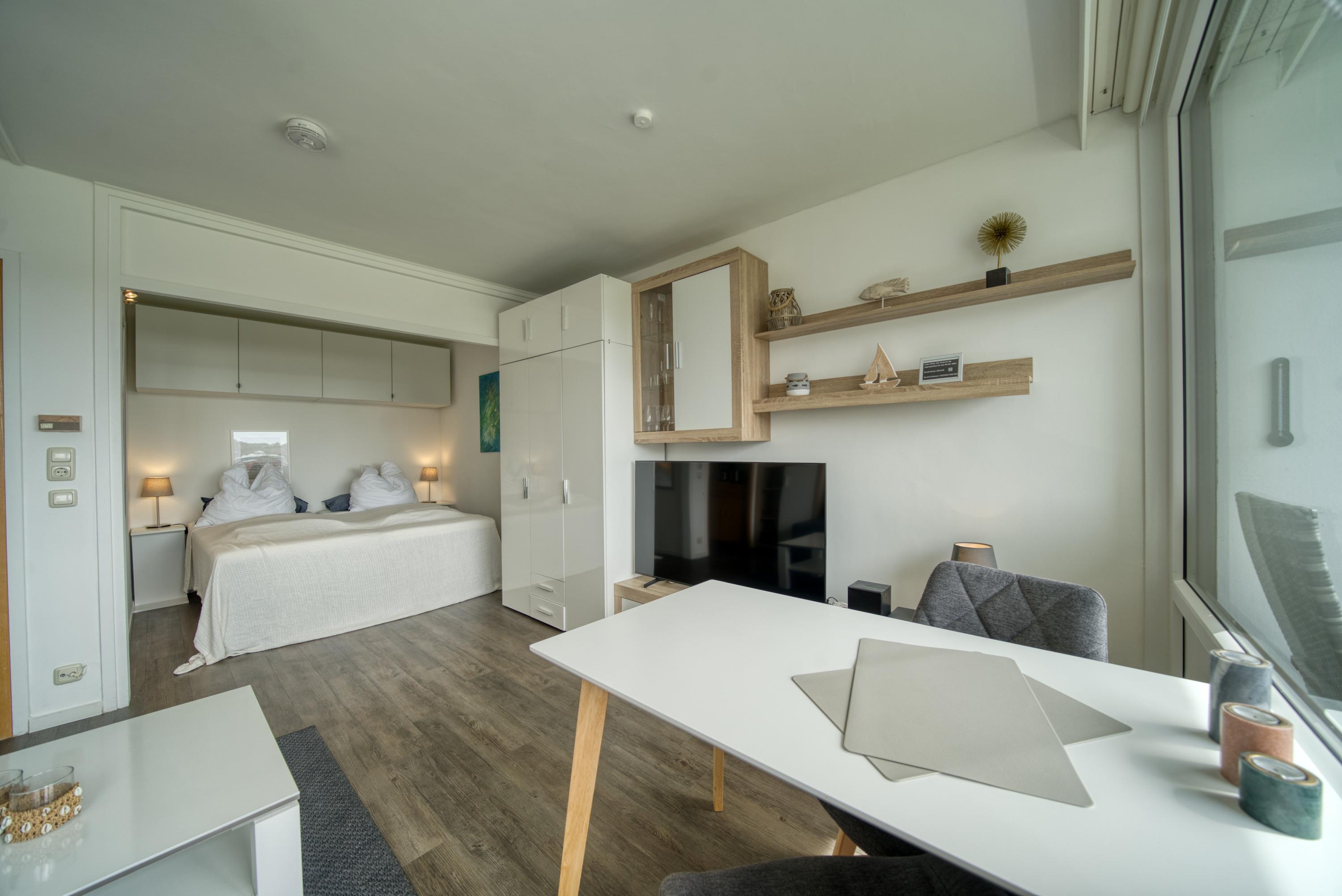 Wohn-/Schlafbereich mit Couch, Doppelbett und Kabel-Flat-TV. Küchenzeile mit allen wichtigen Geräten. Modernes Duschbad. Balkon mit Sonnenmarkise. Nichtraucherwohnung, keine Haustiere. Eigener Pkw-Stellplatz und gemeinschaftlicher Fahrradkeller im Haus. Strand nur ca. 10?m entfernt, Ferienpark mit Läden, Restaurants und Freizeiteinrichtungen ca. 5 Gehminuten. Ideal für entspannte Tage am Binnensee.