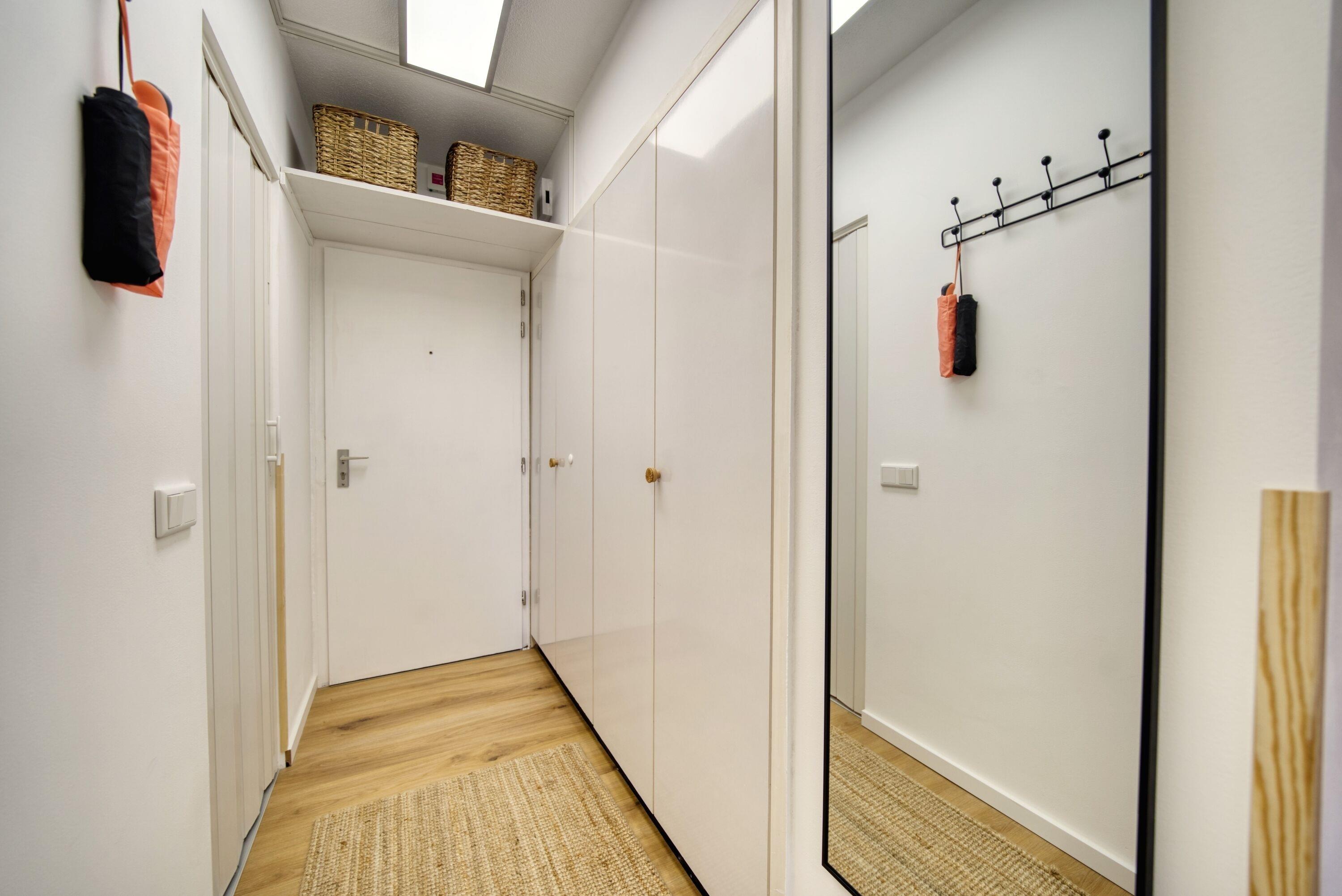 Etage, Wohn-/Schlafbereich mit Sofa und TV, Schlafzimmer mit Doppelbett, separates Kinderzimmer. Voll ausgestattete Küche, Bad mit Dusche/WC, Balkon mit Markise und Panoramablick. WLAN, Fahrradkeller und Parkplatz inklusive. Nichtraucherwohnung, Haustiere willkommen, Strand ca. 10?m. Ideal für Familien und Paare.
