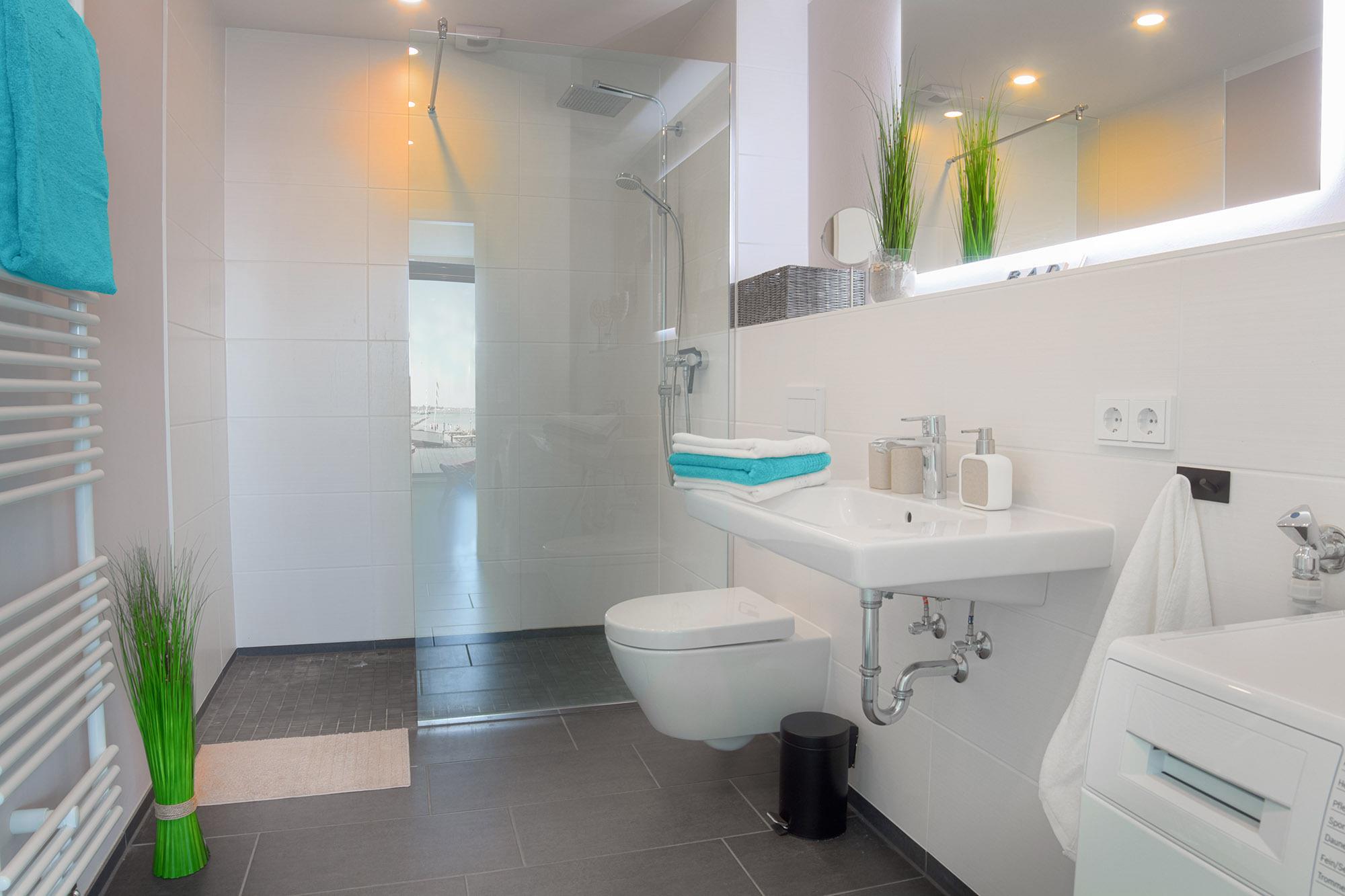 Das stilvolle Badezimmer mit ebenerdiger Dusche, Handtuchwärmer und hochwertigen Armaturen sorgt für Entspannung nach einem erlebnisreichen Tag. Für noch mehr Wohlbefinden steht Ihnen eine Infrarot-Sauna für zwei Personen zur Verfügung – ideal, um sich nach einem langen Spaziergang an der frischen Ostseeluft wohltuend aufzuwärmen. Ein separates Gäste-WC im oberen Geschoss bietet zusätzlichen Komfort.