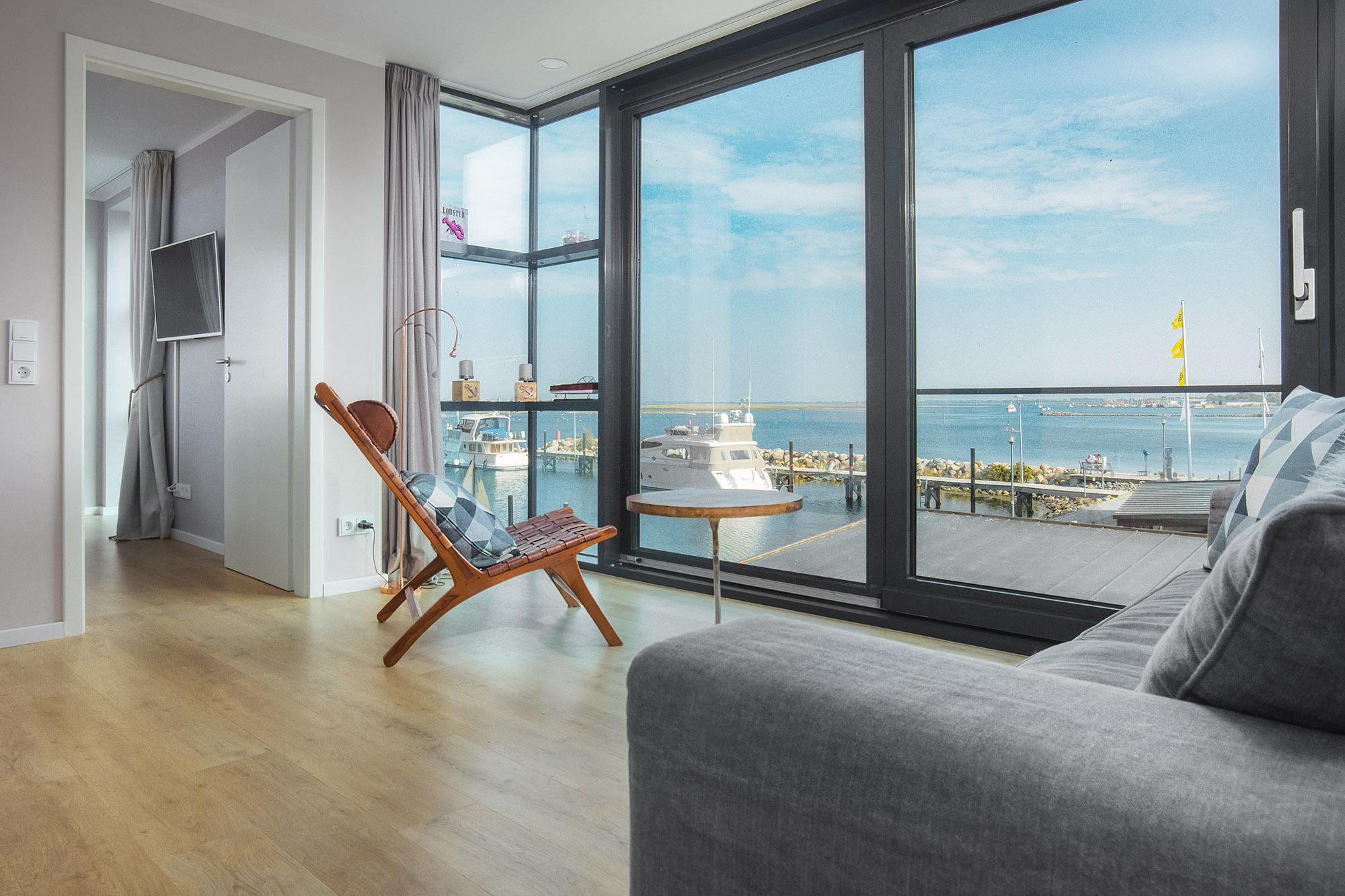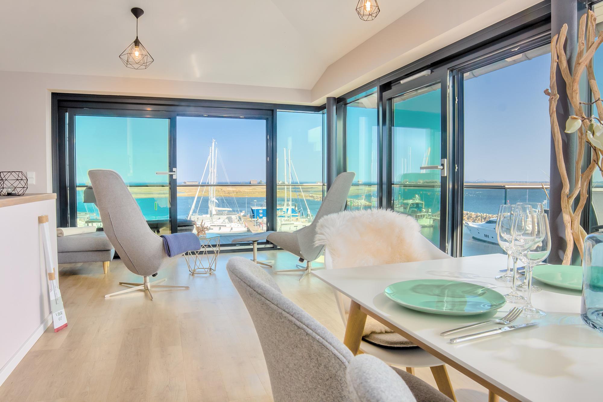 Der lichtdurchflutete Wohnbereich besticht durch moderne Eleganz und eine hochwertige Ausstattung. Großzügige Fensterfronten sorgen für ein offenes Wohngefühl und lassen den Blick über das glitzernde Wasser und die ein- und auslaufenden Jachten schweifen – eine Kulisse, die pure Urlaubsatmosphäre verspricht. Die stilvolle Möblierung mit bequemer Couch, Liegestühlen und großem TV lädt zum Entspannen ein, während WLAN für erstklassige digitale Unterhaltung sorgt. Direkt angrenzend befindet sich der Essbereich, der mit seiner atemberaubenden Aussicht zum Verweilen einlädt. Die offene, voll ausgestattete Küche bietet Ihnen alles, was Sie für kulinarische Genüsse benötigen – ob gemeinsames Frühstück bei Sonnenaufgang oder ein gemütliches Dinner mit Blick auf die Ostsee.
