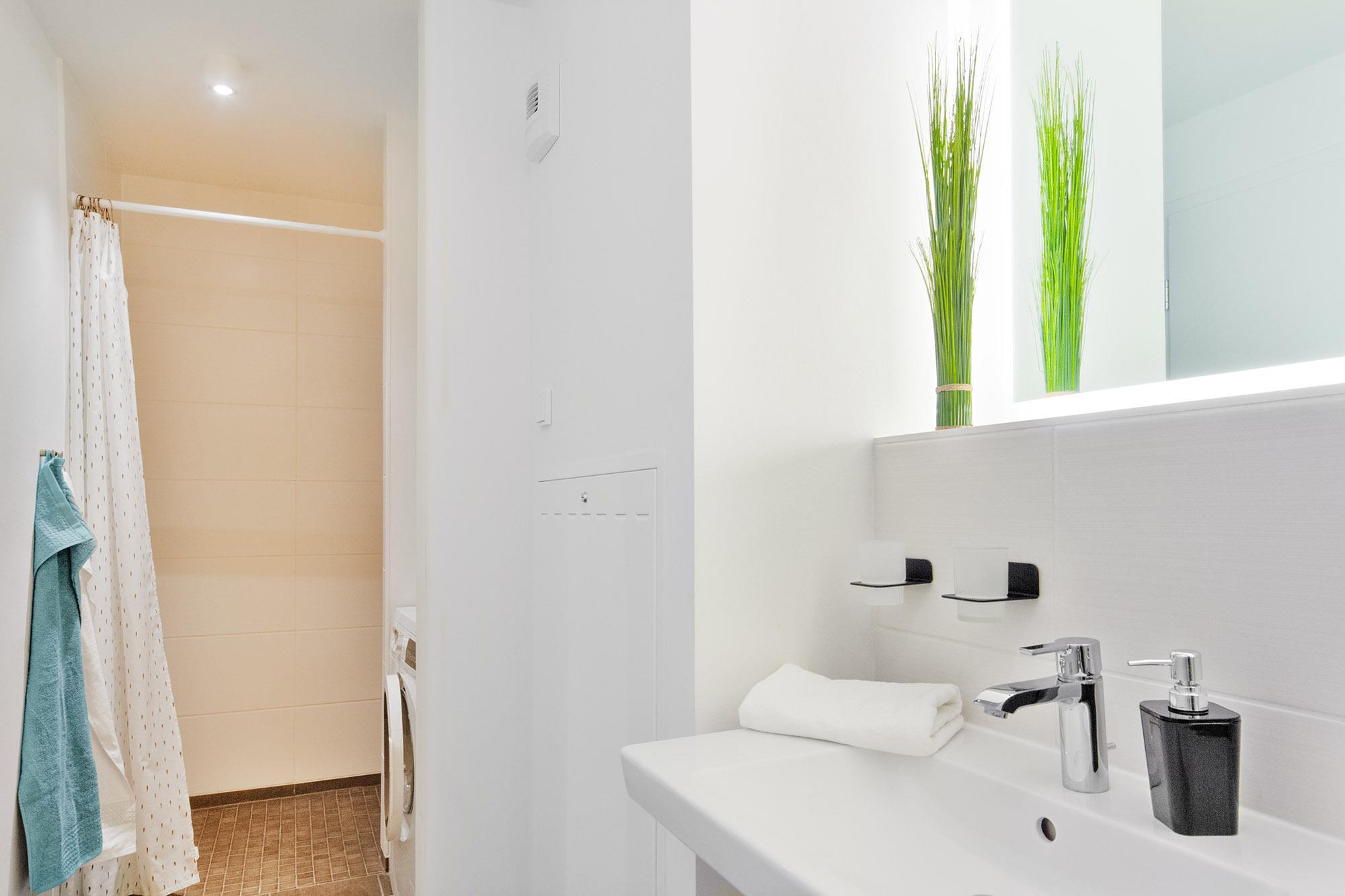 Das elegante Badezimmer mit ebenerdiger Dusche und hochwertigen Details bietet viel Komfort, während ein zusätzliches Gäste-WC für noch mehr Bequemlichkeit sorgt. Eine eigene Waschmaschine steht Ihnen ebenfalls zur Verfügung.