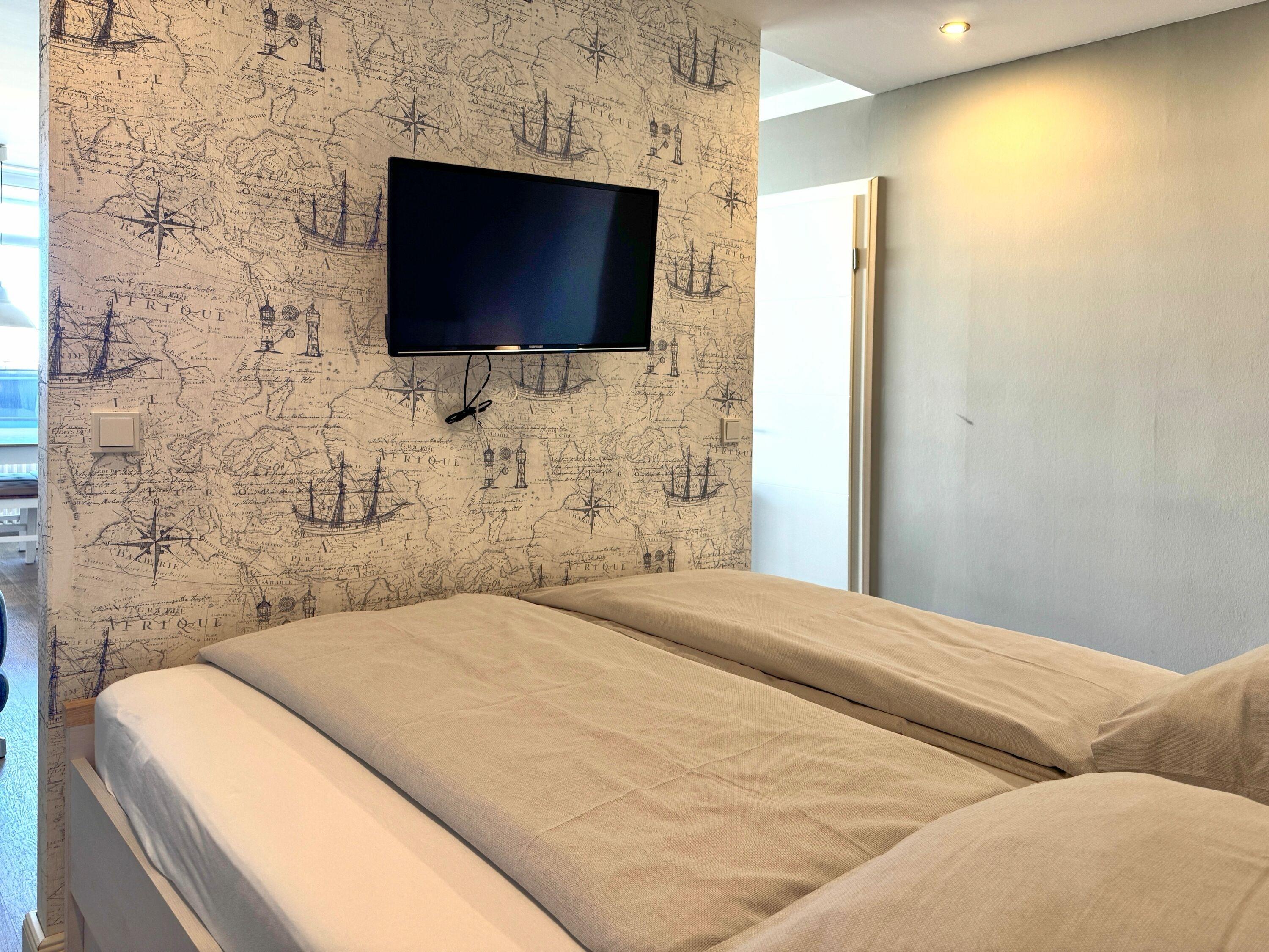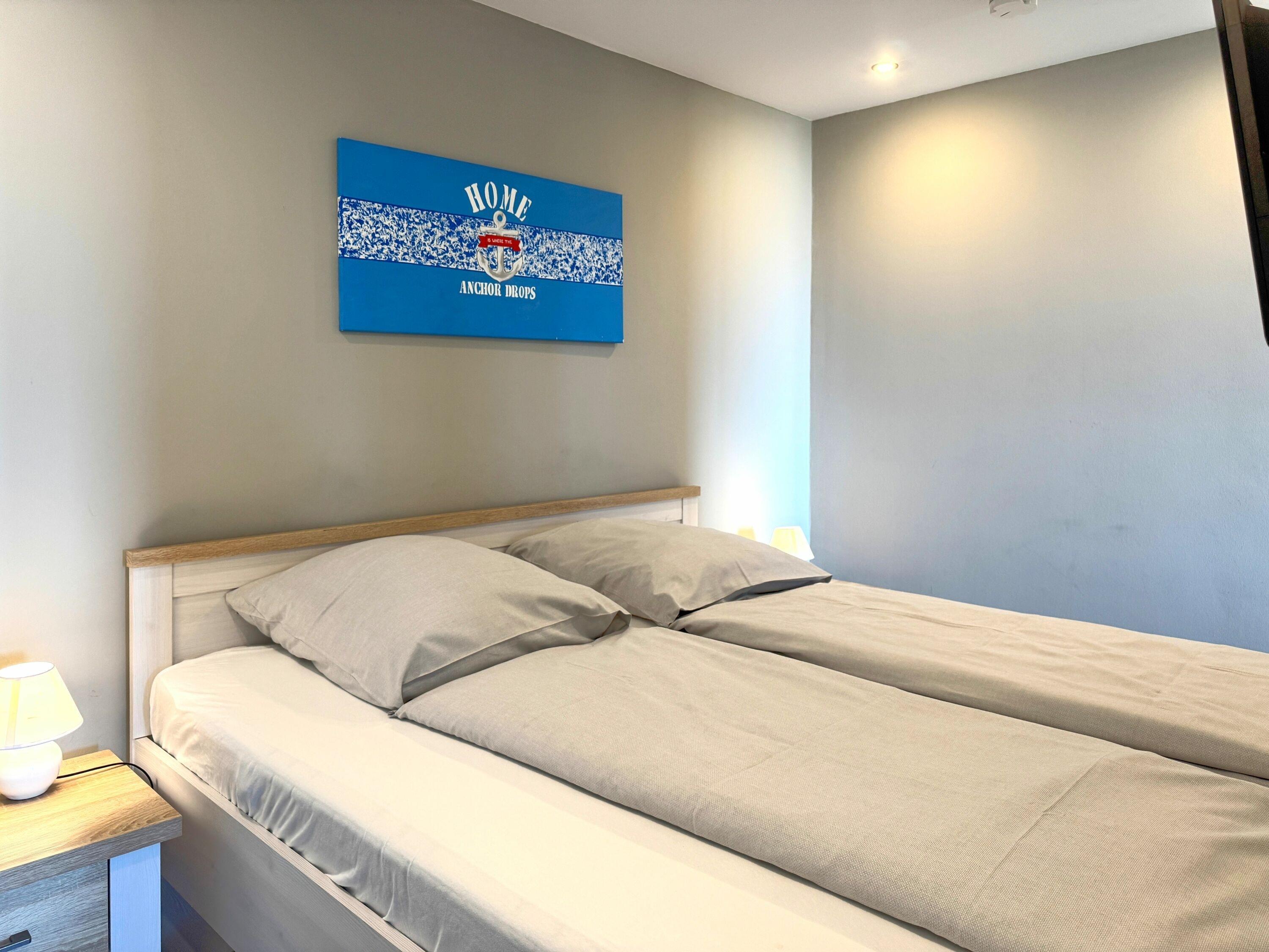 Der kombinierte Wohn- und Schlafraum ist hell gestaltet und bietet eine angenehme Urlaubsatmosphäre. Ein komfortables Doppelbett (180x200) sorgt für erholsame Nächte. Zusätzlich steht ein Schlafsofa (140x200) zur Verfügung, das sich ideal für eine weitere Person oder ein Kind eignet. Verdunklungsvorhänge ermöglichen auch tagsüber Ruhe und Privatsphäre.