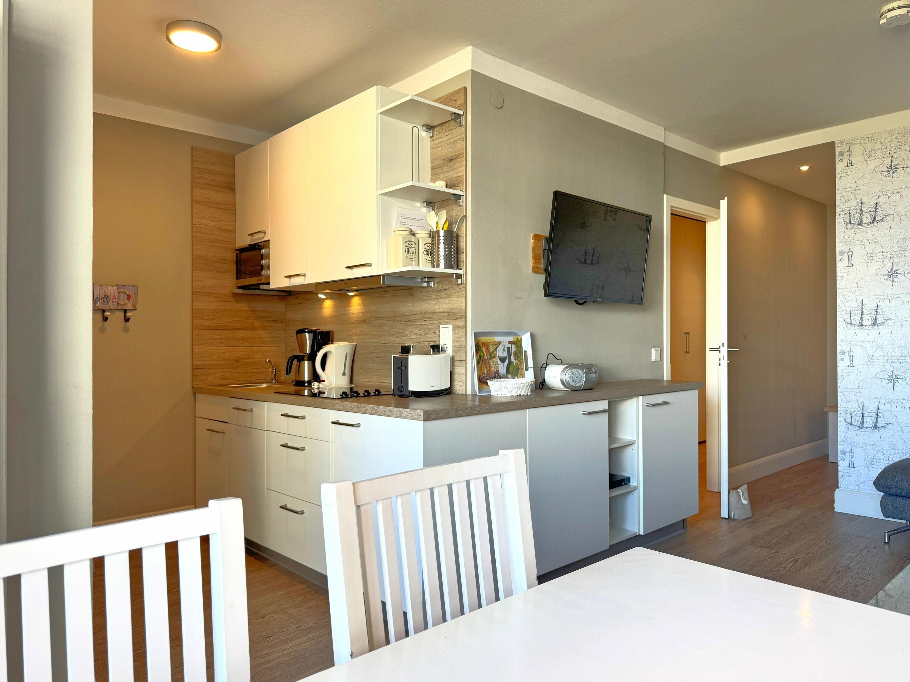 Die Küche ist praktisch und gut ausgestattet. Hier finden Sie ein Cerankochfeld, eine Spülmaschine, einen Kühlschrank mit Gefrierfach sowie Kaffeemaschine, Toaster und Wasserkocher, sodass Sie sich auch im Urlaub bequem selbst versorgen können.