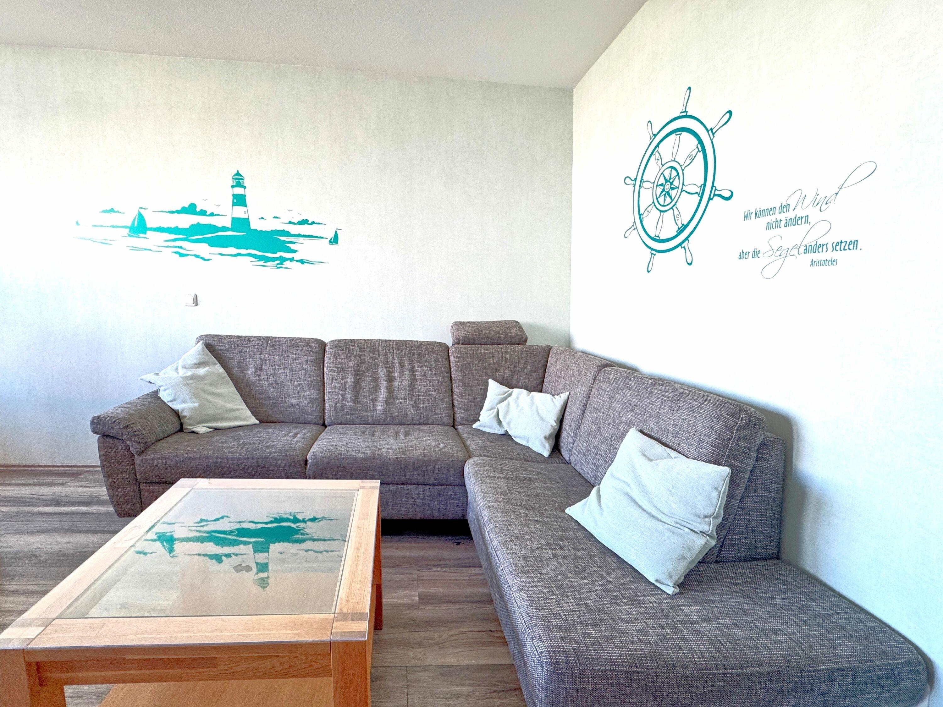 Der Wohnraum ist Ihr zentraler Rückzugsort, ausgestattet mit einer bequemen Couchgarnitur und einem TV, die zum Entspannen und gemeinsamen Spielen einladen. Hier können Sie nach einem aufregenden Tag am Strand oder im Aktiv Hus gemütliche Filme schauen oder einfach die Seele baumeln lassen.
