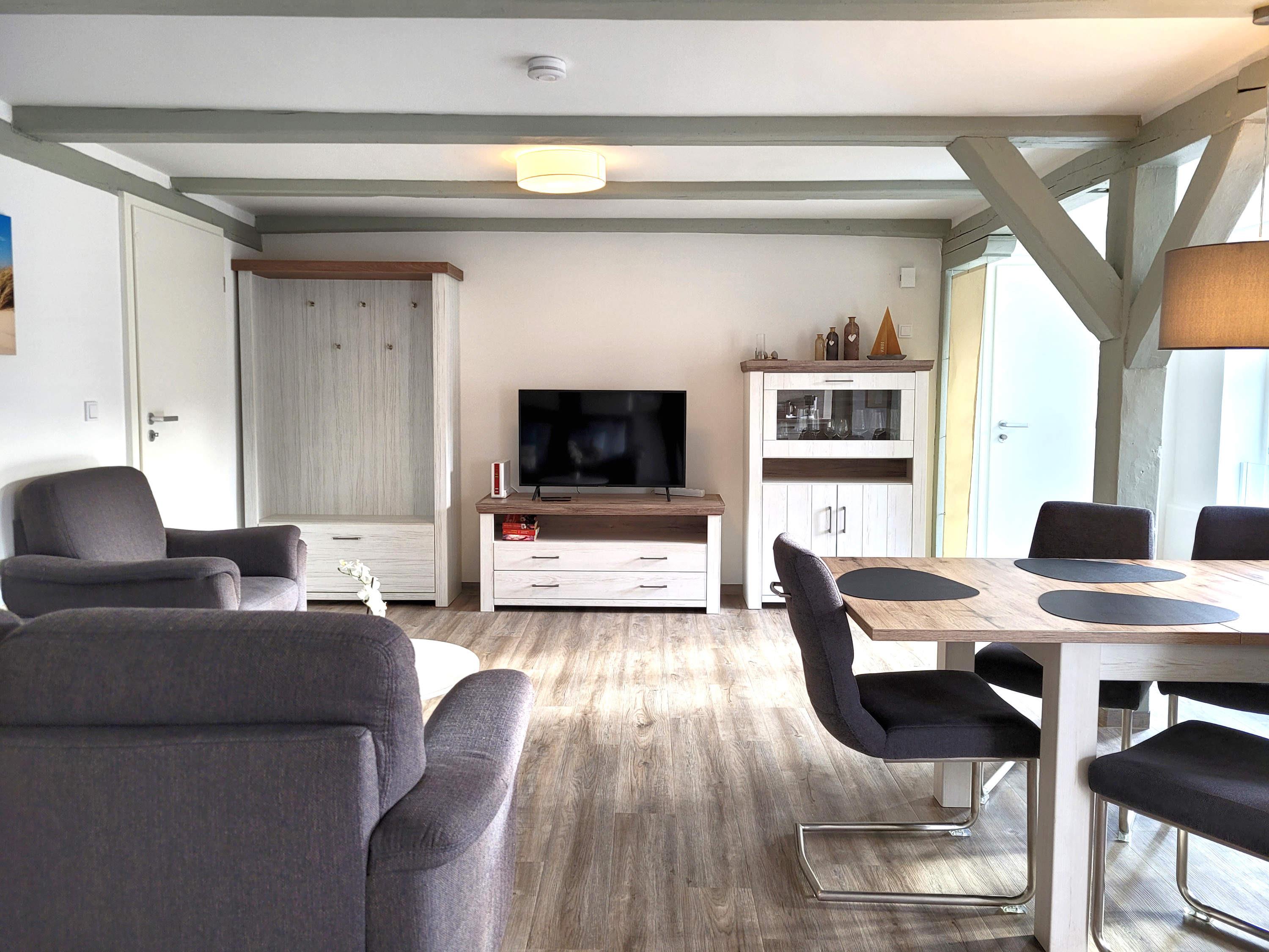 Der geschmackvolle Wohnbereich ist offen gestaltet und mit einer gemütlichen Couch, Smart-TV und WLAN für Unterhaltung ausgestattet. Große Fenster sorgen für viel Tageslicht und bieten vom Sofa aus einen direkten Blick ins Fischerdorf Heiligenhafen.