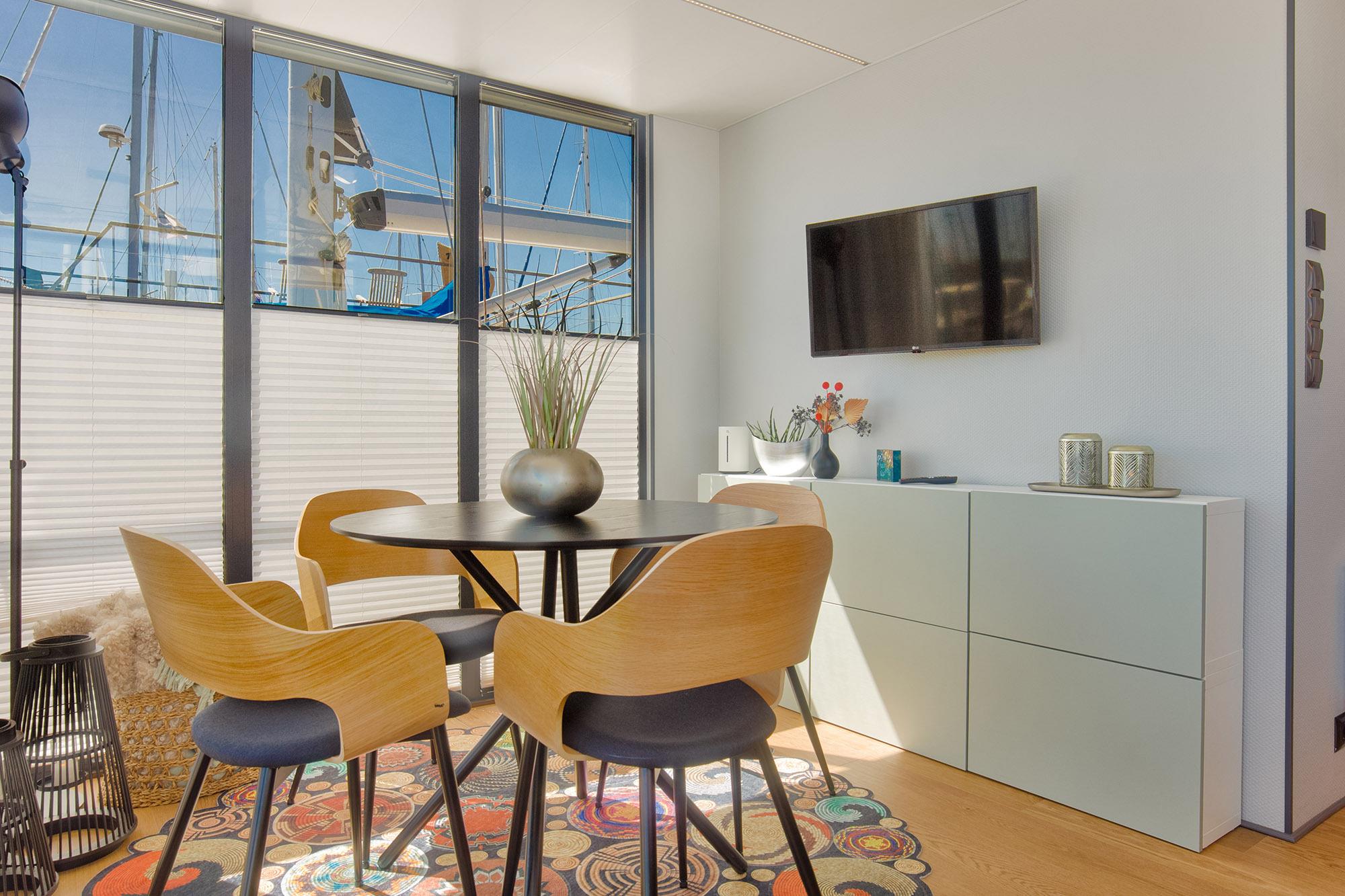 Zur weiteren Gemütlichkeit verfügt das Hausboot selbstverständlich über eine Heizung und teilweise auch Fussbodenheizung. Der vielseitige Essbereich und die offene Küchenzeile mit Induktions-Kochfeld (2 Platten) stehen zur kulinarischen Entfaltung bereit. Dabei müssen Sie auf Ausblick nicht verzichten.
