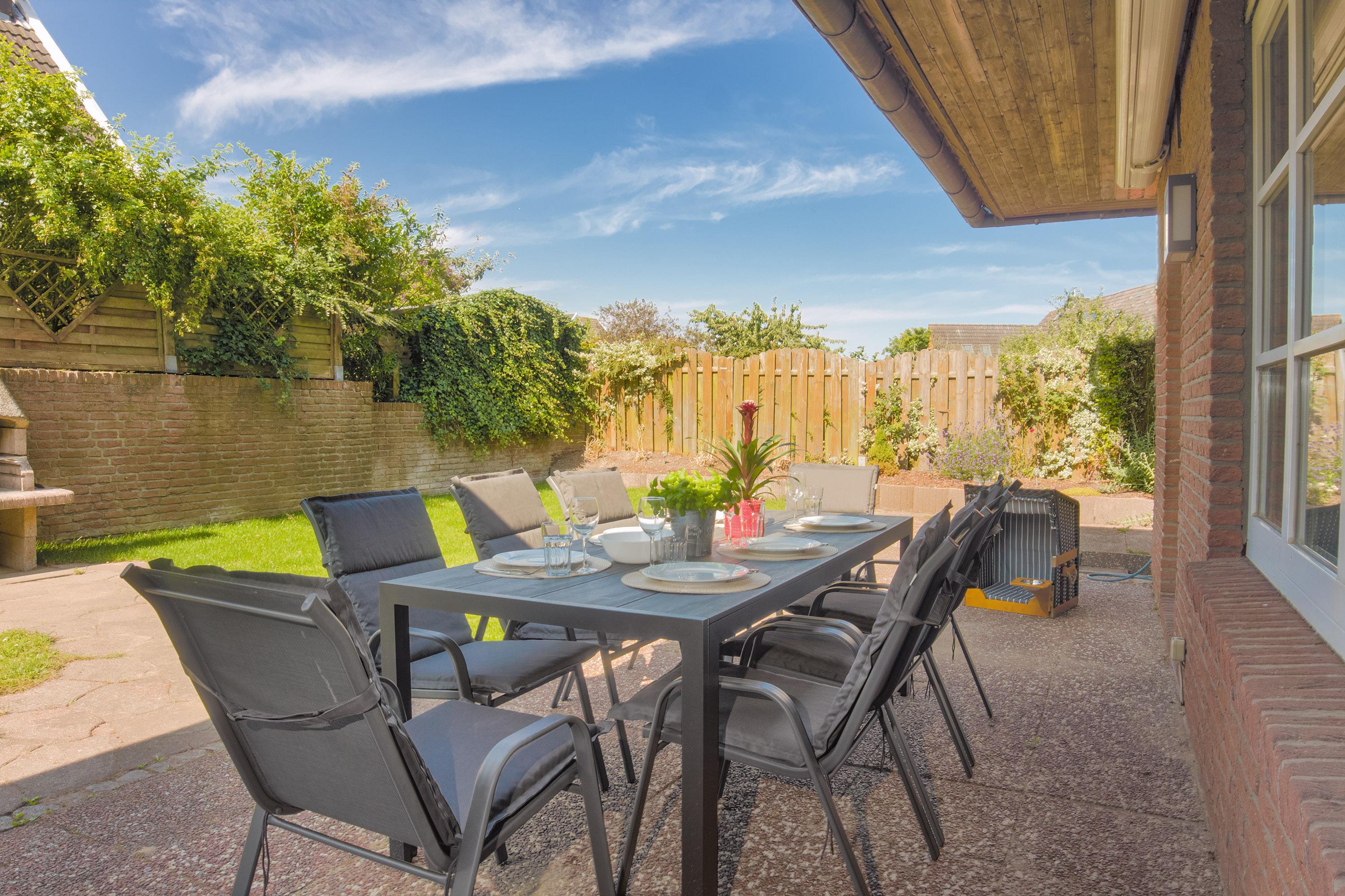 Herzstück ist der einladende Wohn- und Essbereich. Hier kann auf der gemütlichen Couch entspannt werden oder Sie genießen gesellige Stunden am großen Esstisch. Naturtöne und ausgewählte Dekorationen sorgen für ein wunderbar wohnliches Gefühl. Durch die großen Fenster haben Sie dabei einen großzügigen Blick in den Gartenbereich. Unterhaltung bietet Streaming-TV (WaipuTV) und mit dem WLAN / WiFi können Sie auch im Urlaub bequem online bleiben.