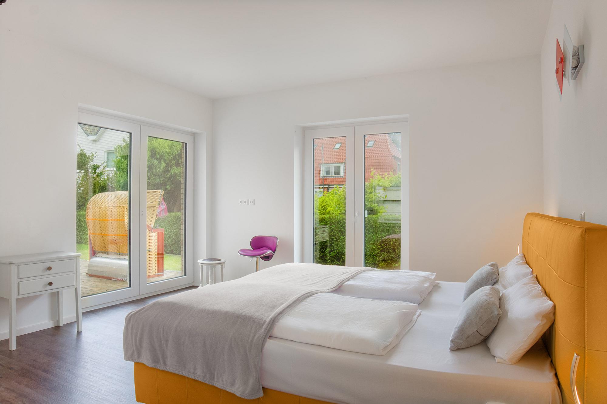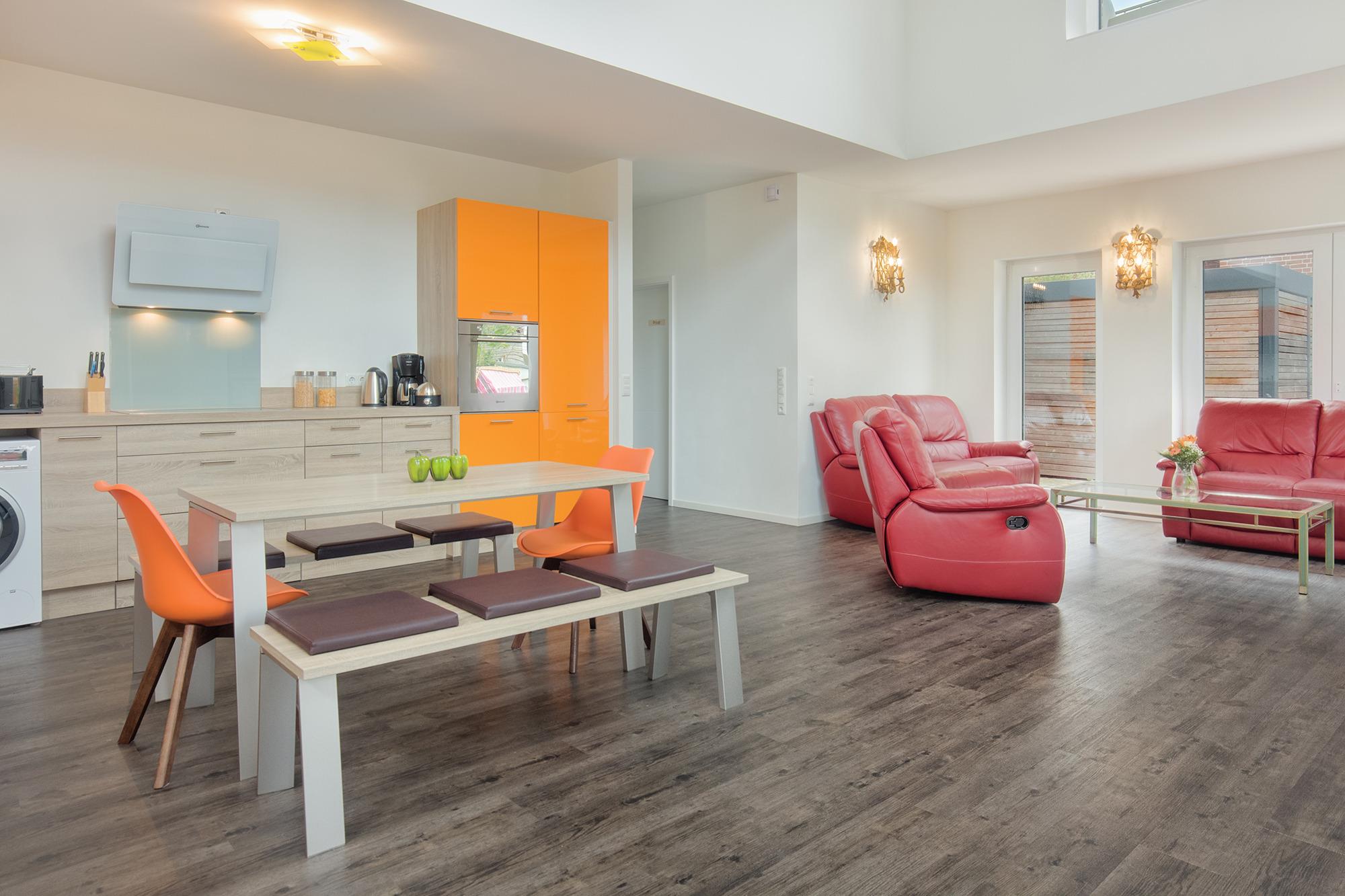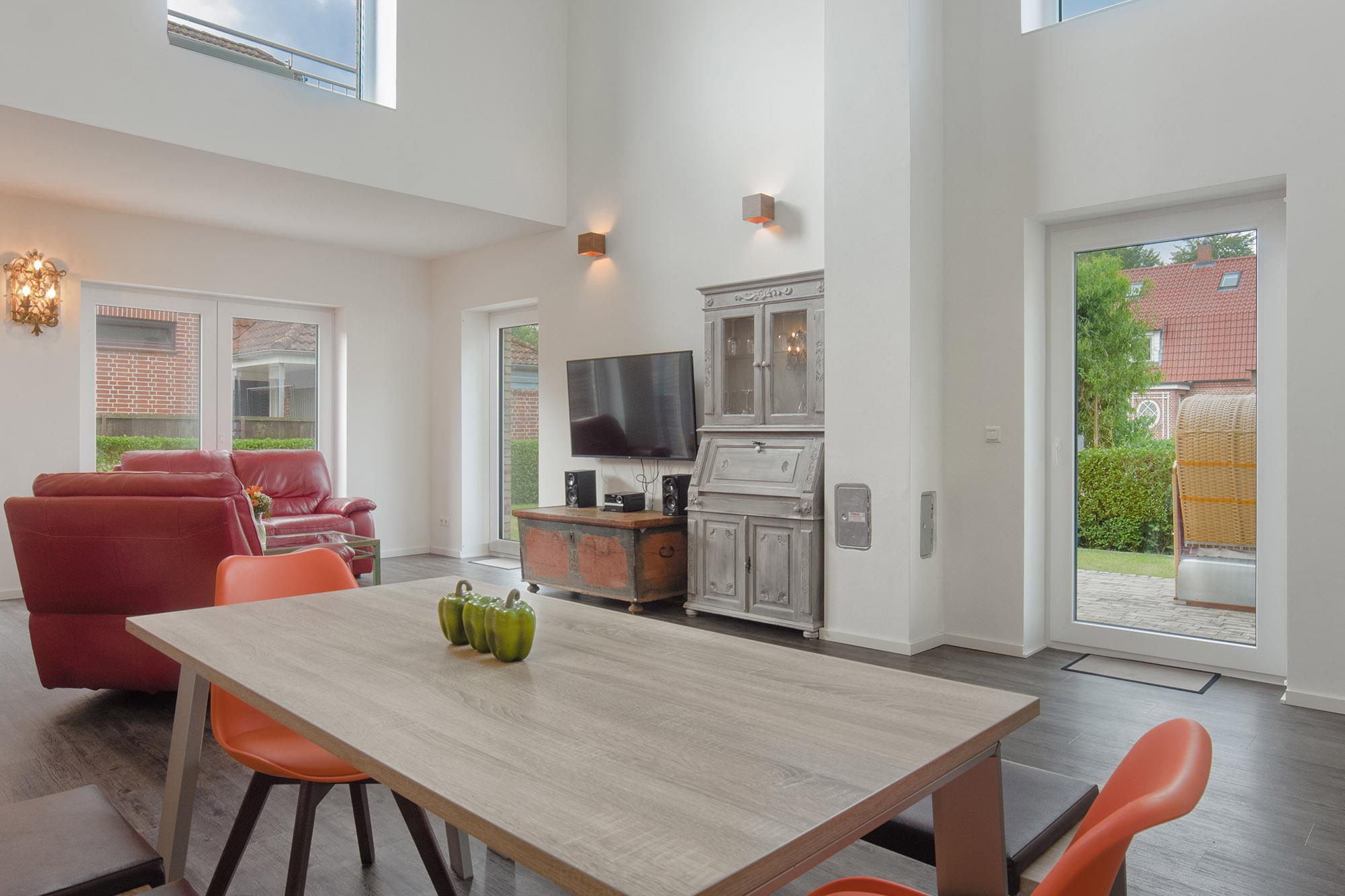 Das neue und topmoderne Ferienhaus "Kehrwieder No.5" bietet sehr viel Platz auf ca. 158m² Wohnfläche und ist besonders für Familien, Allergiker oder Zweisamkeit-Suchende interessant. Der Wohnbereich strahlt die gehobene Atmosphäre zur Entspannung mit Relax-Ledercouchs und Fernsehsessel geradezu aus. Dabei lässt sich Gemütlichkeit bei HD-SmartTV oder WLAN-Nutzung leben. Kulinarisch steht Ihnen im ca. 60 m² großen und offenen Wohnküchen-Essbereich, mit offener Decke zum Obergeschoss, nichts im Wege. Dafür sorgt die hochwertige und voll ausgestattete Küche, die geradezu zum Kochen einlädt. Der große Esstisch mit zwei Sitzbänken und zwei Stühlen für mindestens 6 Personen schafft einen Treffpunkt für Ihren Aufenthalt. Hier lässt sich der Urlaub beim Essen bestens planen. Für die nächtliche Erholung stehen zwei Schlafzimmer im Erdgeschoss, sowie ein Schlafzimmer im Obergeschoss zur Verfügung. Die Schlafzimmer sind sämtlich mit Doppelboxspringbetten für den entsprechenden Liegekomfort und TV zum relaxten Einschlummern ausgestattet. Allergiker geeignete Bettwäsche und Handtücher sind gg. Gebühr möglich. Das große Schlafzimmer verfügt über einen begehbaren Kleiderschrank, sowie direkten Garten- und Badezimmerzugang. Ebenso erreichen Sie das Badezimmer vom gegenüberliegenden Schlaf-/Kinderzimmer. Die Schlafzimmer im EG sind mit Schiebetüren versehen und nicht abschließbar! Ein zusätzliches Gäste-WC im Erdgeschoss sorgt auch hier für die nötige Ungestörtheit. Über die Diele gelangen Sie ins Obergeschoss, wo sich weitere High-Lights des Hauses befinden. Über die fantastische Galerie im Obergeschoss erreichen sie die ca. 40 m² Nordterrasse mit Blick auf den Binnensee oder die ca. 20 m² Südterrasse mit Blick zum Kurpark oder zur Stadtkirche. Das dritte Schlafzimmer, sowie ein weiteres Duschbad mit Doppelwaschbecken und WC schaffen hier einen Rückzug für Wellness und Entspannung. Verdunklung ist in allen Zimmern über elektrische Rollläden möglich. Ein Baby-Reisebett und ein Hochstuhl können optional dazu gebucht werden. Vom Wohnbereich oder Schlafzimmer im Erdgeschoss geht es hinaus in den großzügigen Garten (ca. 350 m²) mit einer ca. 100 m² großen und möblierten Gartenterrasse in Südwest-Lage. Hier genießen Sie die Sonne in den zwei Liege-Strandkörben und relaxen nahezu perfekt. Auf abendliches Grillen müssen Sie ebenfalls nicht verzichten! Auf den Dachterrassen stehen Gartensessel zur weiteren Verfügung. Hier verleben Sie den Sonnenuntergang oder Abend bei einem herrlichen Glas Wein oder kühlem Getränk.